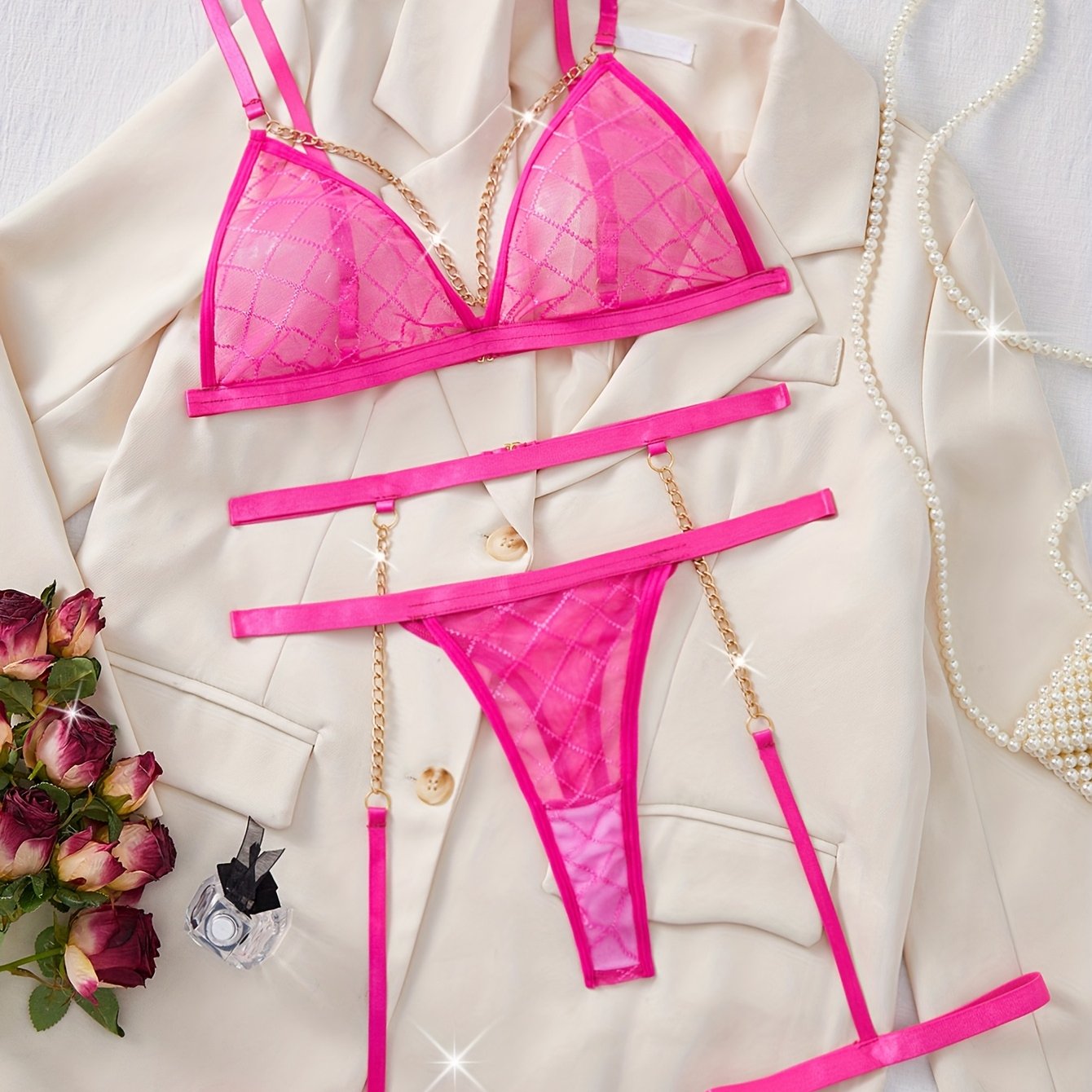 Комплект прозрачного сетчатого нижнего белья из 3 предметов с золотой цепочкой, включает в себя полупрозрачный бюстгальтер, стринги и пояс для чулок.