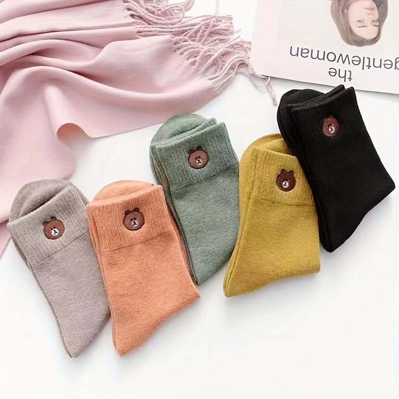 5 пар уютных и милых носок средней длины с медвежьей тематикой из однотонной вязаной ткани для тепла осенью и зимой.