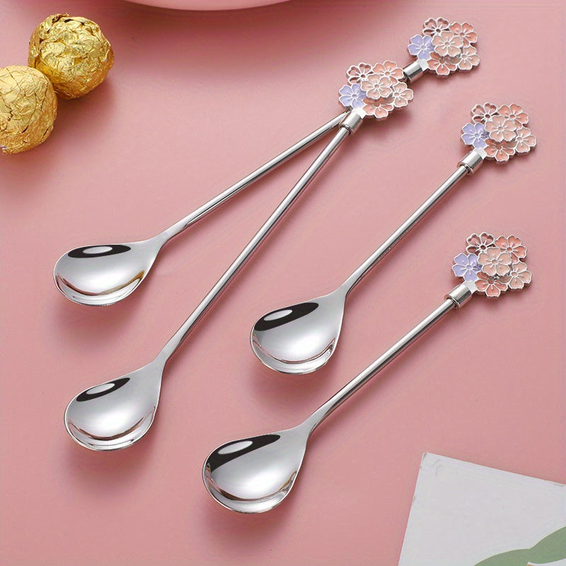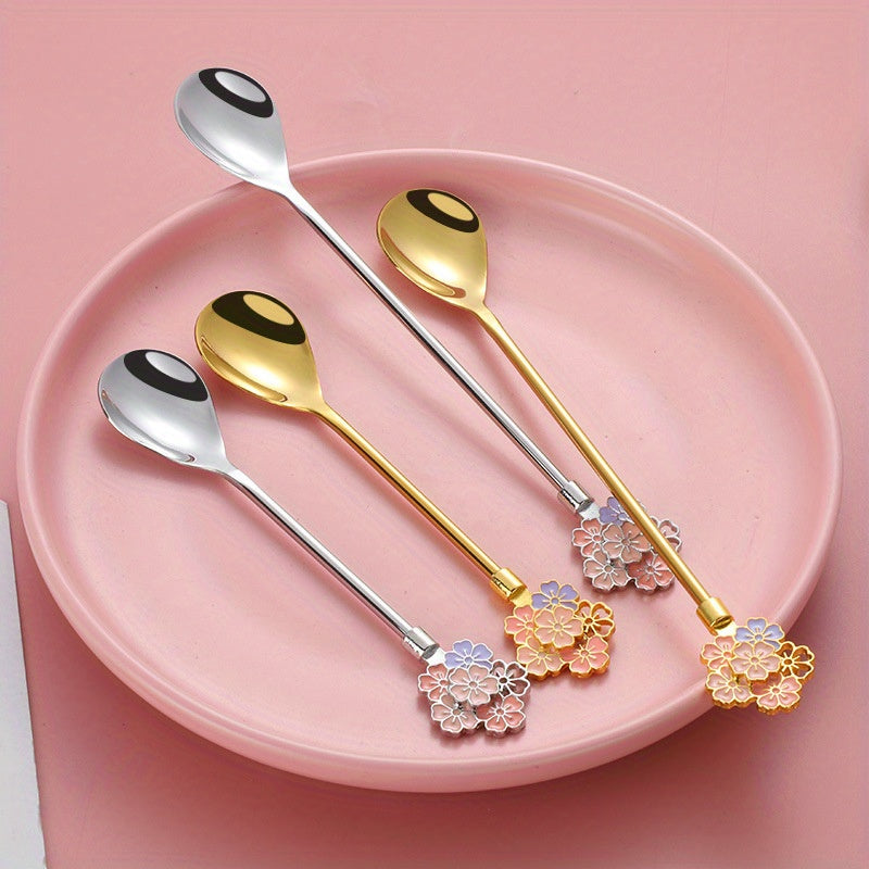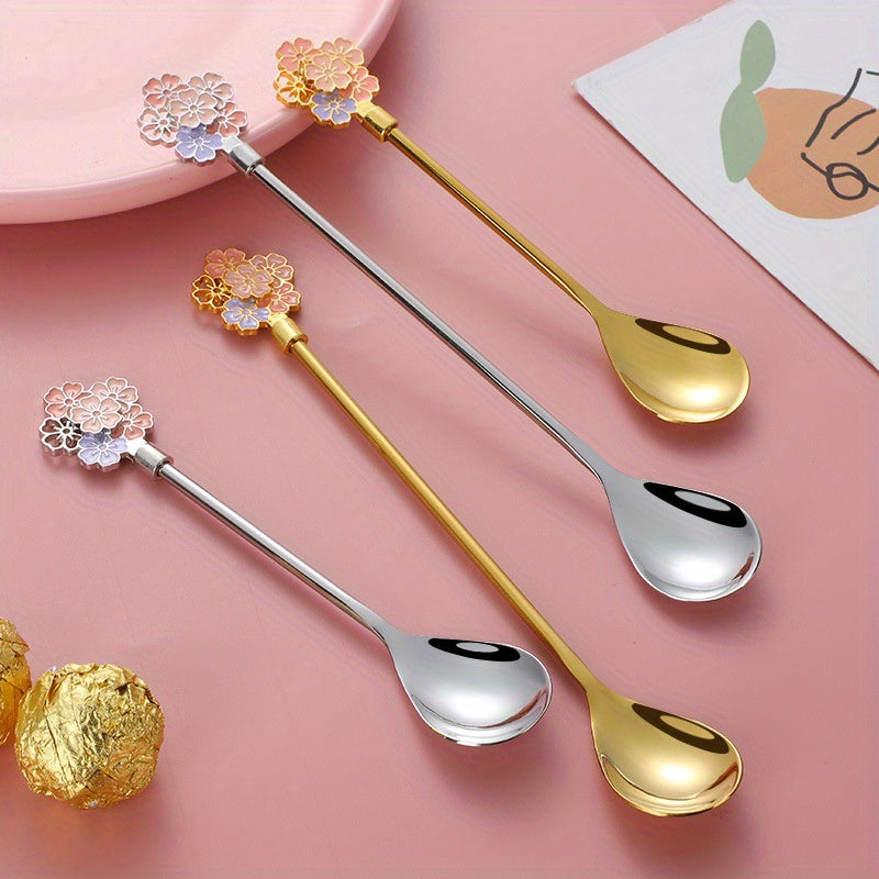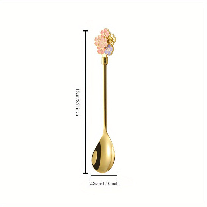 Кофейная ложка с рисунком в виде цветущей вишни, изготовленная из прочной нержавеющей стали марки 304, ложка в стиле INS, ложка с длинной ручкой из нержавеющей стали марки 304, ложка для кружек, десертная ложка и роскошная золотая ложка.