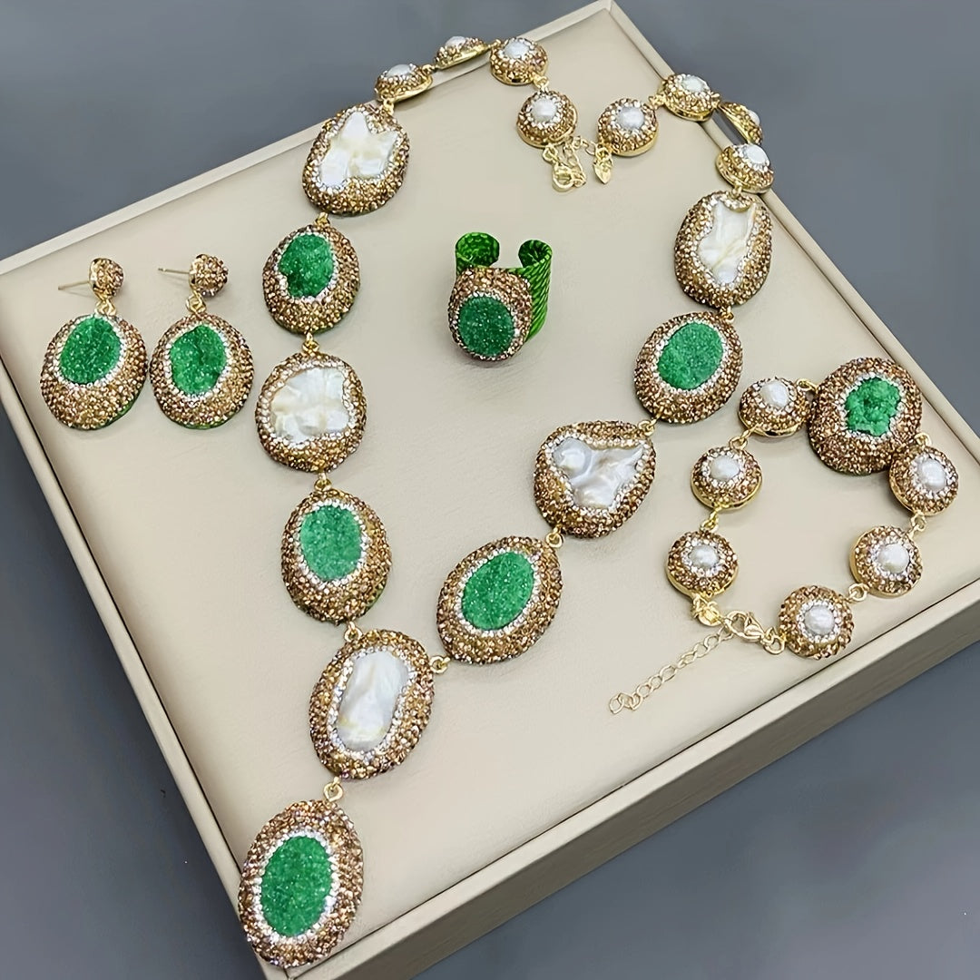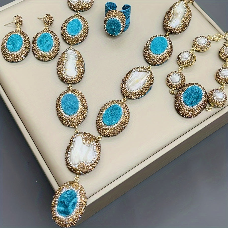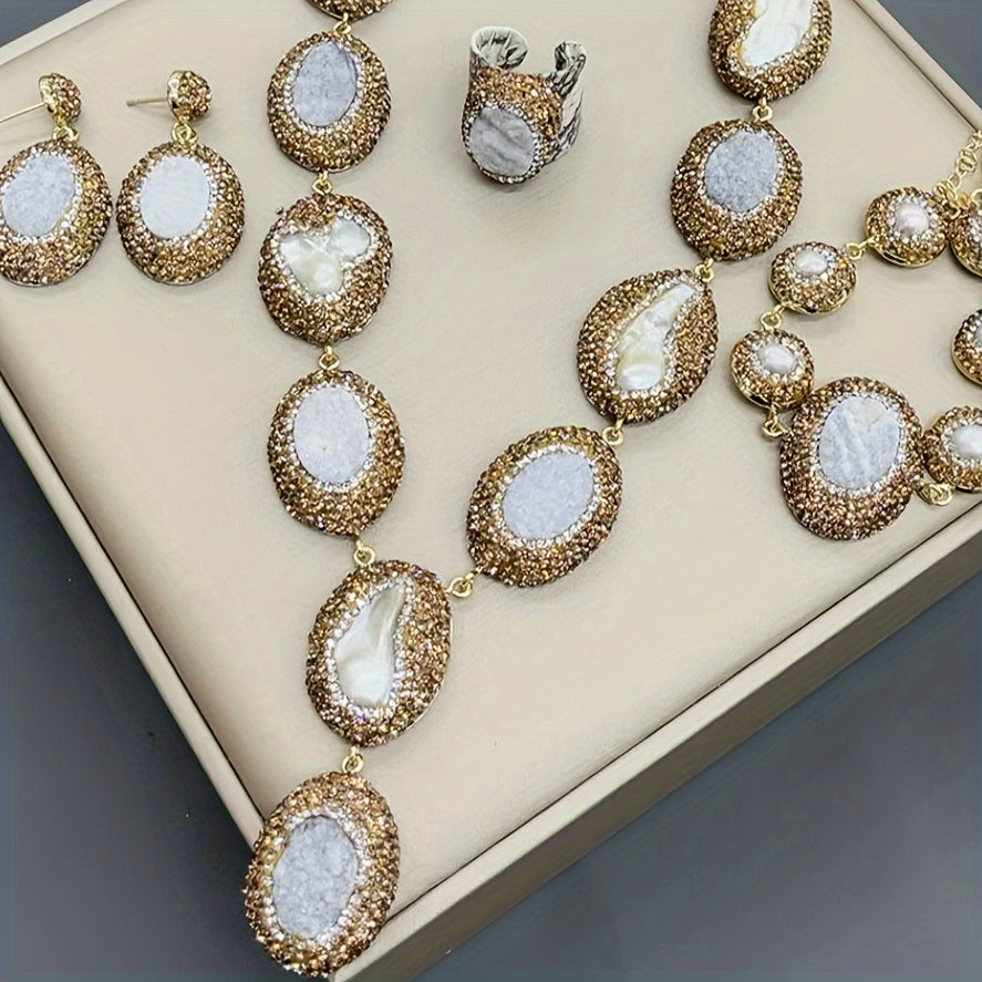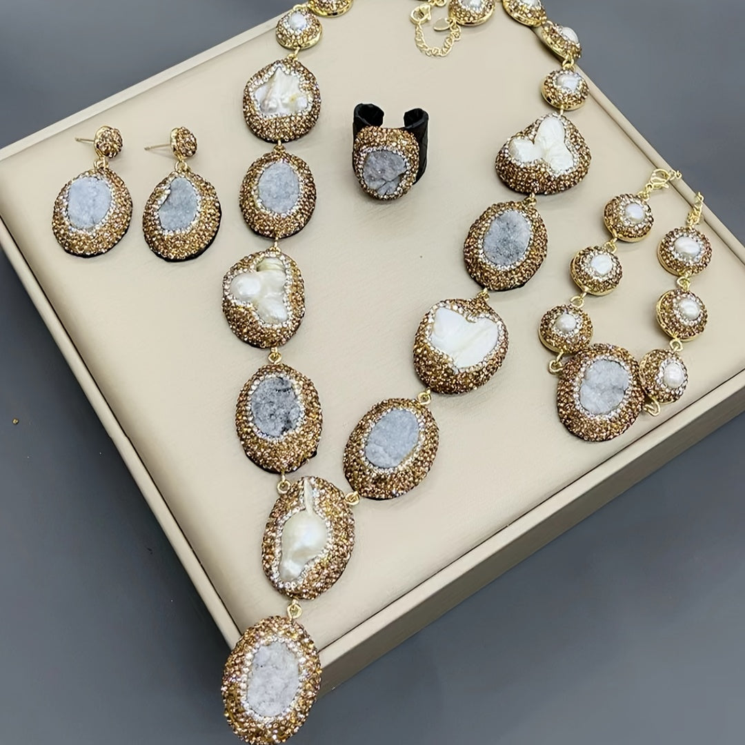 Набор подарков для женщин в винтажном богемном стиле, включающий 1 пару висячих серег, 1 ожерелье, 1 кольцо и 1 браслет, все изготовлены из алюминиевого сплава и украшены пресноводными жемчугами.