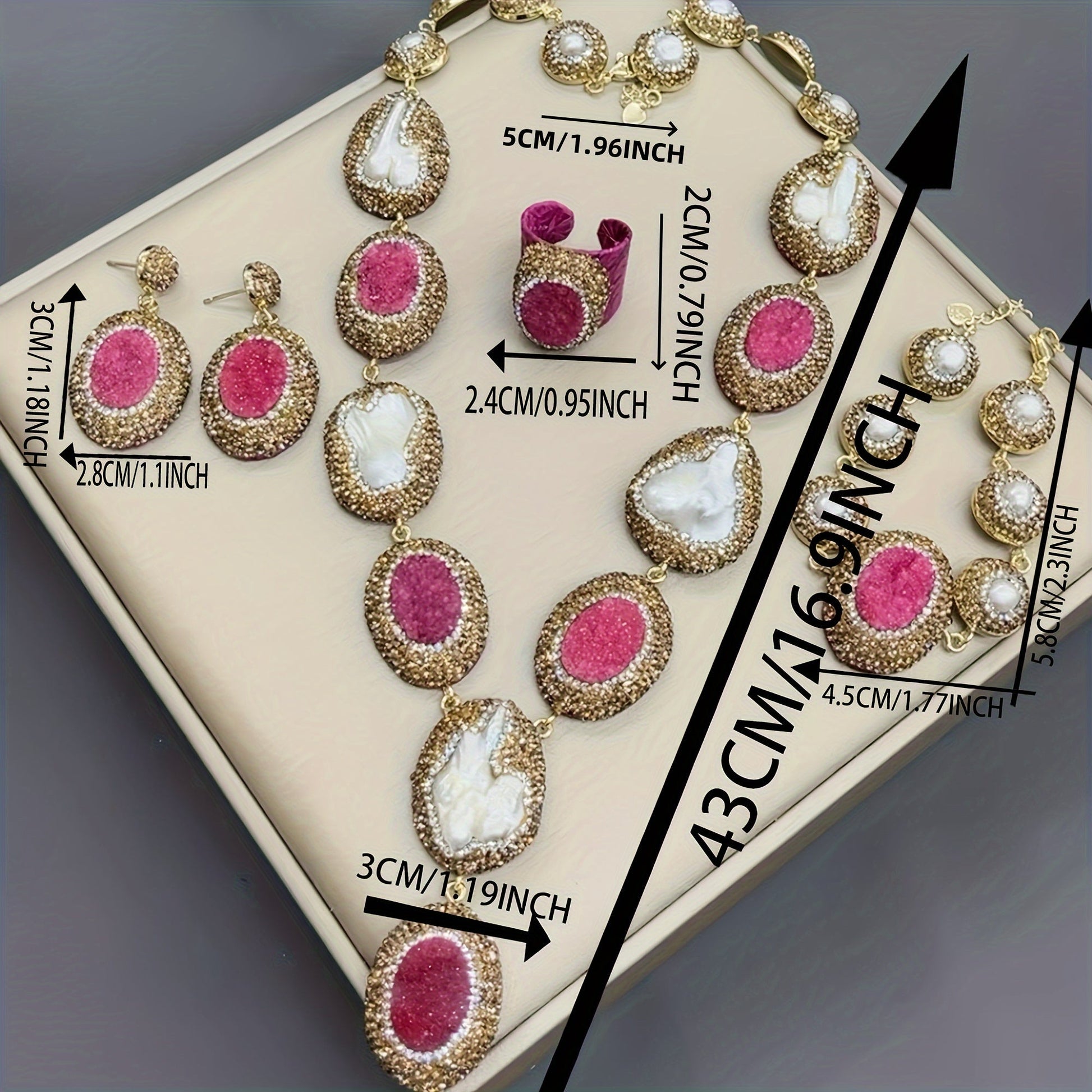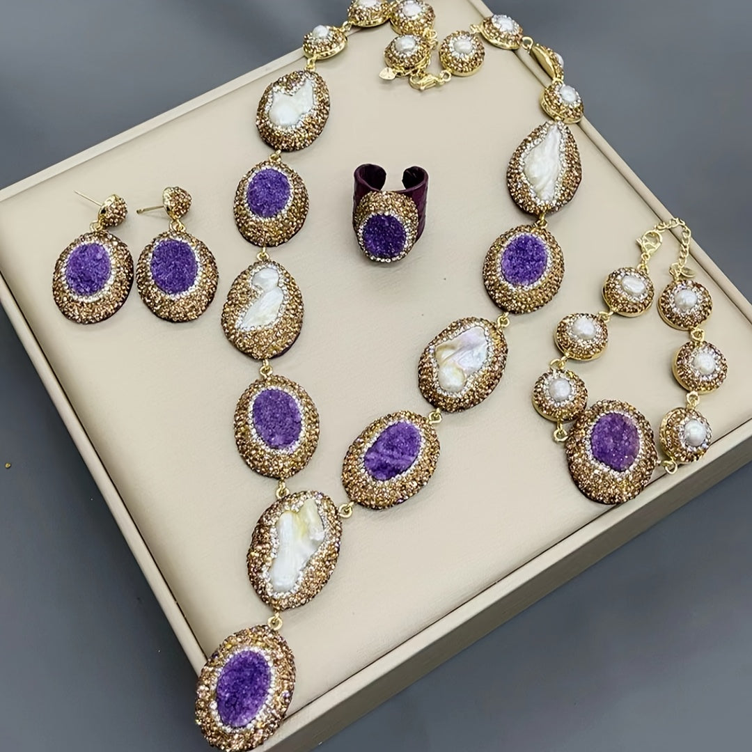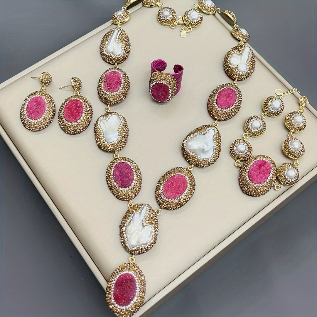 Набор подарков для женщин в винтажном богемном стиле, включающий 1 пару висячих серег, 1 ожерелье, 1 кольцо и 1 браслет, все изготовлены из алюминиевого сплава и украшены пресноводными жемчугами.