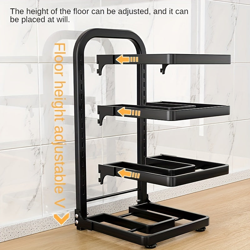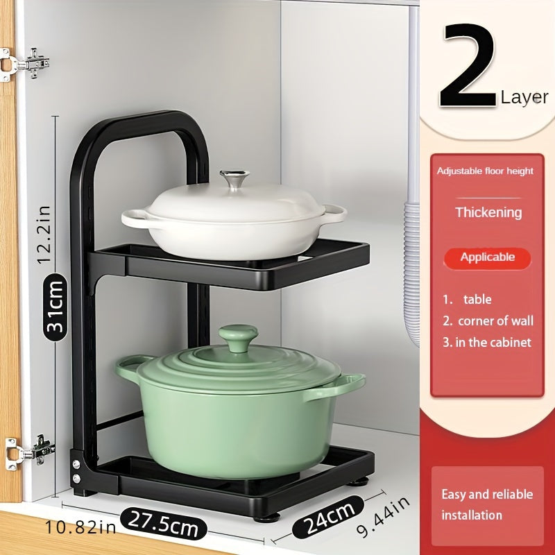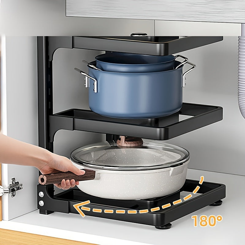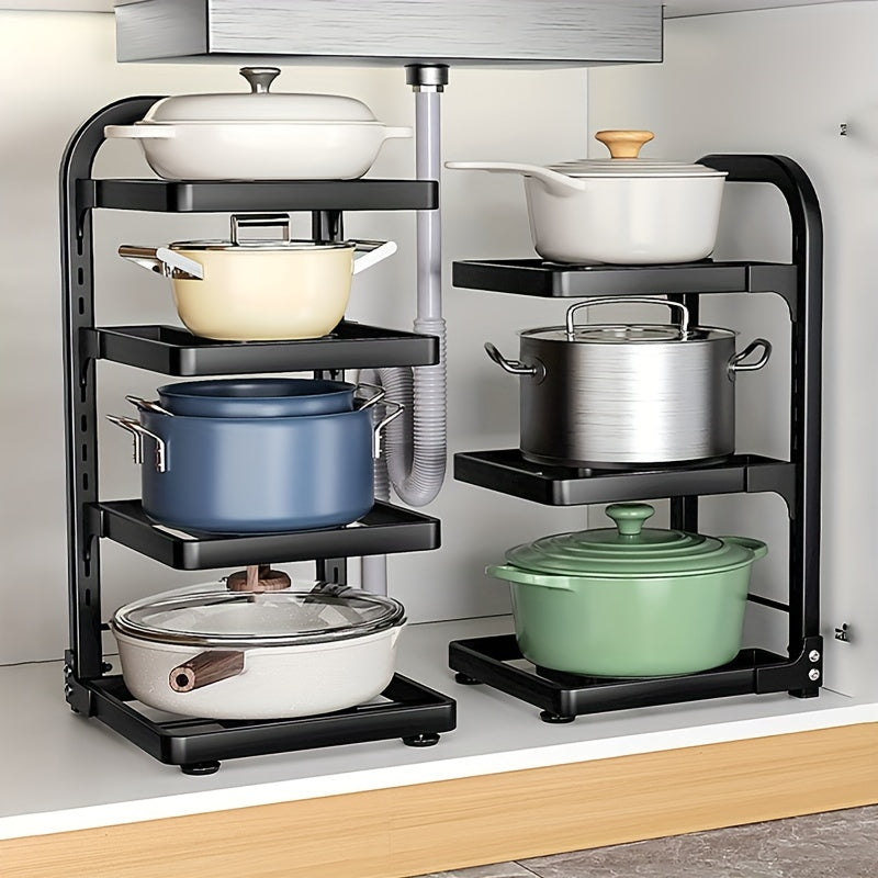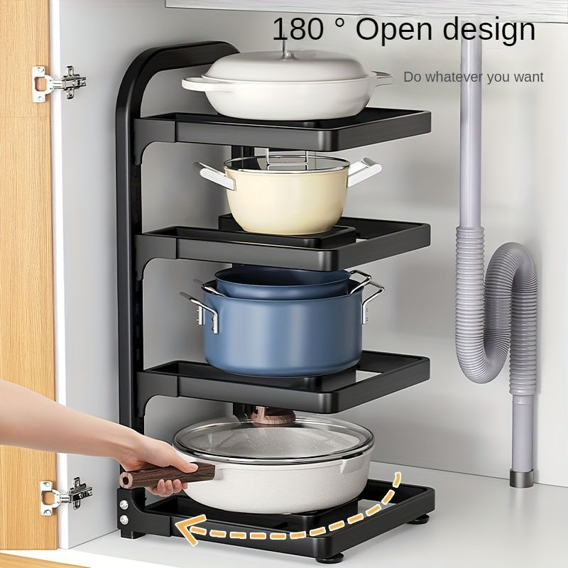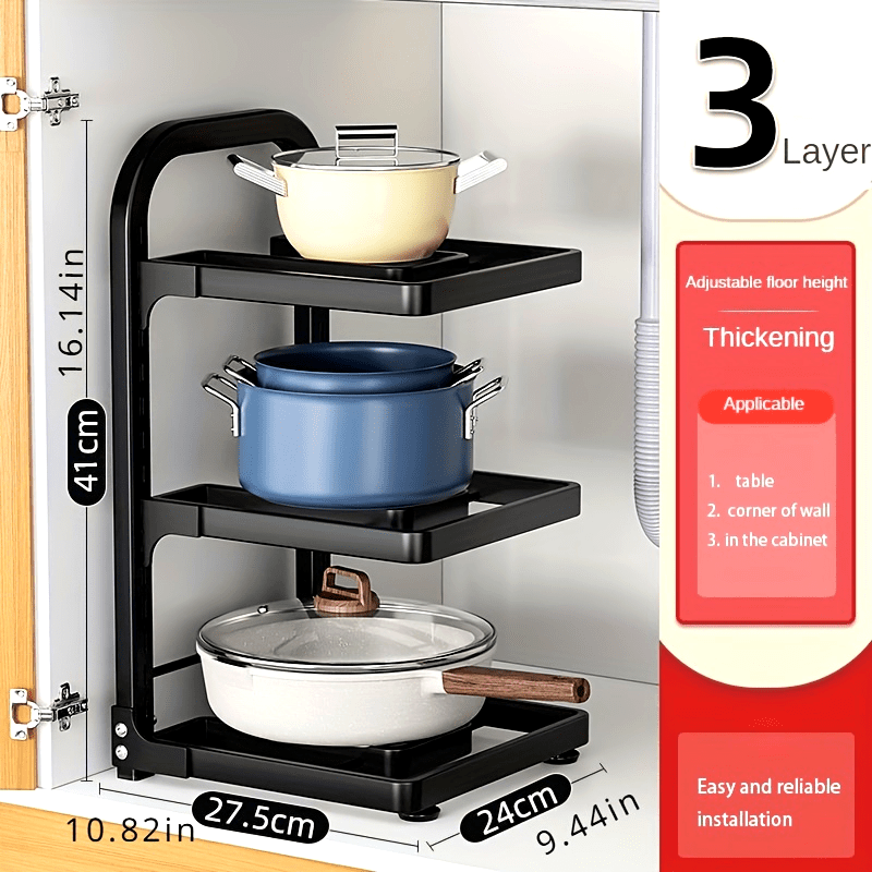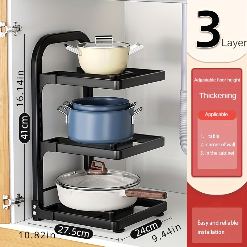Регулируемая полка для кухонных кастрюль с 3 уровнями — открытая конструкция для легкого доступа, простая установка и надежное решение для хранения вашей посуды.