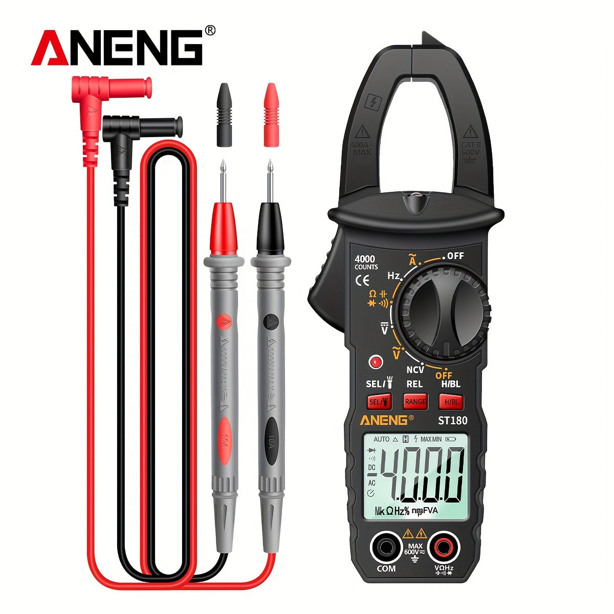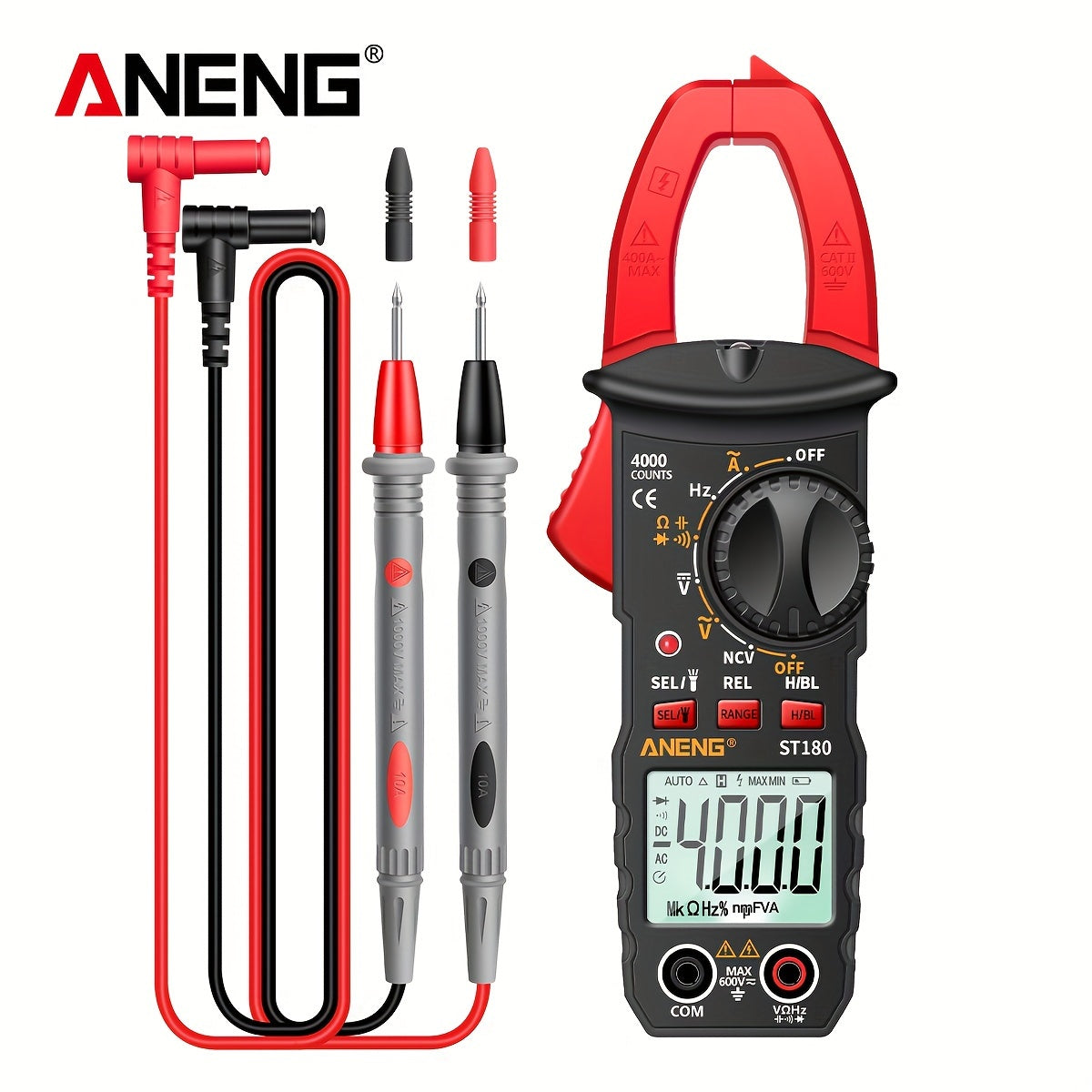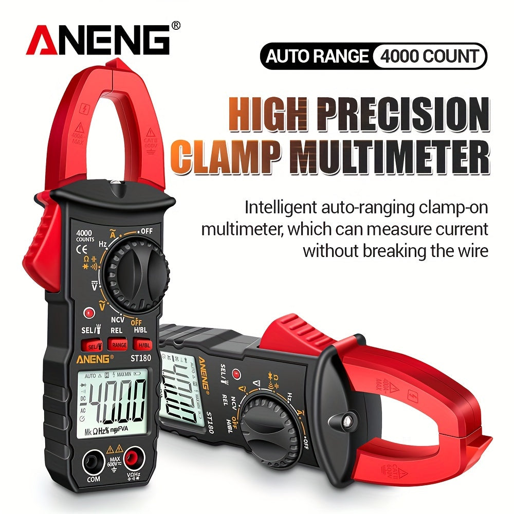 ANENG ST180 — это цифровой клещевой мультиметр с разрешением 4000 отсчетов для измерения переменного тока, напряжения, частоты, ёмкости и сопротивления, а также для тестирования автомобильных усилителей и бесконтактного измерения напряжения.