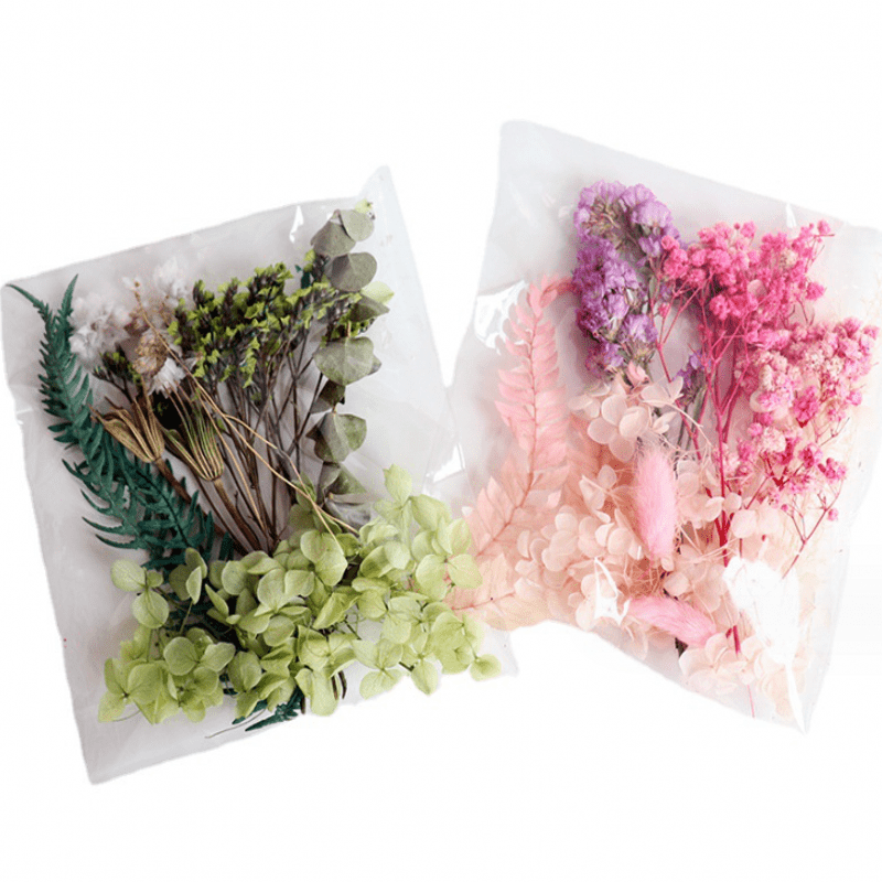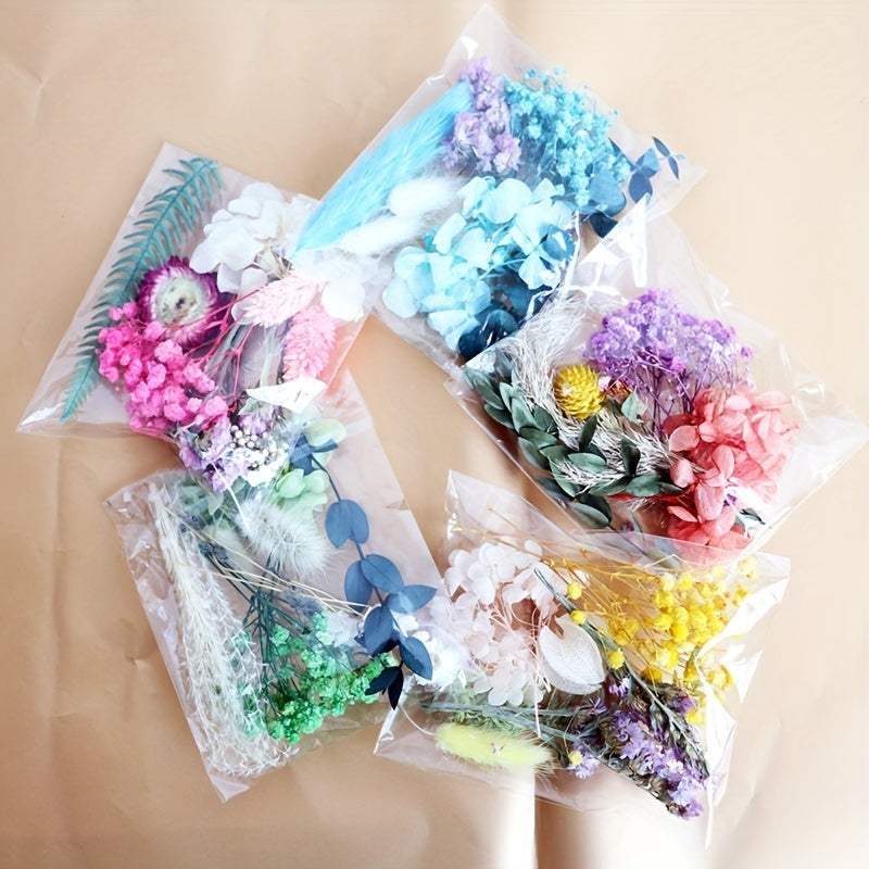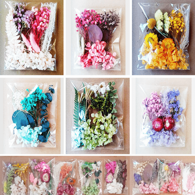 Ассорти цветов, сохраненные материалы и эпоксидные смолы для DIY цветочных проектов.