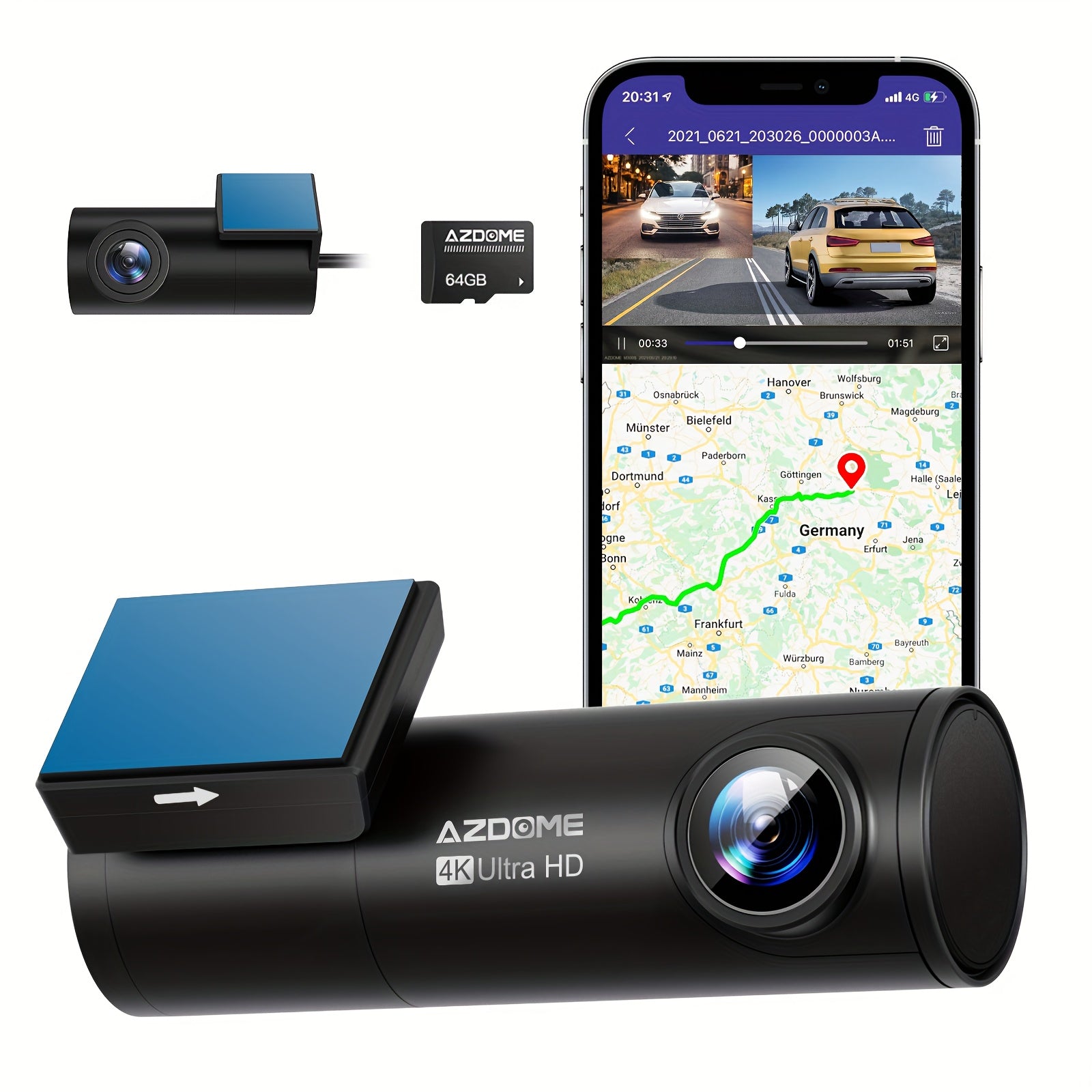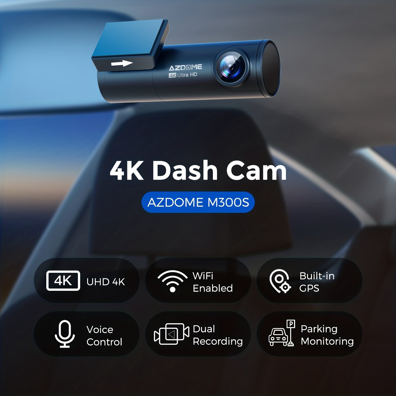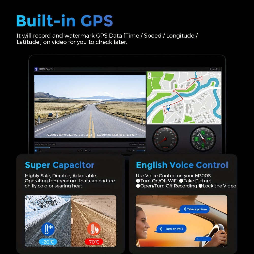AZDOME M300S 4K Dash Cam4K+1080P Dual CamWiFiBuilt-in GPSVOICE Control24 Hours Parking MonitoringLoop Recording/G-sensor/Parking Monitoring【4K+1080P DUAL RECORDING】 Dual видеорегистратор AZDOME M300S использует процессор Novatek NT96670 и сенсор захвата GC2053 с ультранизким освещением, записывает видео в разрешении до ультра HD 4K (3840*2160P) + FHD 1080P, что помогает вам читать большинство деталей на дорожных знаках, номерах автомобилей и т. д. Обеспечивает спокойствие за рулём. Кроме того, фронтальная и задняя широкоугольные камеры уменьшают слепые зоны, а важные доказательства могут быть сохранены и представлены в случае столкновения【Беспроводной Wi-Fi & GPS】 5 ГГц и 2.4 ГГц двухдиапазонный Wi-Fi могут передавать в двух различных стандартных частотных диапазонах, чтобы избежать беспроводных помех. Более стабильный сигнал и более высокая скорость. Этот видеорегистратор оснащён встроенным GPS и записывает маршрут движения, реальную скорость, местоположение и т. д. Трекер на Google Maps через Wi-Fi с помощью приложения или с помощью нашего Windows и Mac AZDOME Player, что предоставит дополнительные доказательства в случае аварии【Режим парковки 24 часа】 Dual видеорегистратор AZDOME M300S автоматически переключается в режим парковки, когда ваш автомобиль припаркован. Детектор столкновений активируется при ударе или столкновении, а таймлапс-запись ведётся непрерывно с низким энергопотреблением и низкой частотой кадров. Если ваш автомобиль был сбит во время парковки или кто-то пытается украсть ваш автомобиль, этот видеорегистратор обеспечит круглосуточную защиту. Для этой функции требуется комплект жёсткой проводки Micro USB (не входит в комплект)【Улучшенное ночное видение и WDR】 В сочетании с улучшенной 6-слойной стеклянной линзой F1.8 и технологией WDR, обеспечивает гораздо более чёткое изображение ночью, сохраняет резкость изображения и автоматически балансирует освещение в слишком ярких или слишком тёмных областях. Видеорегистратор, которым можно пользоваться с уверенностью днём и ночью【6 голосовых команд и суперконденсатор】 Включение Wi-Fi, фотографирование, отключение записи, отключение Wi-Fi, запуск записи, блокировка видео. Умное голосовое управление значительно облегчает управление автомобильным видеорегистратором M300S, вы можете полностью освободить руки во время вождения. Создан для выживания в экстремальных погодных условиях от -4°F (-20°C) до 158°F (70°C), чтобы соответствовать потребностям очень горячих или очень холодных районов. Обеспечивает более долгий срок службы по сравнению с видеорегистраторами на литий-ионных батареях на рынке【Компактный и очень простой в установке】 Благодаря тонкому и компактному дизайну (размер: 3.8x1.7x1.4 дюйма), фронтальный и задний видеорегистратор занимают очень мало места в вашем автомобиле, не мешая обзору во время вождения. Простая установка и настройка с отличными инструкциями, входящими в комплект, даже новичок не будет волноваться.