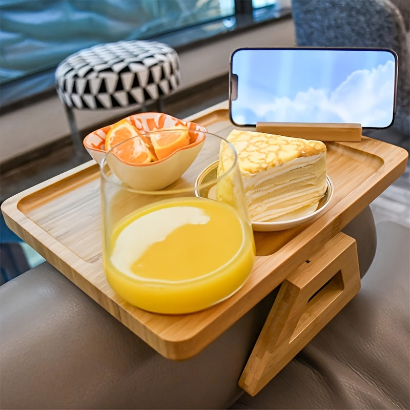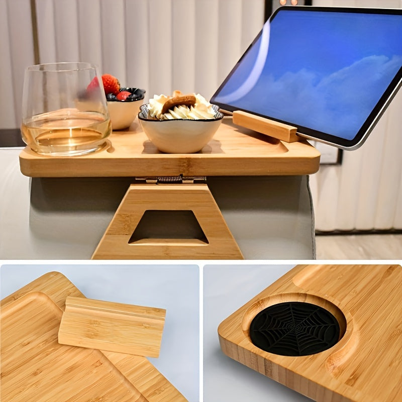 Поднос для дивана из бамбука с пристегивающимся подлокотником — складной и портативный, изготовлен из прочного желтого бамбука — идеально подходит для хранения чашек, стаканов, пультов дистанционного управления и многого другого