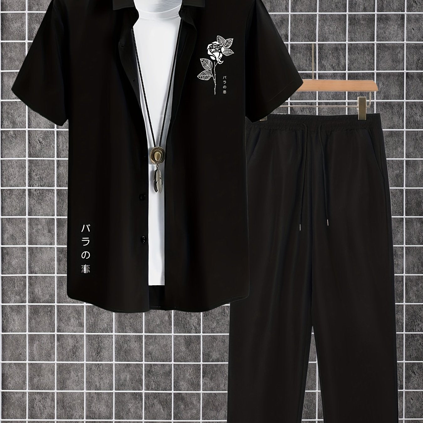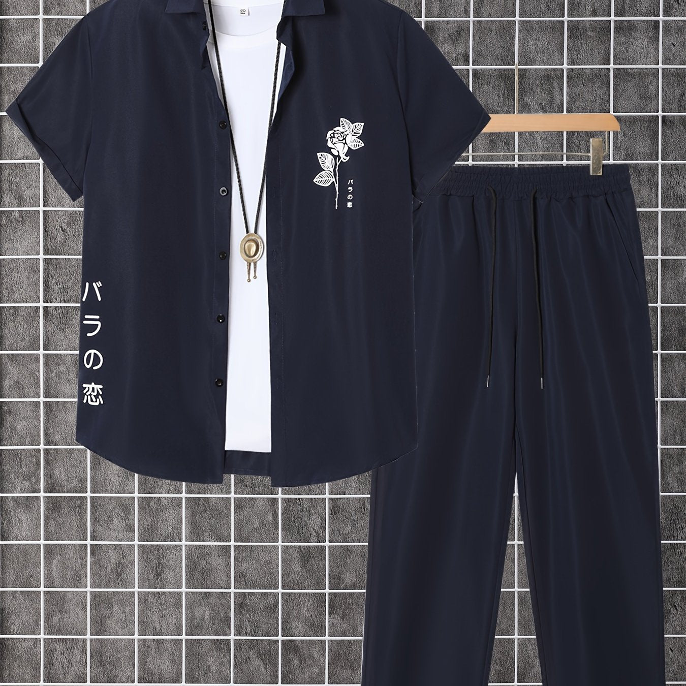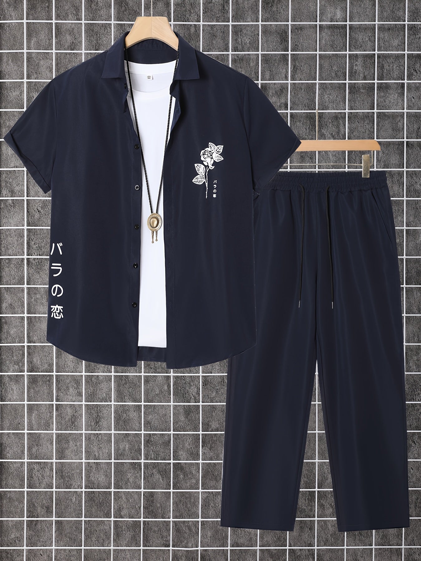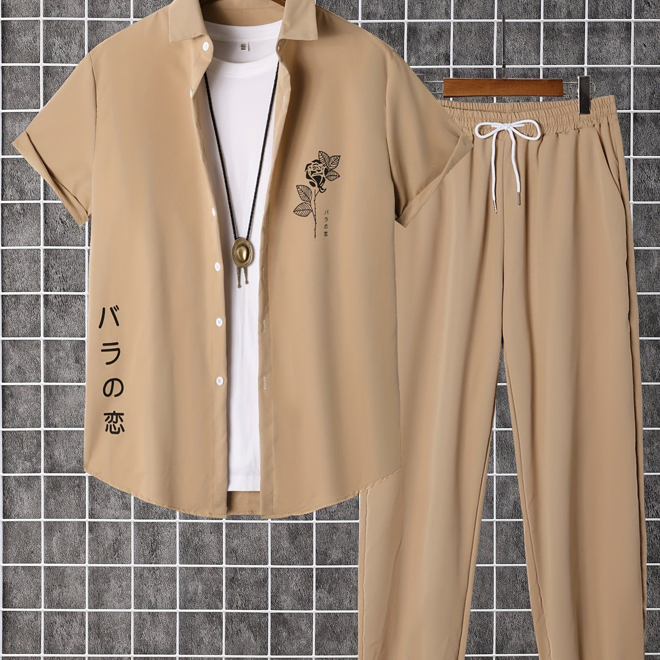 Мужской комплект из коротких рукавов с цветочным принтом и шортами, бежевый, полиэстер, повседневный летний