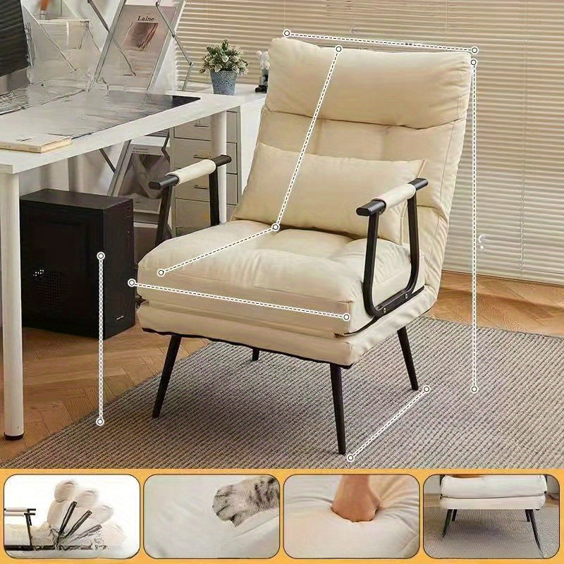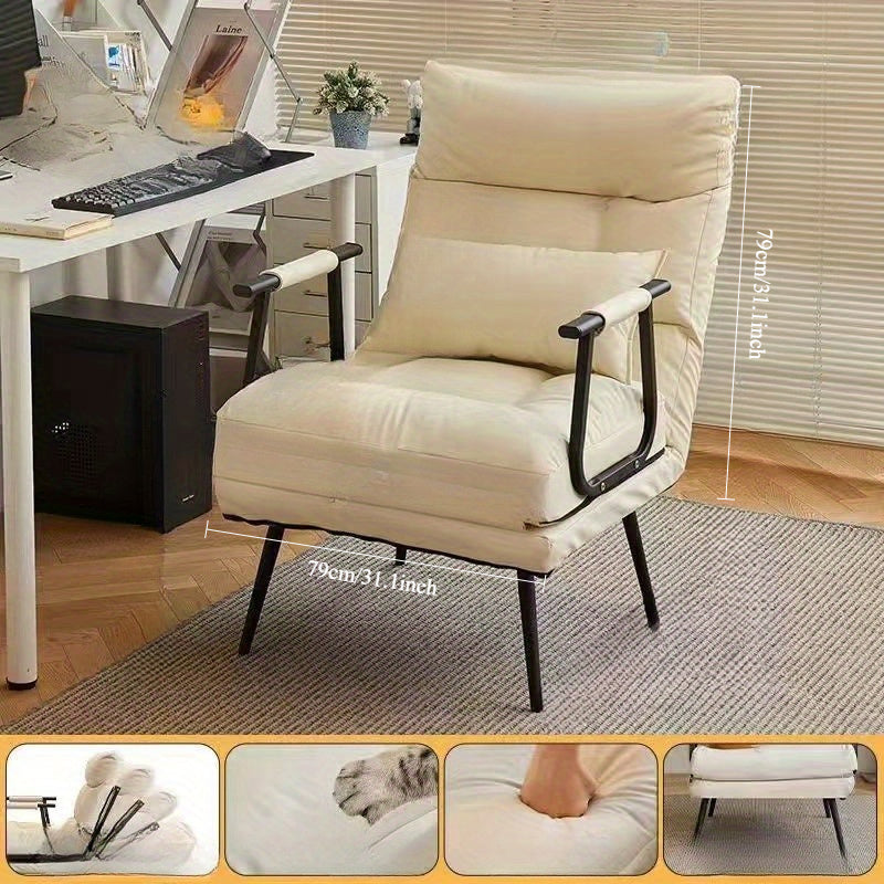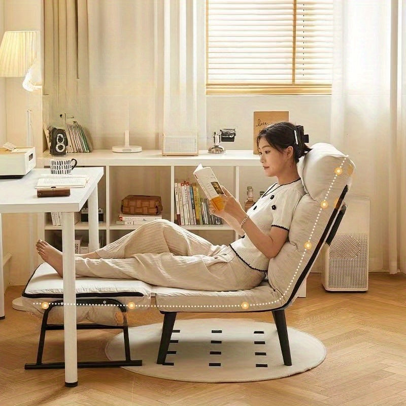 Бежевое кожаное складное кресло-реклайнер с железной рамой, подушкой и многофункциональным дизайном для офиса или сна.