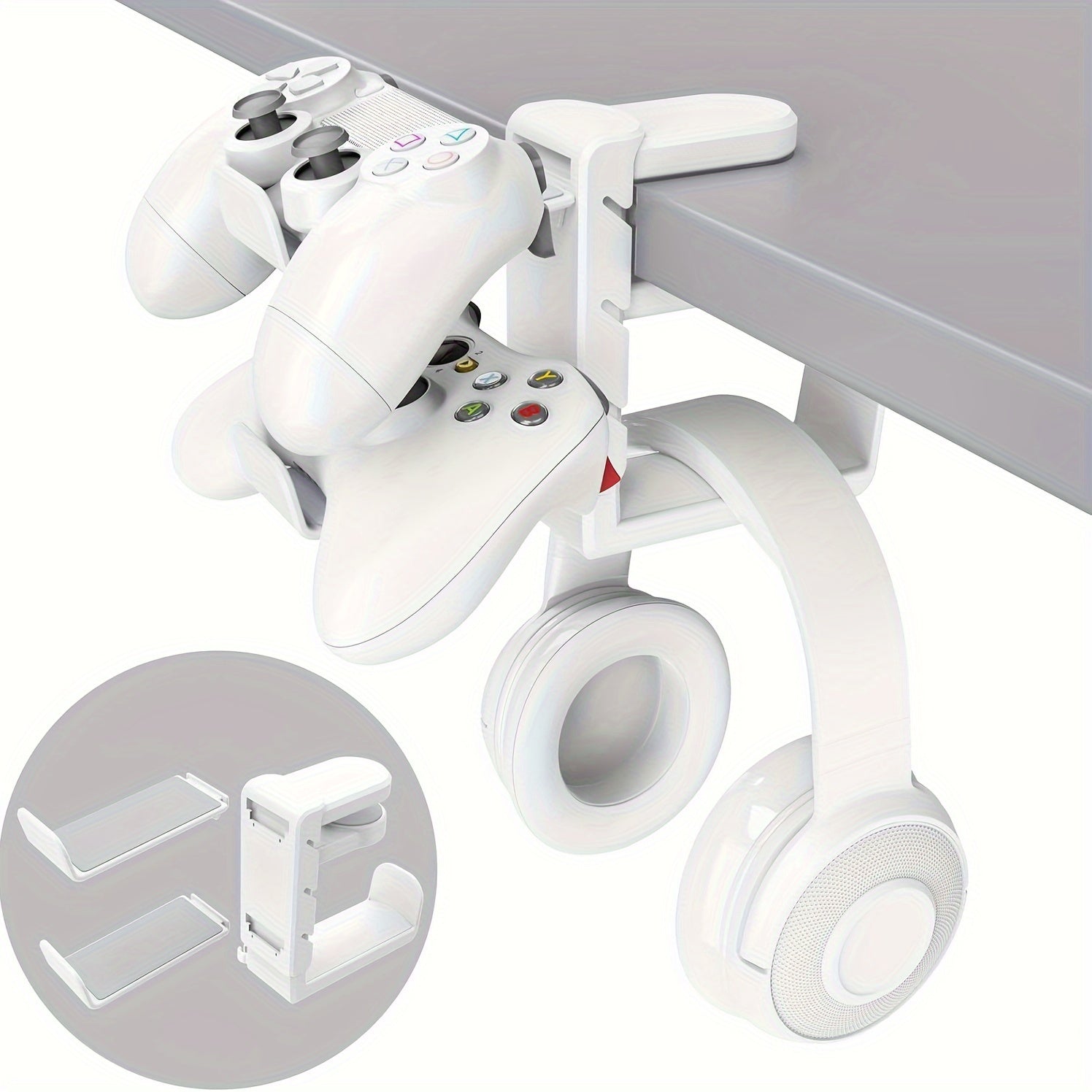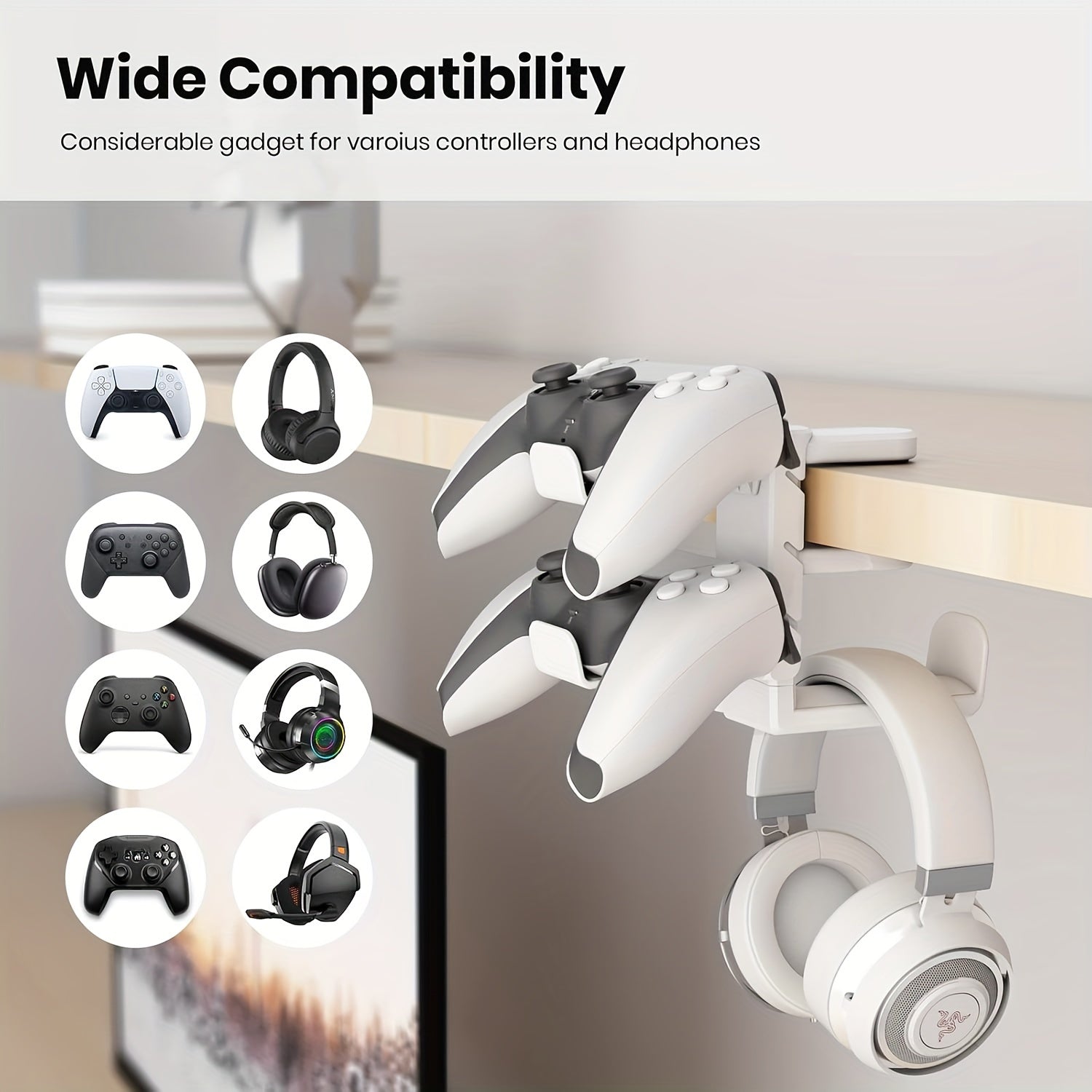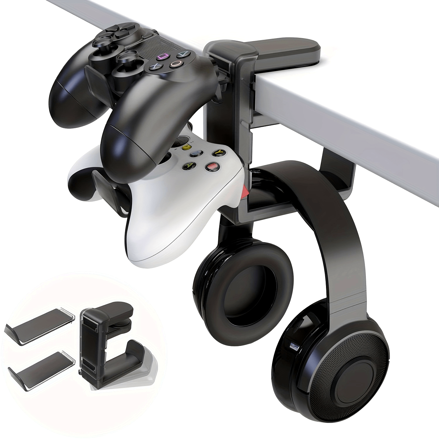 Черный 3-в-1 регулируемый держатель игровой гарнитуры и контроллера с вращающимся зажимом для PS5/Switch/Xbox. Имеет подставку под стол и крючок для кабельного органайзера.