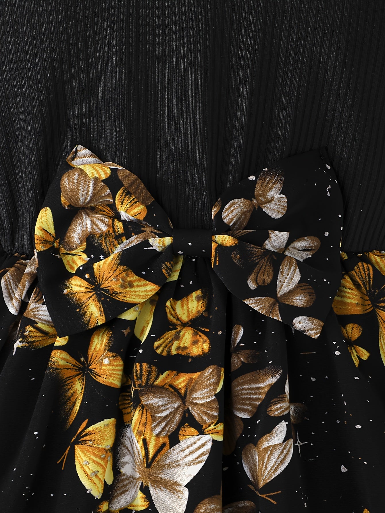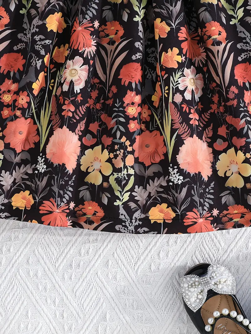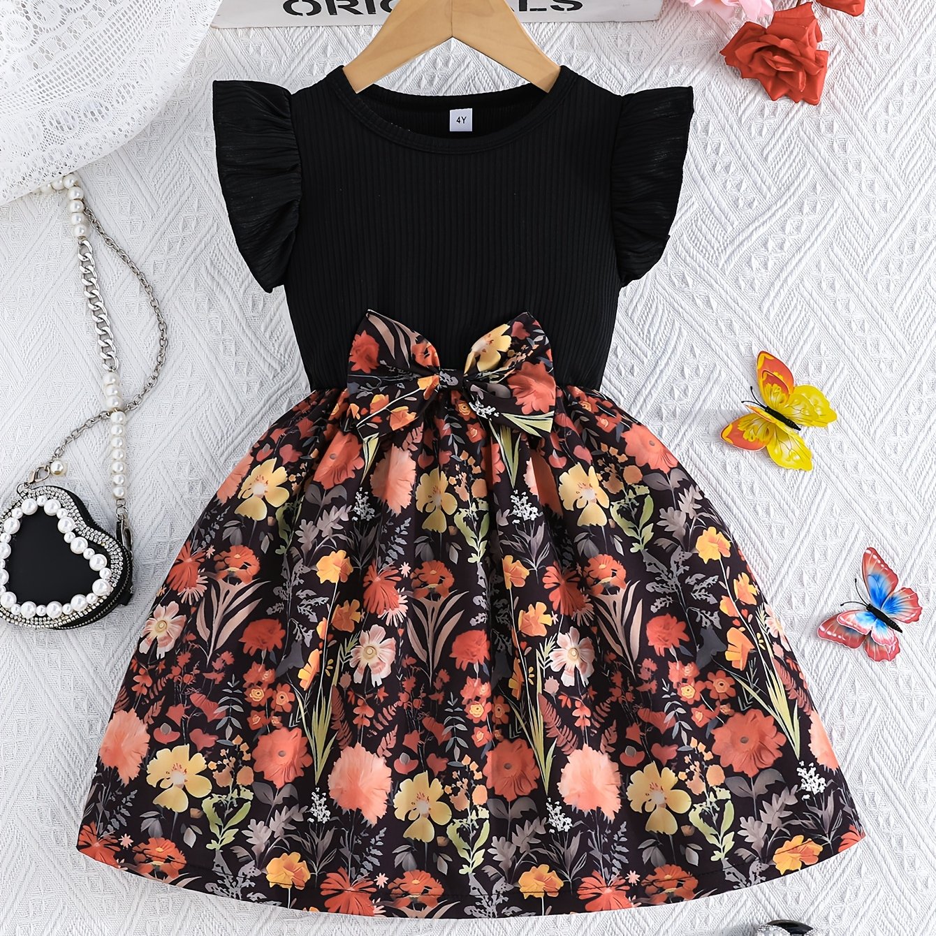 Девочки платье-миди А-силуэта с цветочным принтом, рюшеобразными рукавами и бантом для весенних и осенних прогулок на свежем воздухе