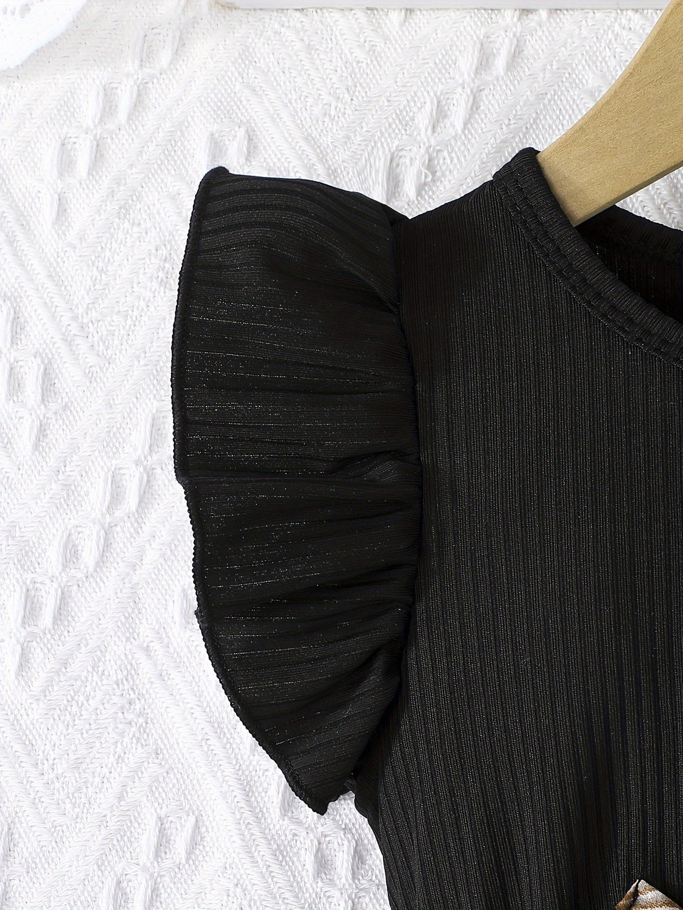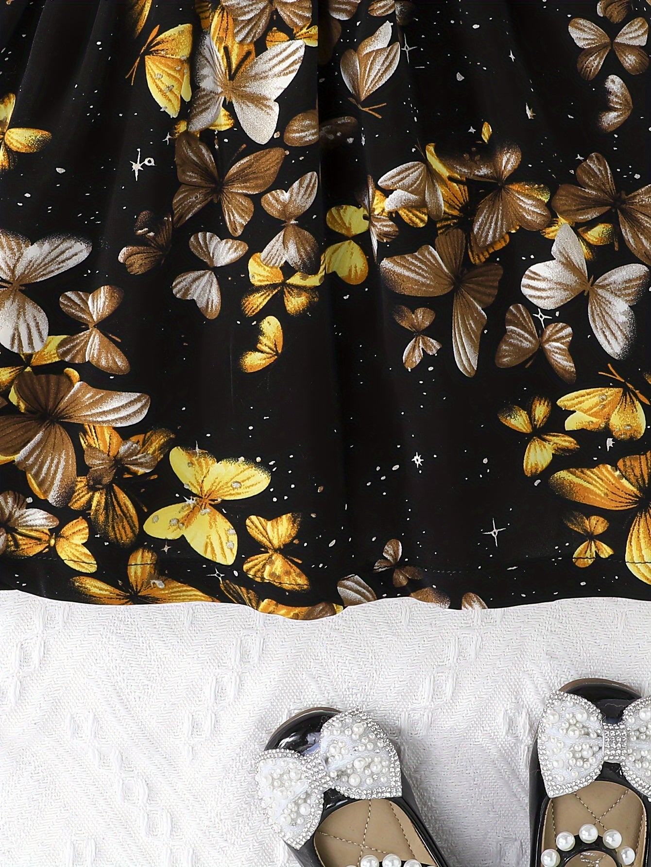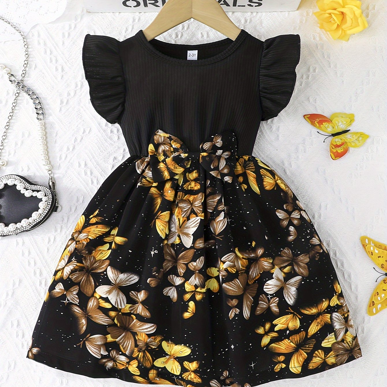 Девочки платье-миди А-силуэта с цветочным принтом, рюшеобразными рукавами и бантом для весенних и осенних прогулок на свежем воздухе