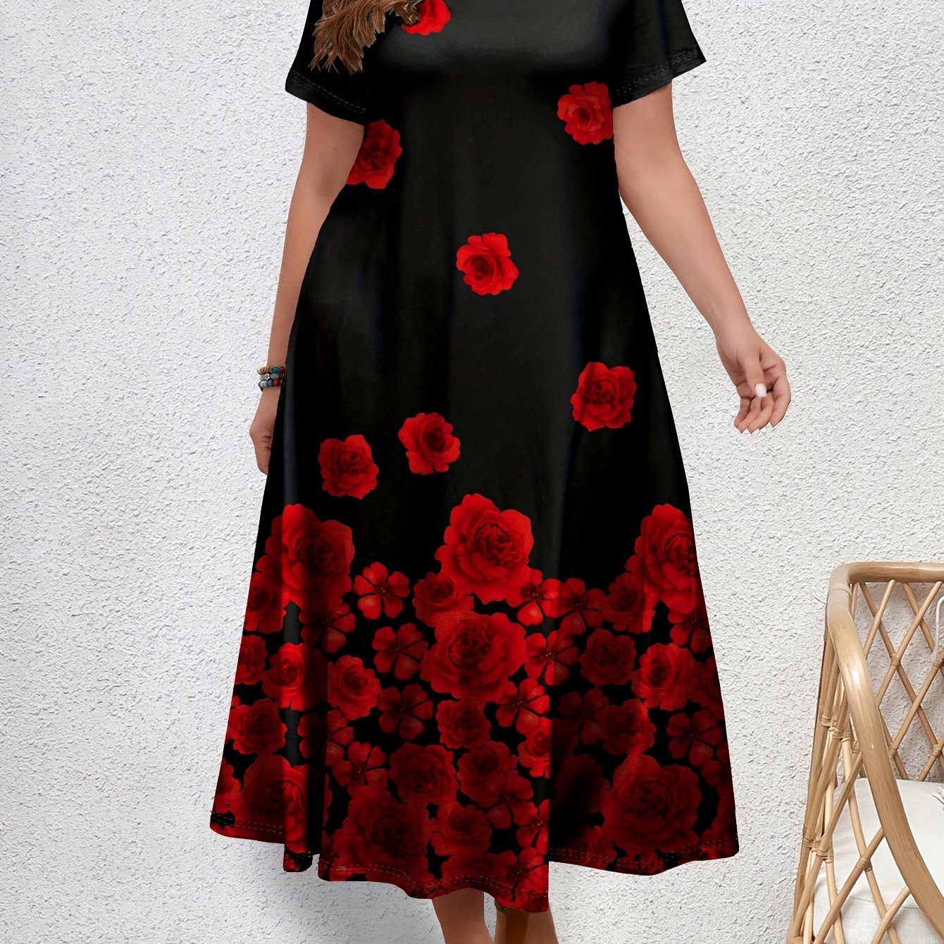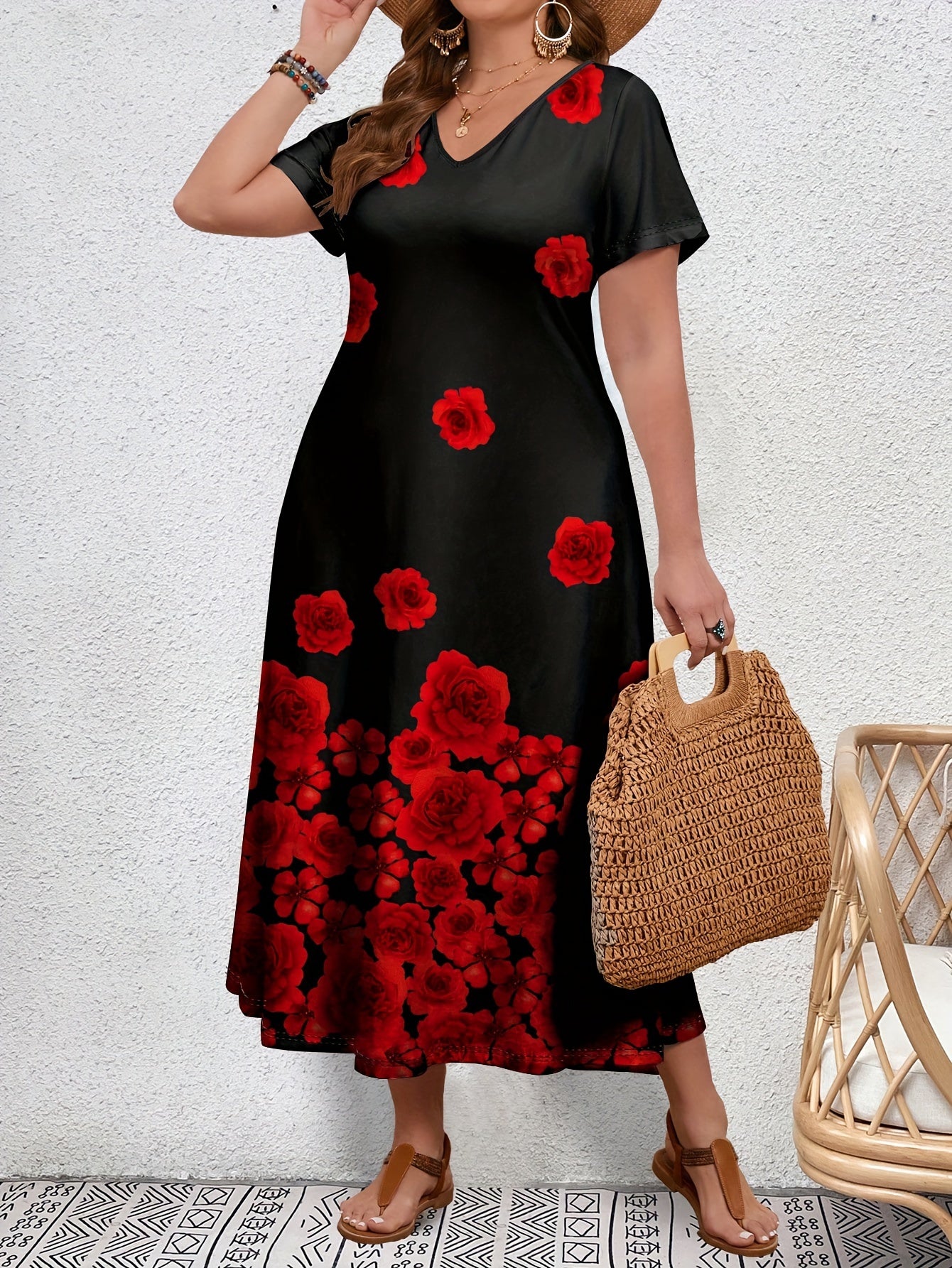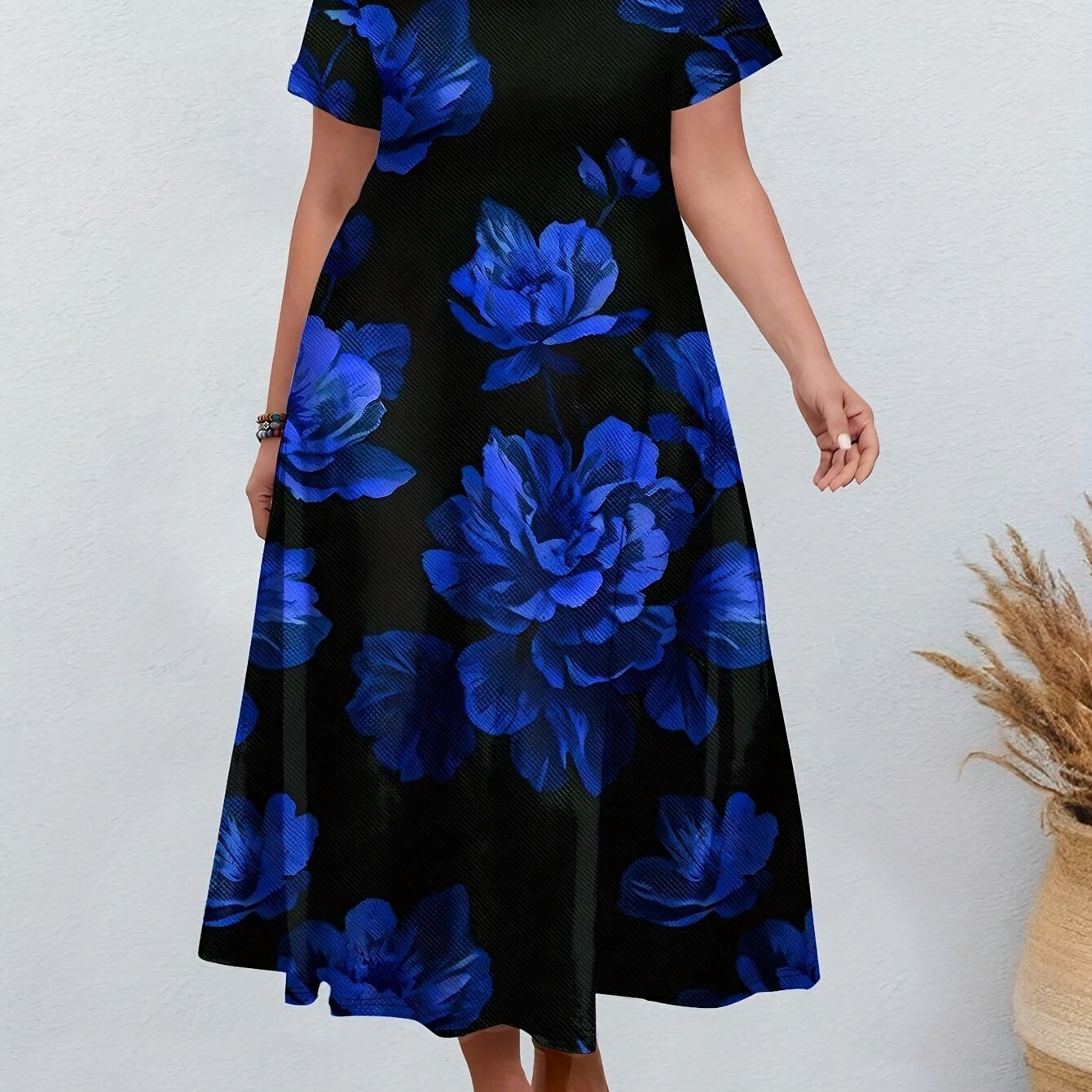 Синее цветочное платье миди с V-образным вырезом для женщин - Платье с короткими рукавами А-силуэта с розовым принтом, полиэстеровый состав, машинная стирка, подходит для повседневных или формальных мероприятий, удобная посадка. Милое