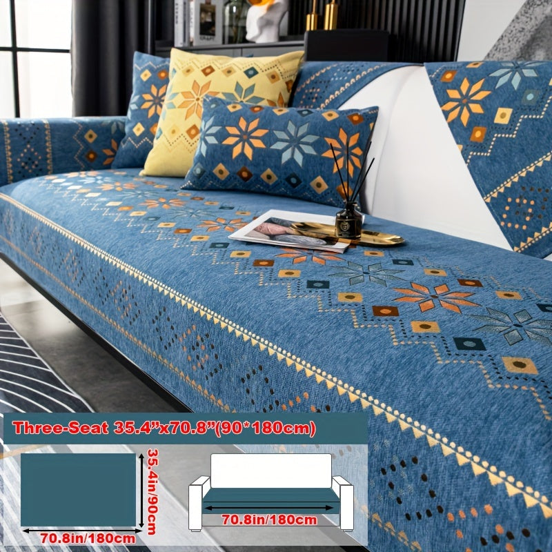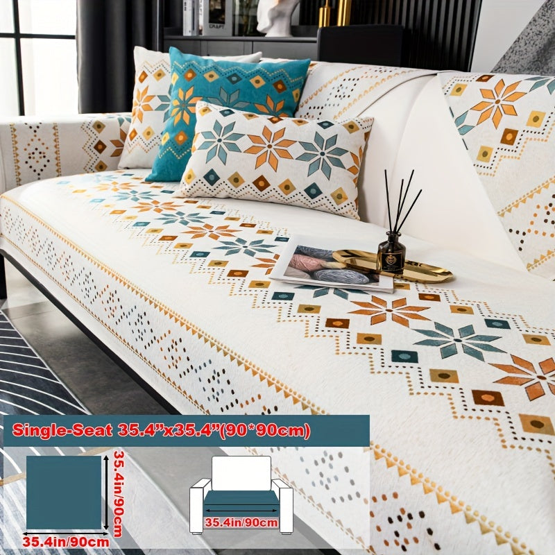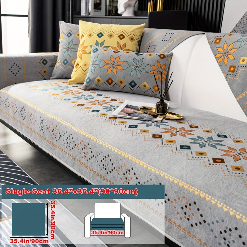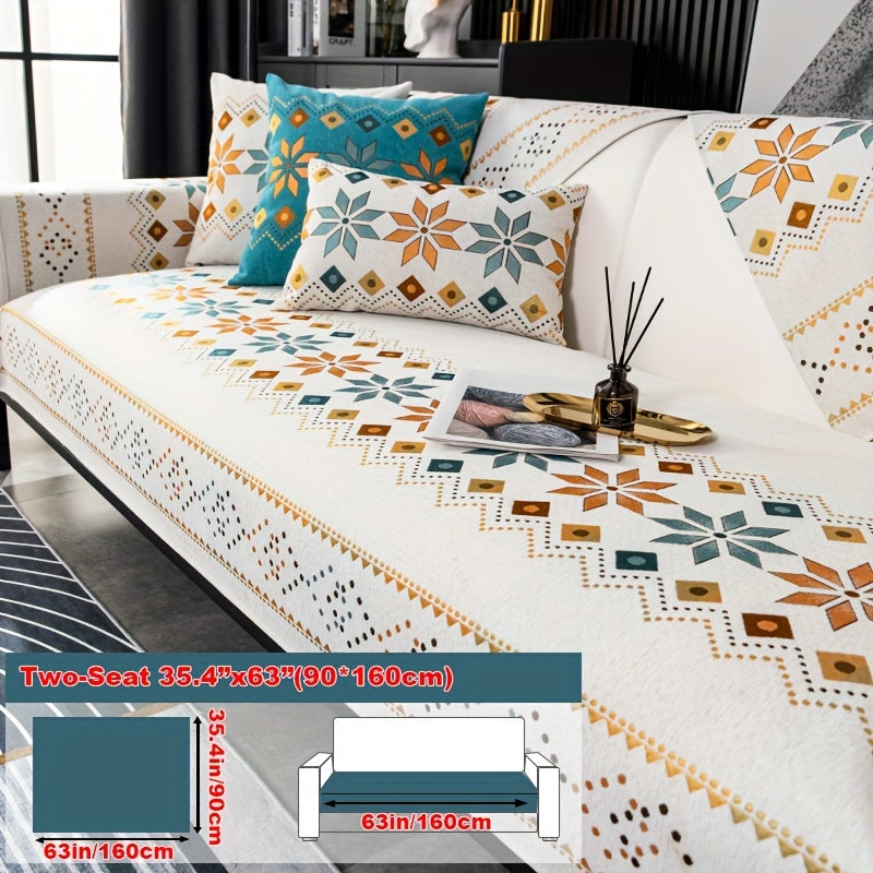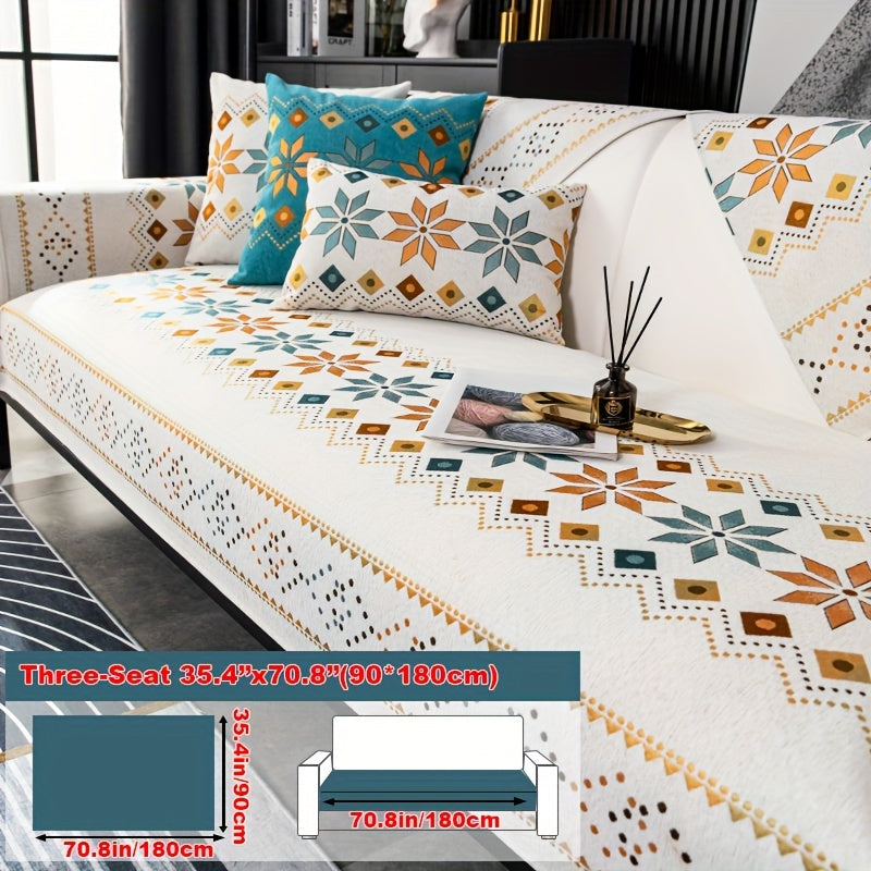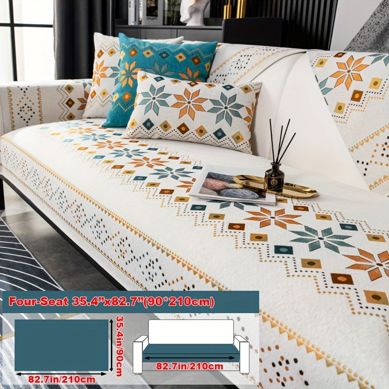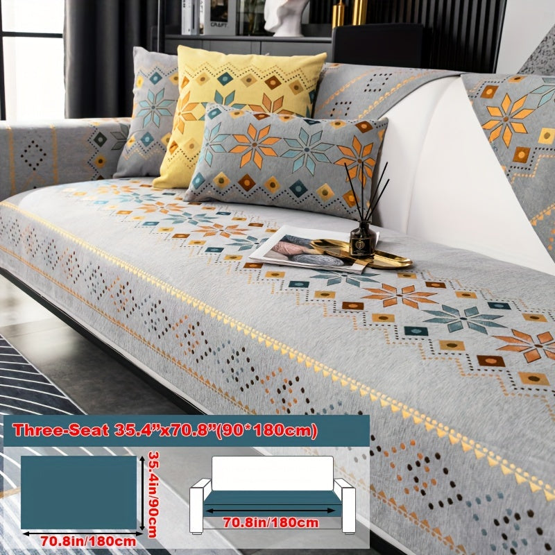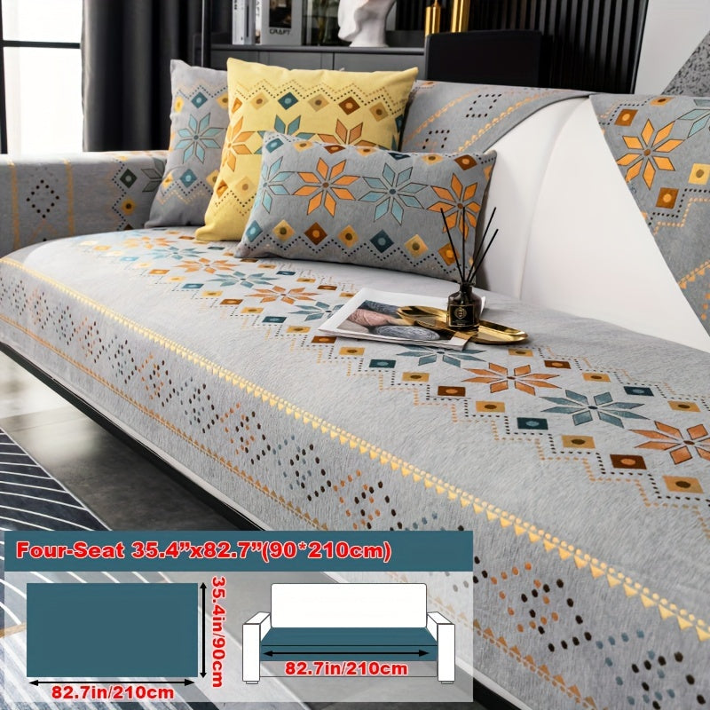 Чехол для дивана из шенилла "Богемные четыре сезона" с геометрическим вышитым узором, обеспечивает защиту дивана и противоскользящие свойства для домашнего декора в спальне, офисе и гостиной.