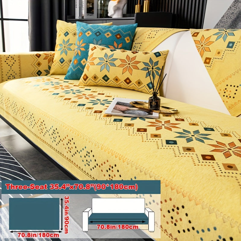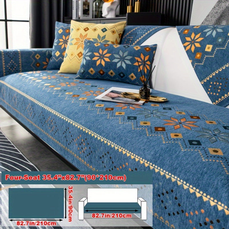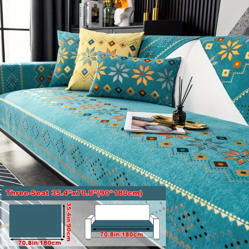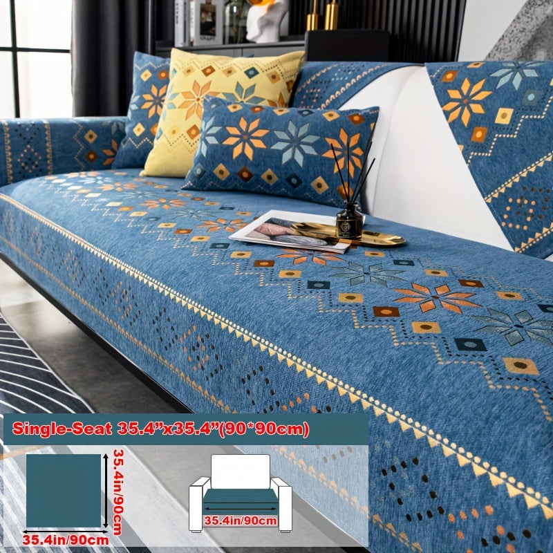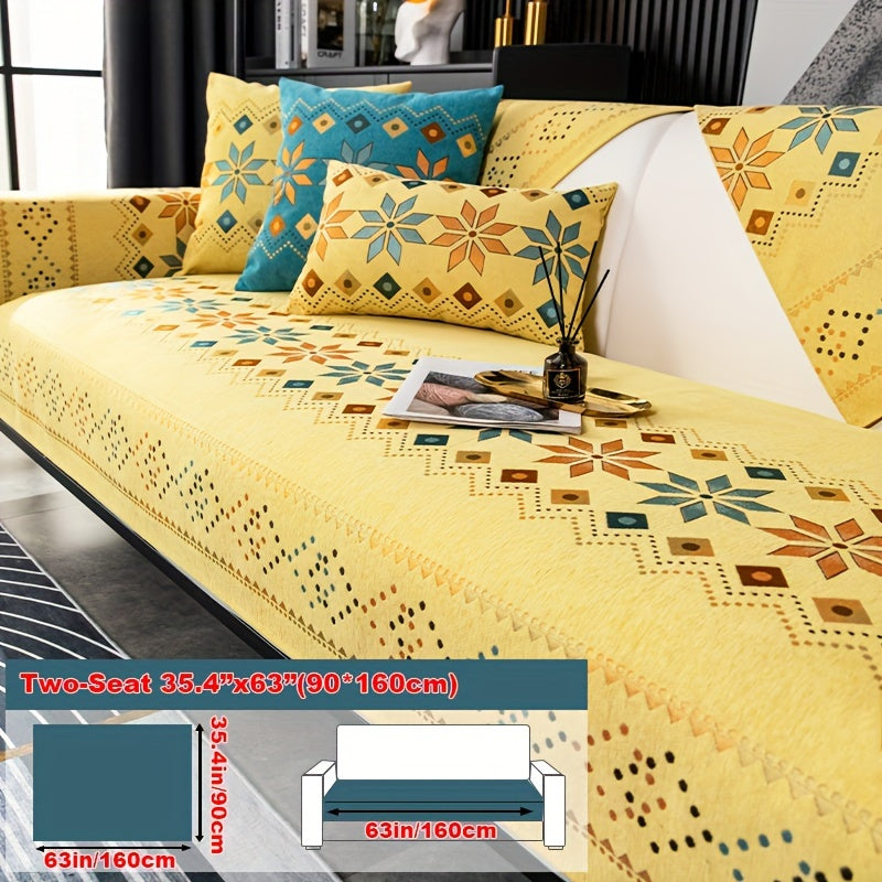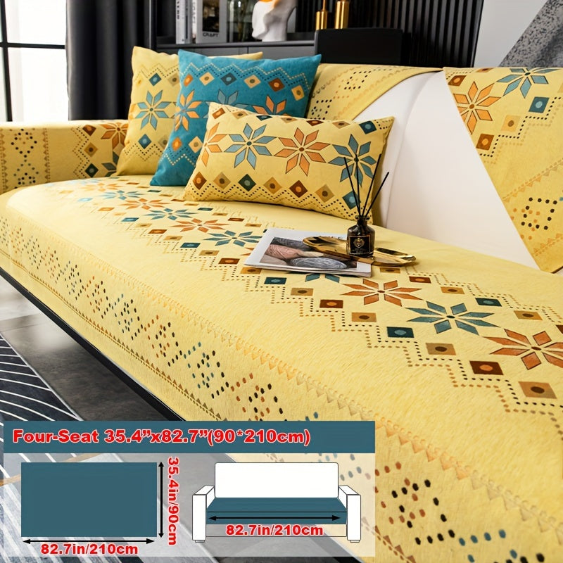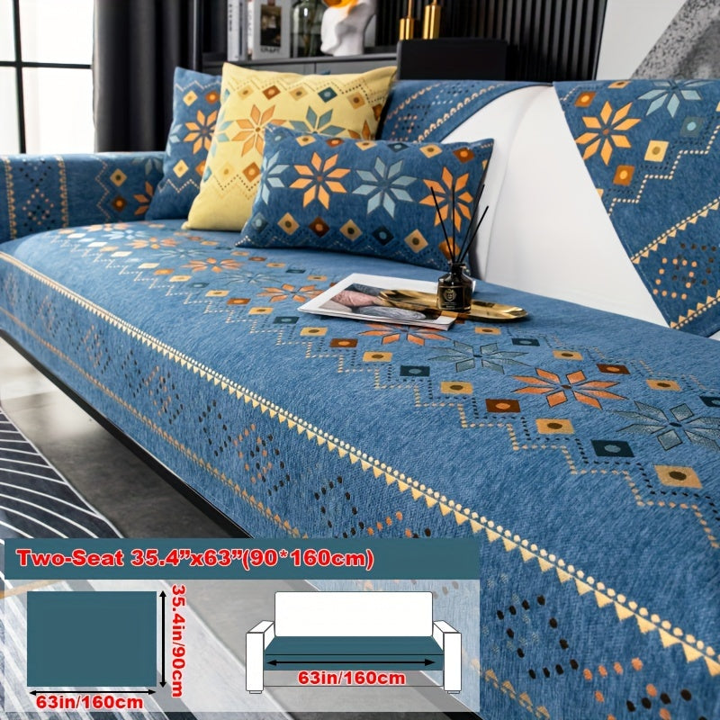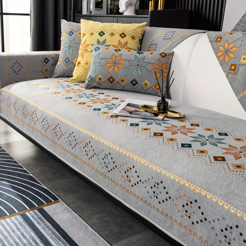 Чехол для дивана из шенилла "Богемные четыре сезона" с геометрическим вышитым узором, обеспечивает защиту дивана и противоскользящие свойства для домашнего декора в спальне, офисе и гостиной.