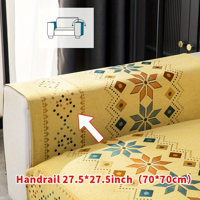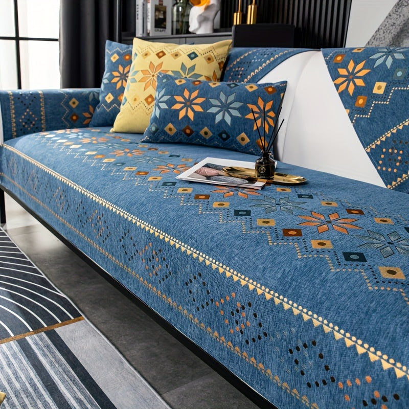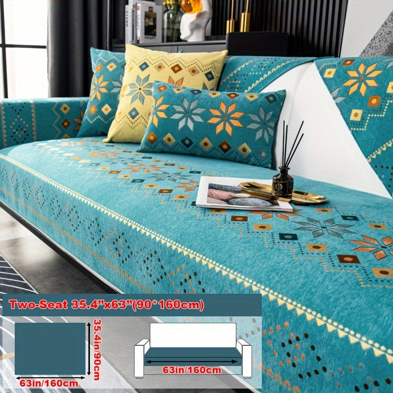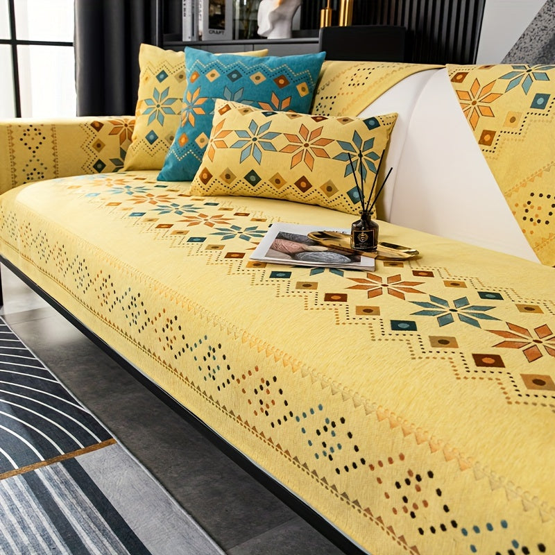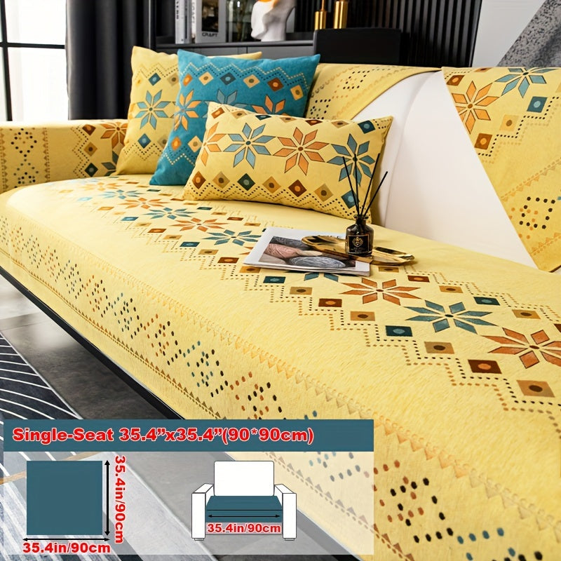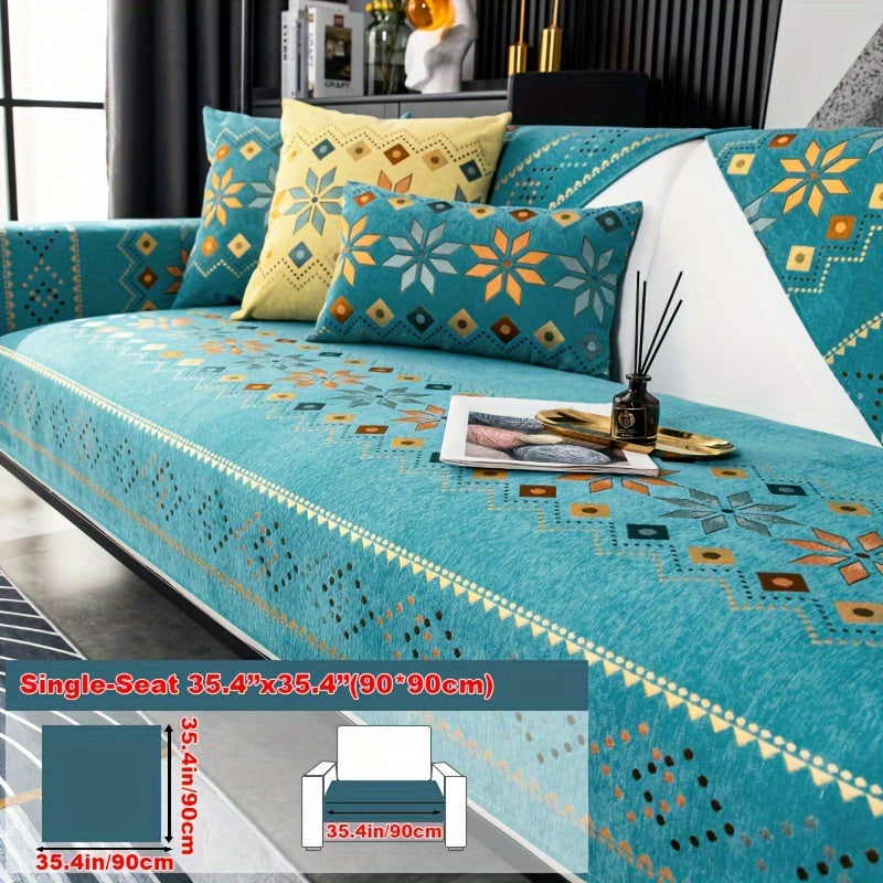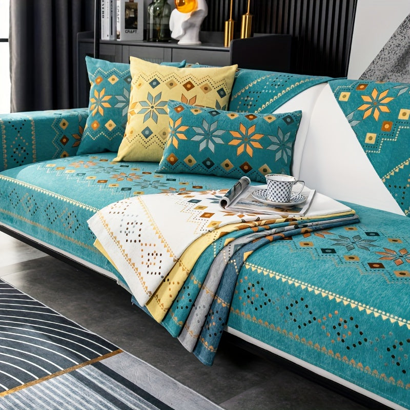 Чехол для дивана из шенилла "Богемные четыре сезона" с геометрическим вышитым узором, обеспечивает защиту дивана и противоскользящие свойства для домашнего декора в спальне, офисе и гостиной.