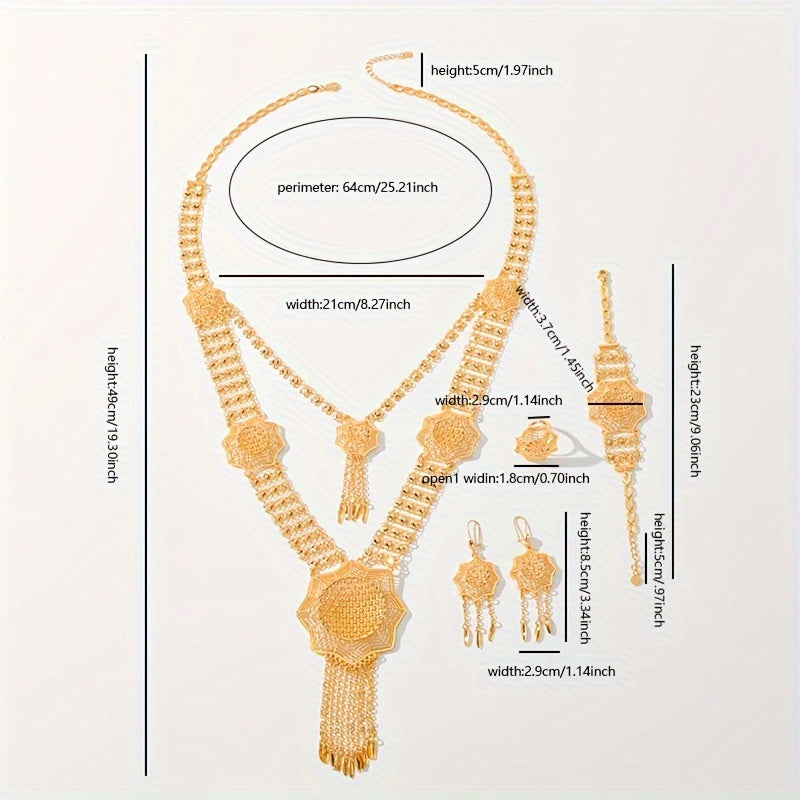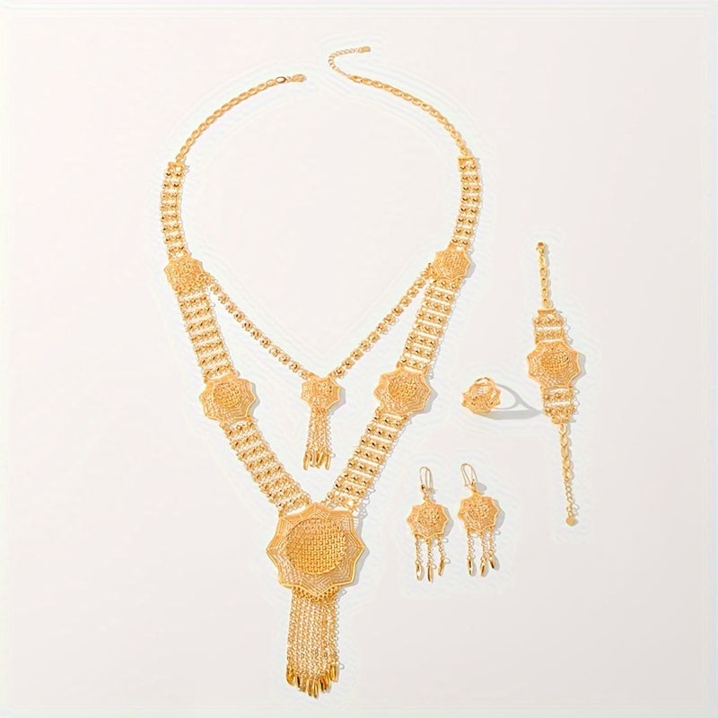 Богемный роскошный набор ювелирных изделий из меди с золотым покрытием - включает в себя ожерелье, серьги, браслет и кольцо, идеально подходящие для свадеб, фестивалей, Рамадана и повседневной носки.