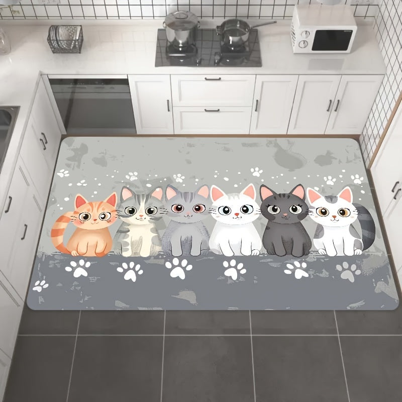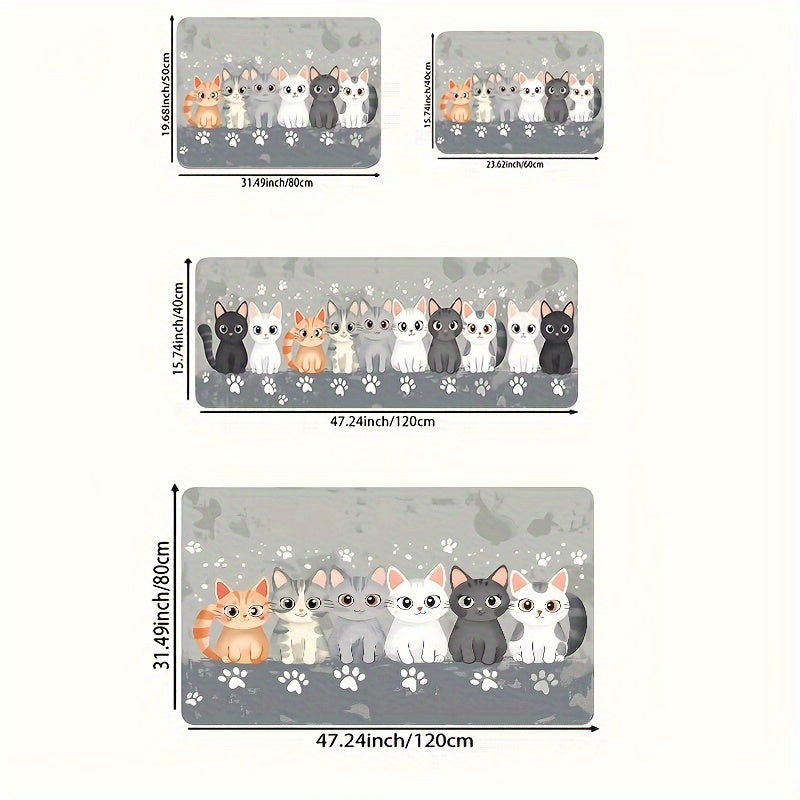Коврик для пола с отпечатками лап мультяшного кота, машинная стирка, с нескользящей основой. Очаровательный дизайн в сером цвете с белыми отпечатками лап. Идеально подходит для кухни, ванной или прихожей.