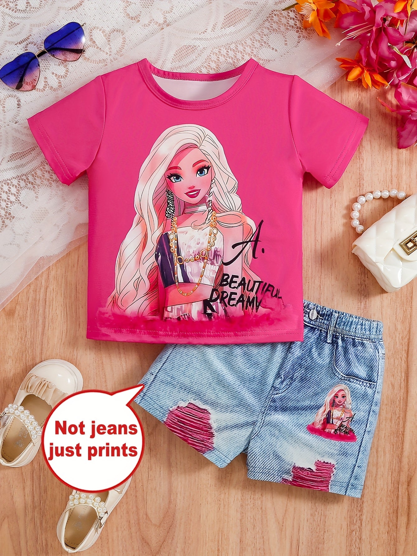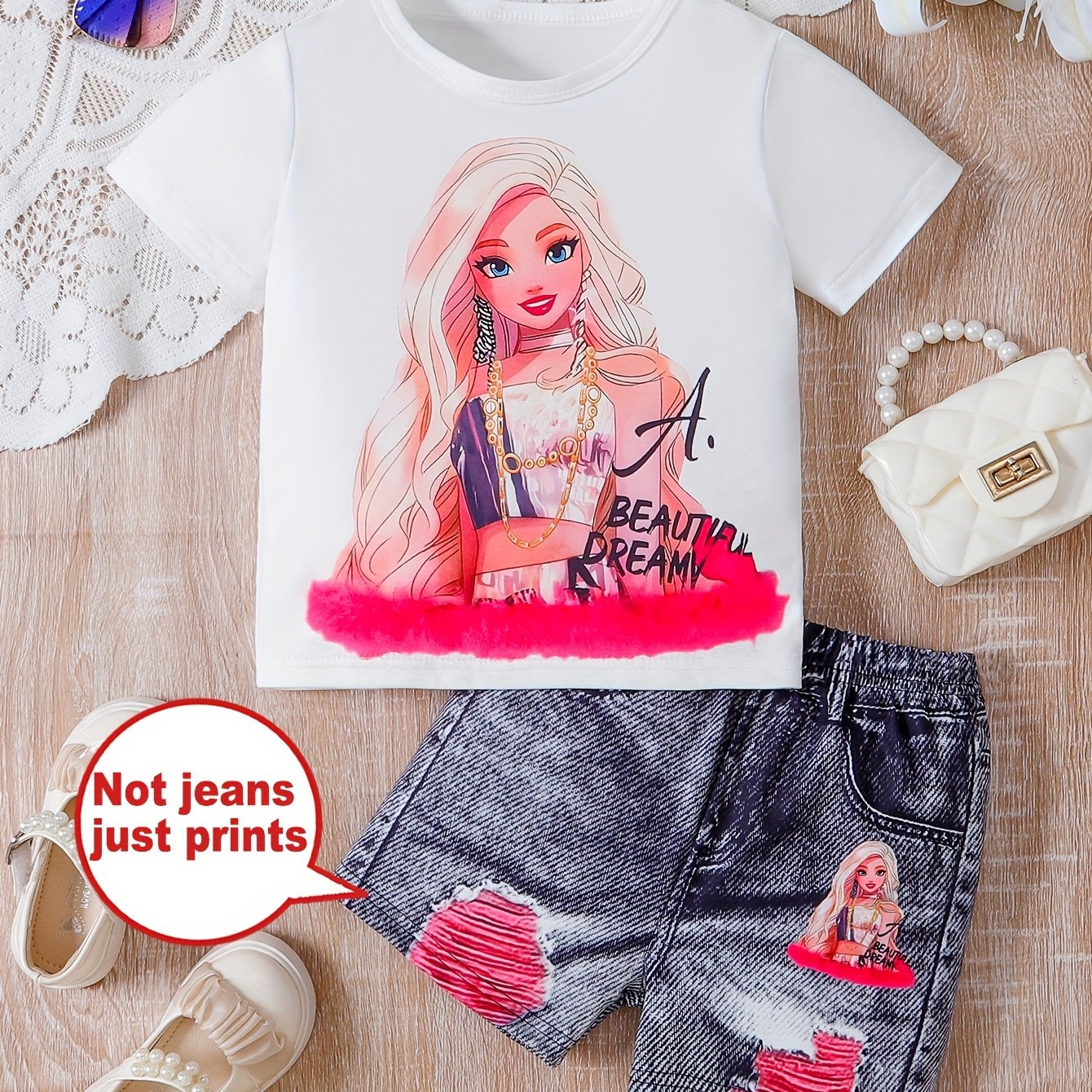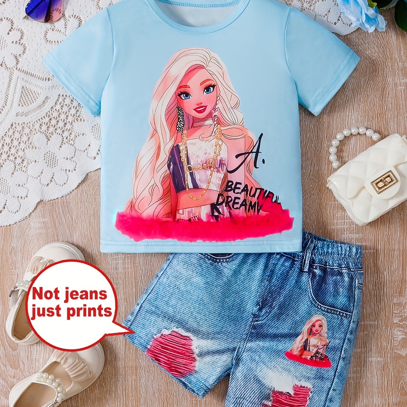 Летний комплект для девочек: топ с коротким рукавом с мультяшным принтом и шорты с графическим дизайном для активного отдыха