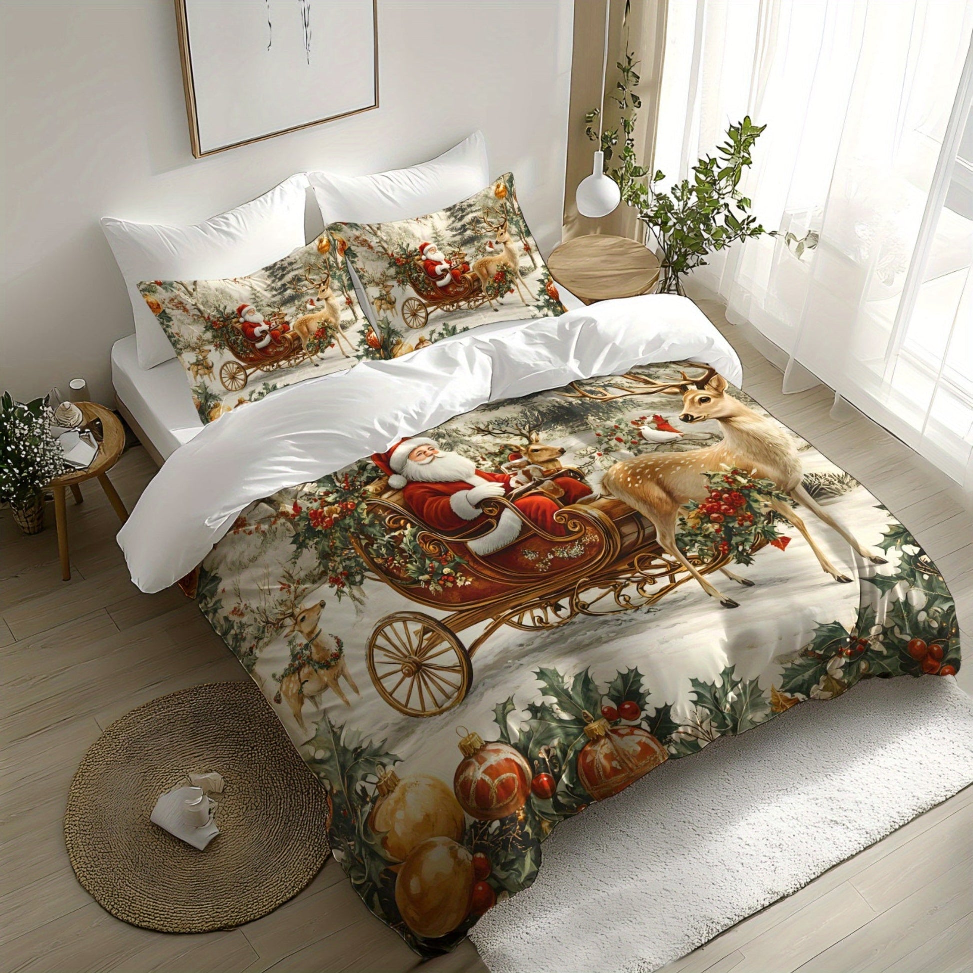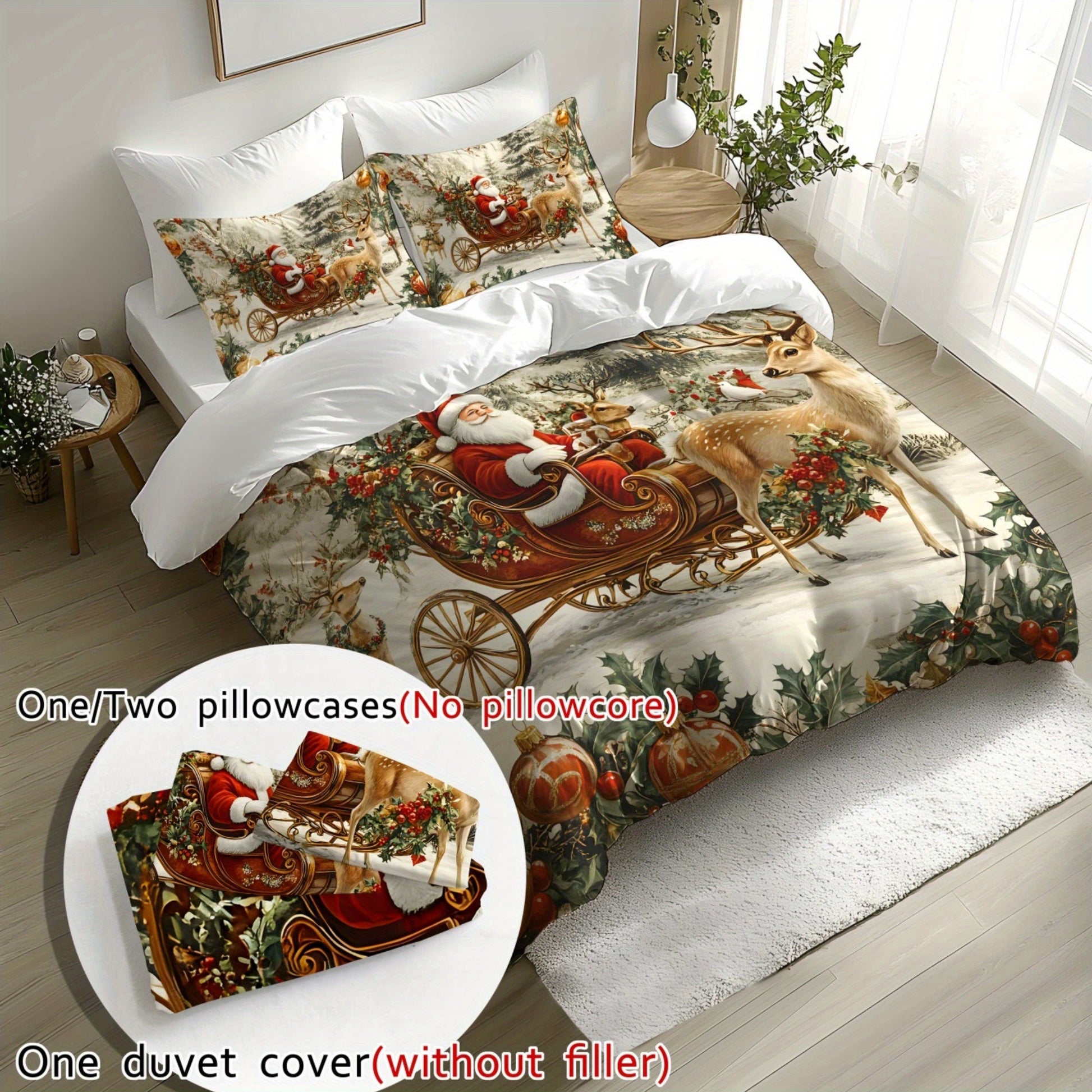 Комплект покрывала с рождественской тематикой включает в себя трехмерное супер мягкое флисовое покрывало с цифровым рисунком Санта-Клауса, сани, оленей, снеговика, снежинки и подарков. В комплект входят 1 покрывало и 1 или 2 наволочки. Ткань является