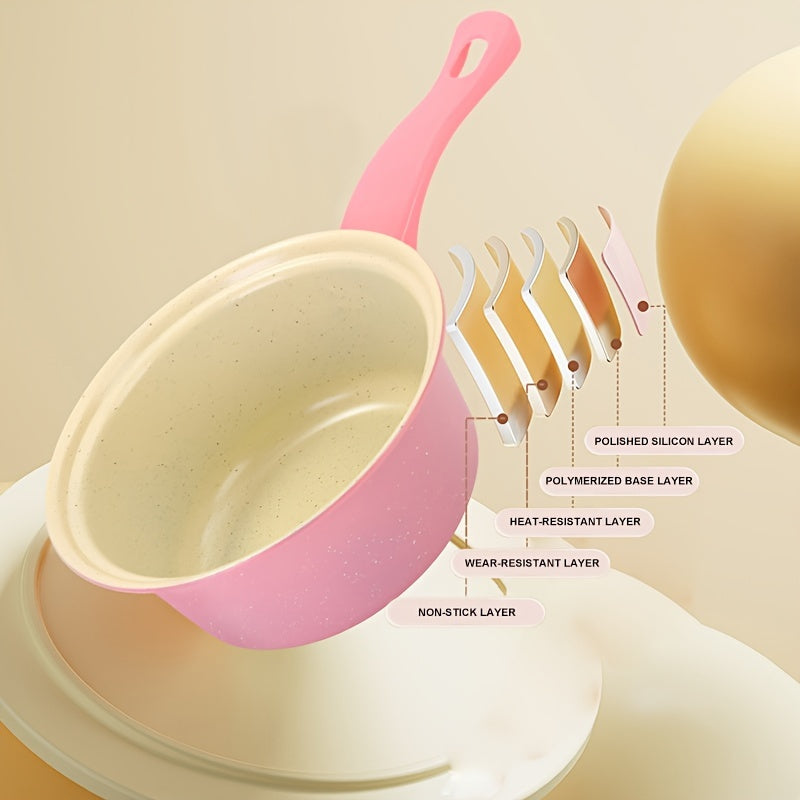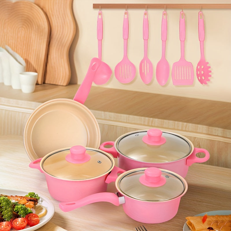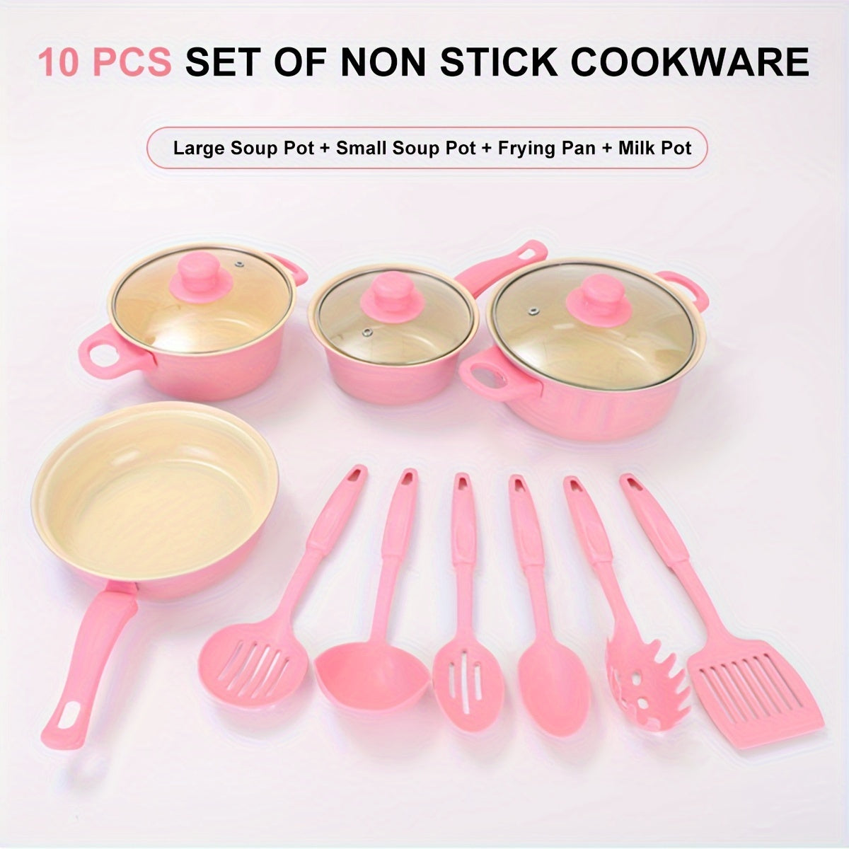 Комплект посуды с антипригарным покрытием - включает 10 предметов чугунных кастрюль и сковородок с крышками, силиконовые принадлежности, идеально подходит для индукционных плит и праздничной готовки - розовый