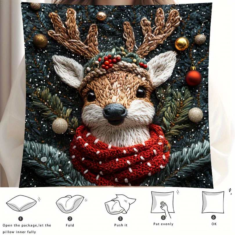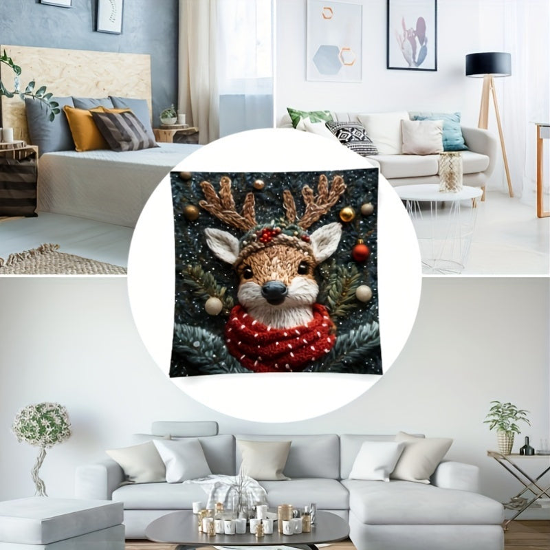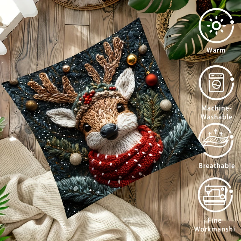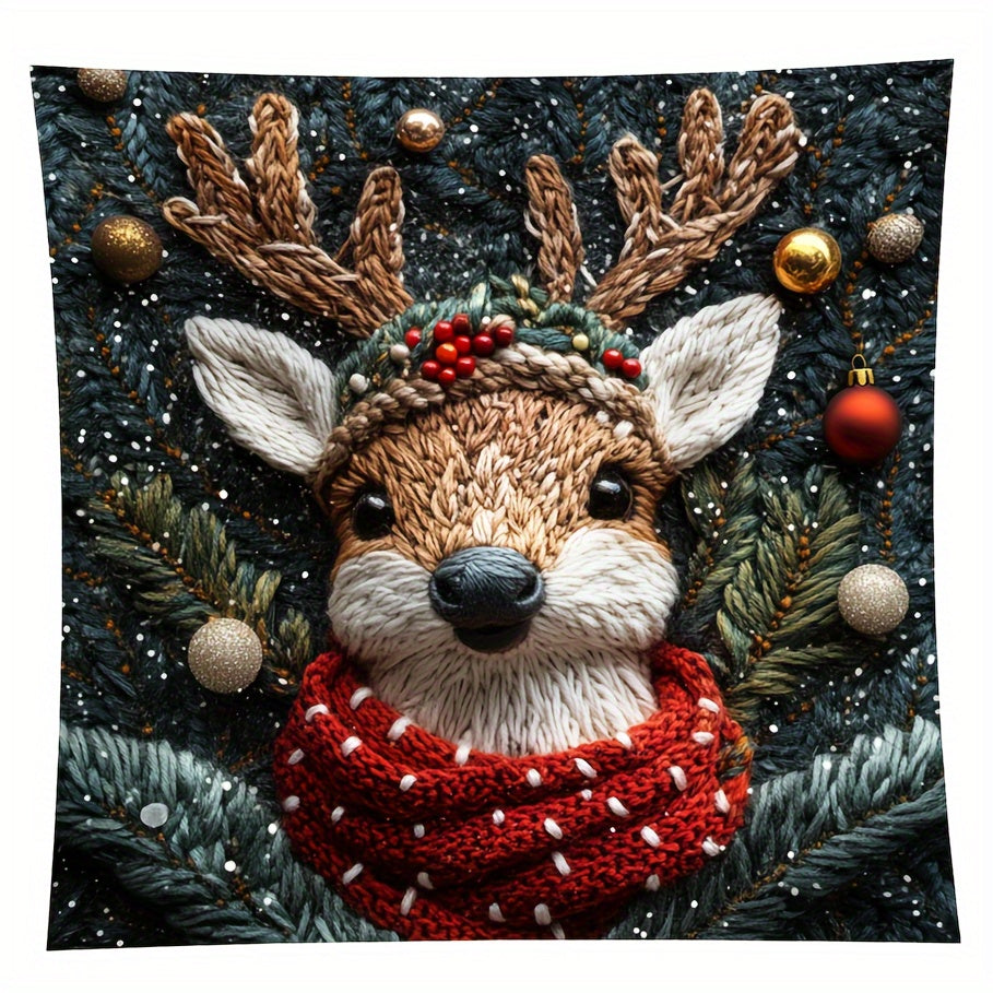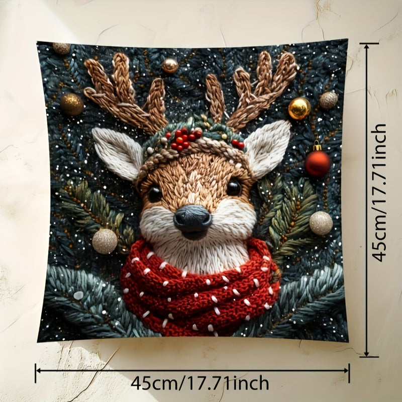 Современная стильная подушка с рождественской шапкой оленя, размер 44,96x44,96 см. Изготовлена из тканого полиэстера с скрытой молнией. Машинная стирка, гипоаллергенная. Подходит для декора дивана в гостиной и спальне.