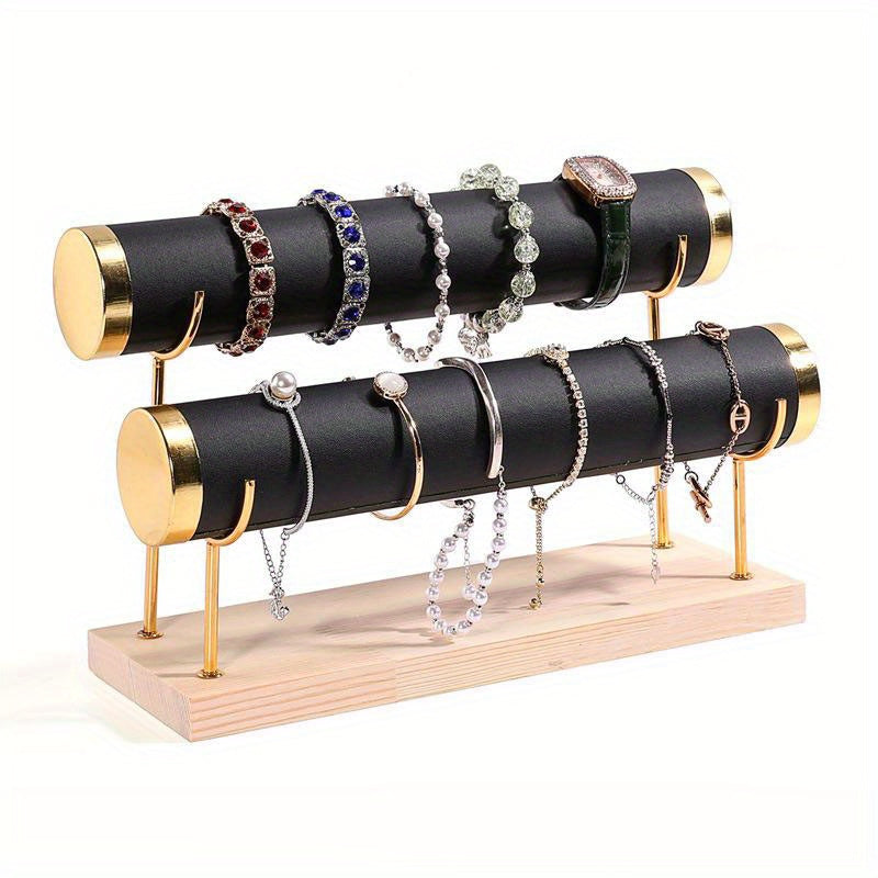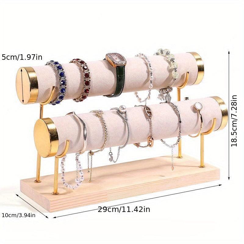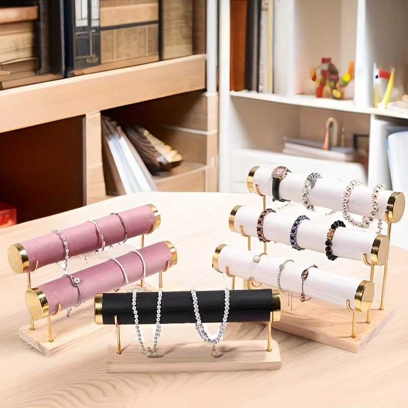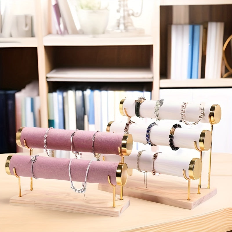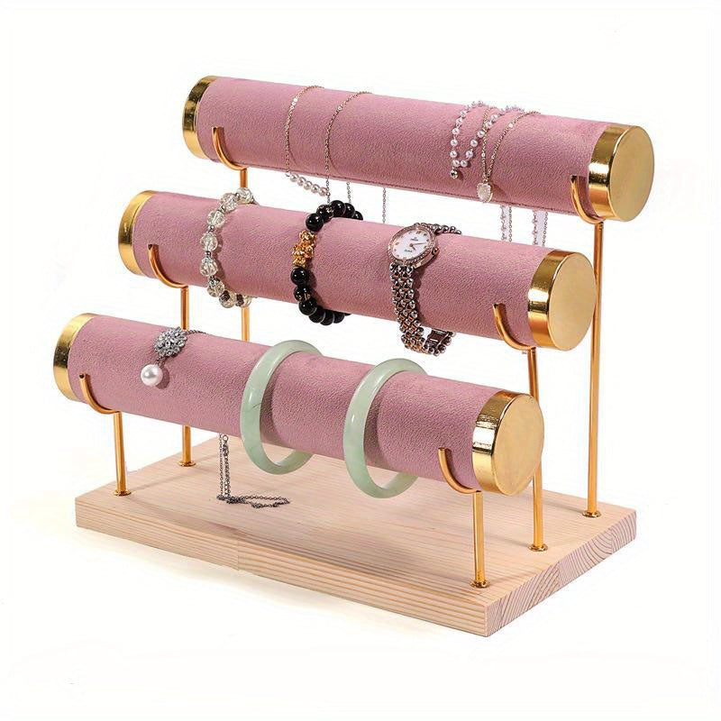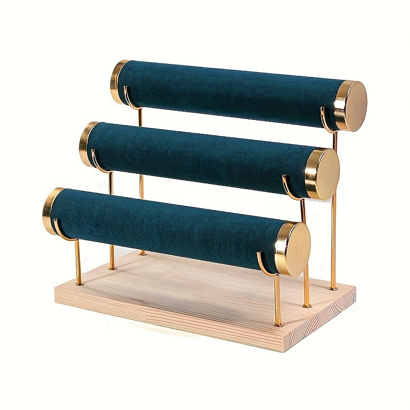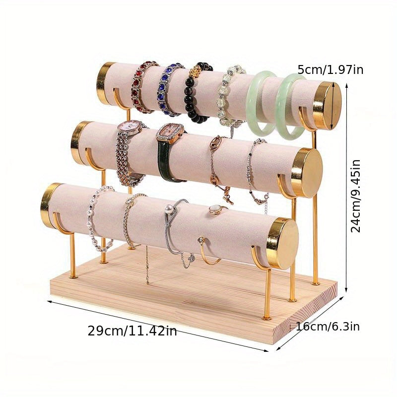 Стильная трехъярусная подставка для украшений в золотистом оттенке с деревянной основой для часов и аксессуаров