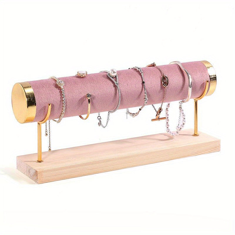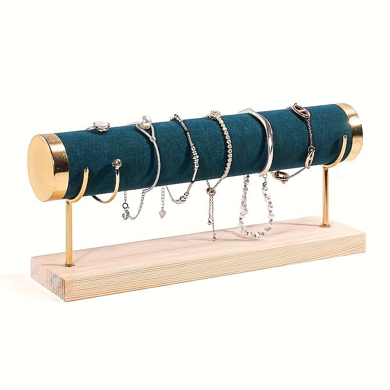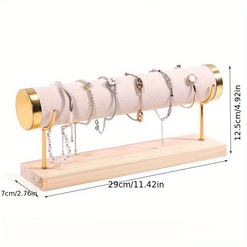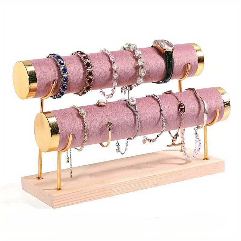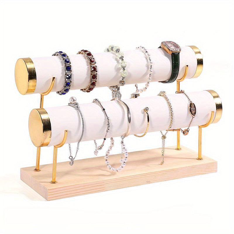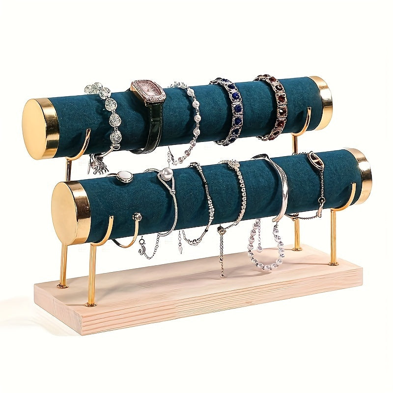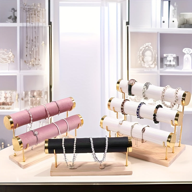 Стильная трехъярусная подставка для украшений в золотистом оттенке с деревянной основой для часов и аксессуаров