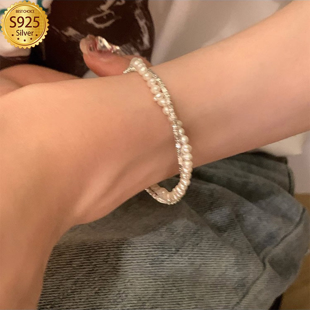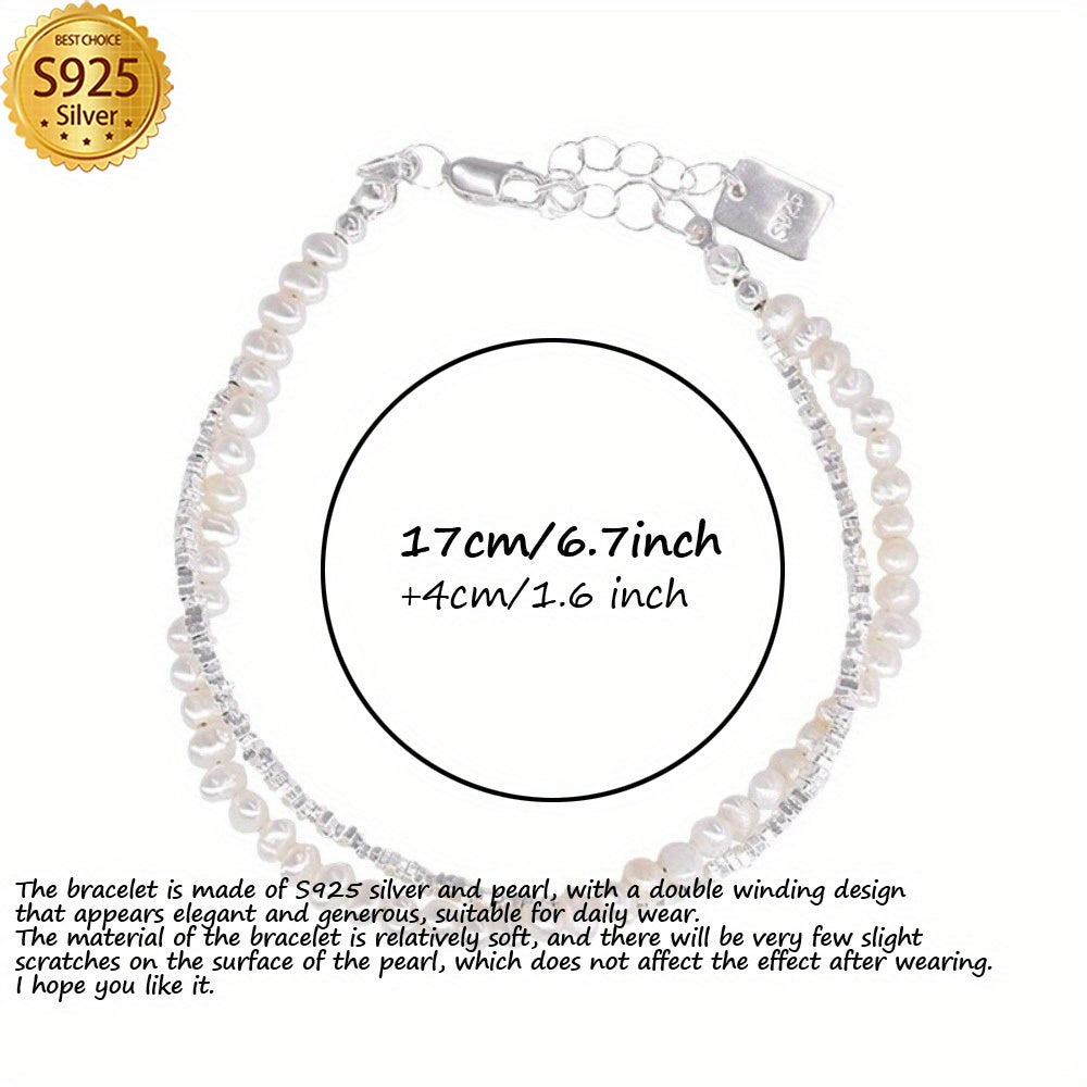 Изысканный браслет из двойной нити жемчуга в стерлинговом серебре S925, элегантный дизайн с разбитыми бусинами, идеально подходит для повседневной носки, отличный подарок для кого-то особенного. Вес: 3.8 г/0.14 унции