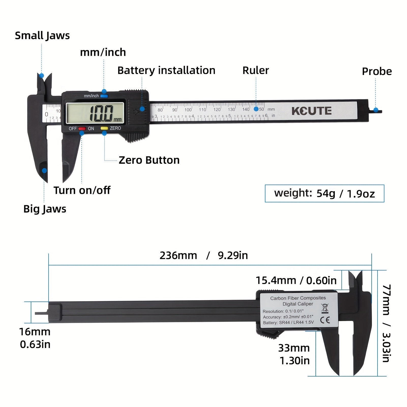 Цифровой штангенциркуль с ЖК-экраном, функцией автоматического отключения, конвертацией дюймов и миллиметров.