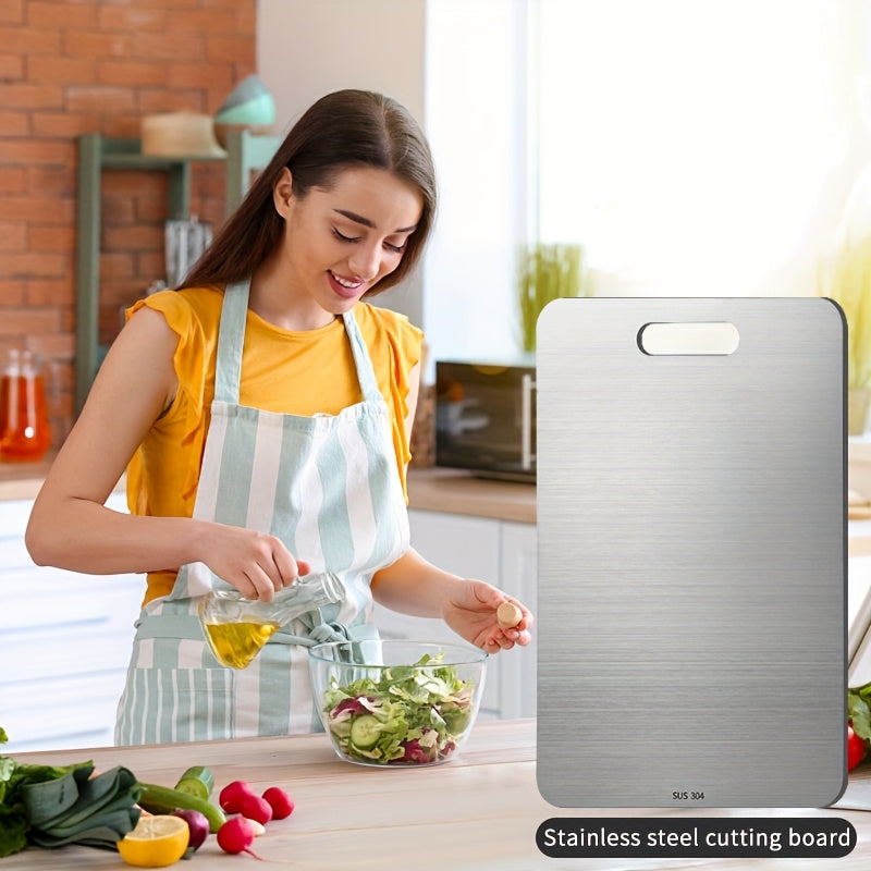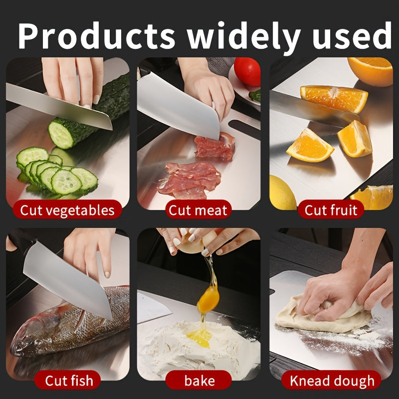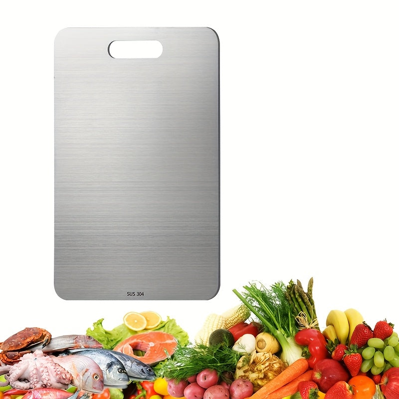 Надежная разделочная доска из нержавеющей стали с двусторонним дизайном, размером 22,99 x 34,04 см. Эта металлическая разделочная доска безопасна для продуктов, легко чистится и подходит для нарезки мяса, овощей и фруктов.