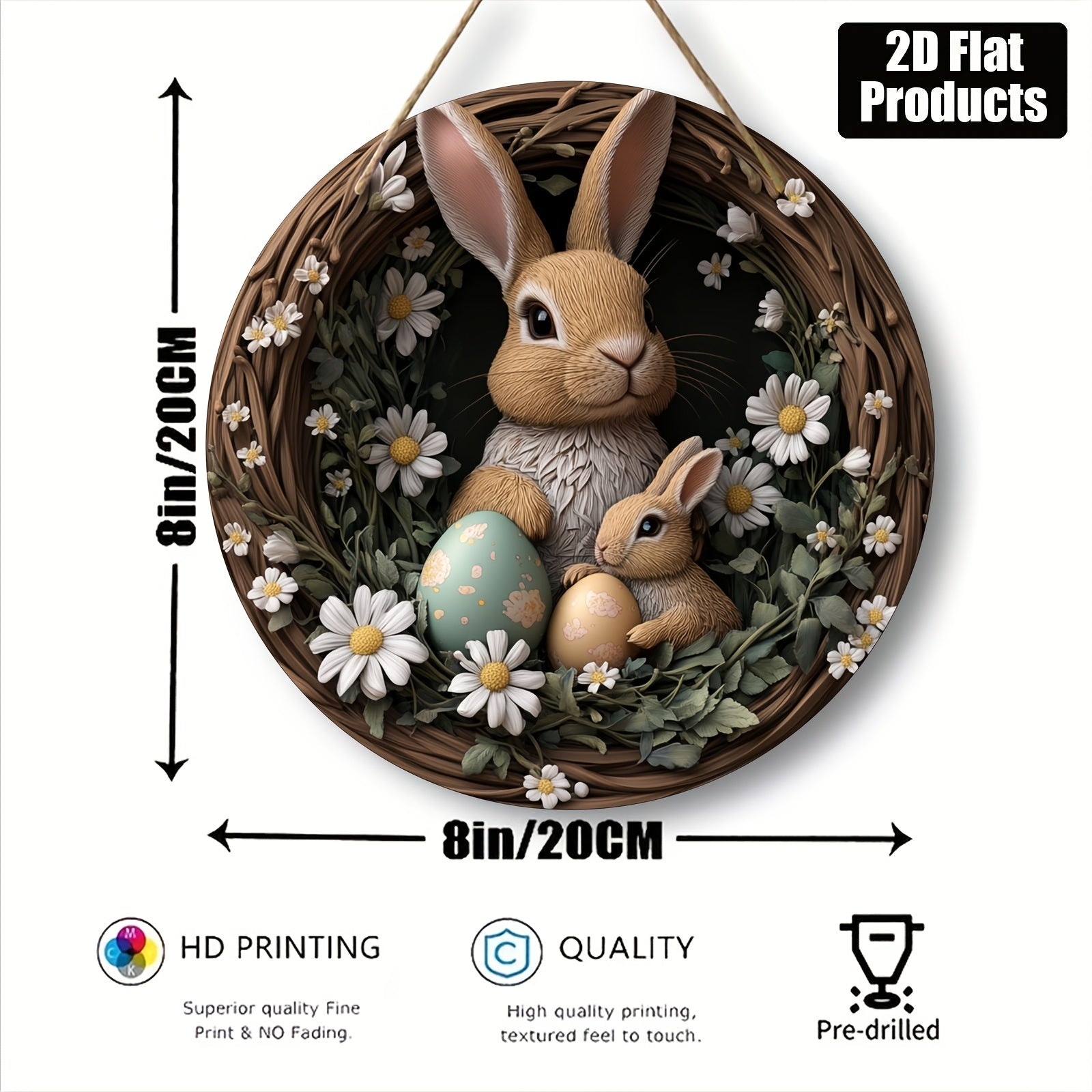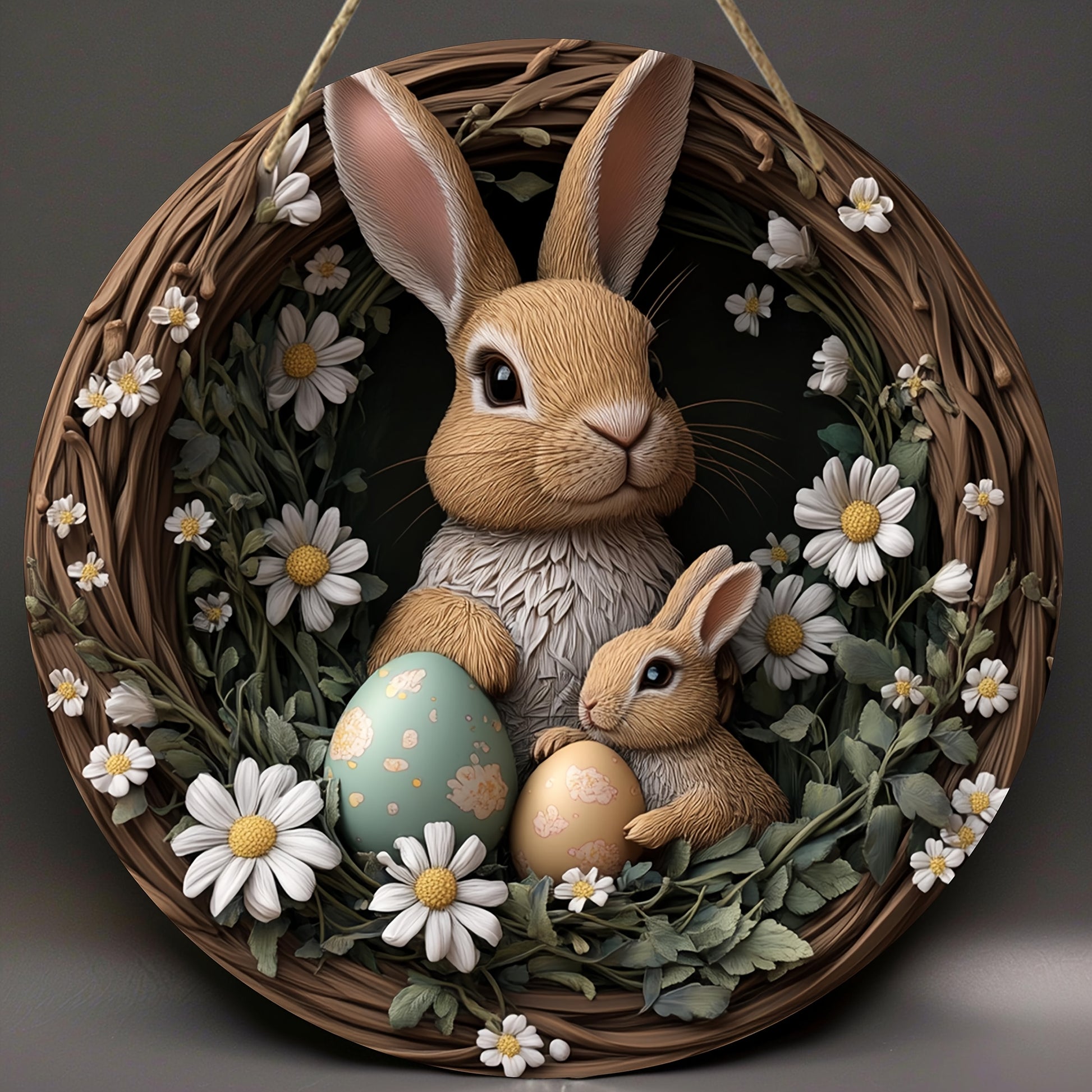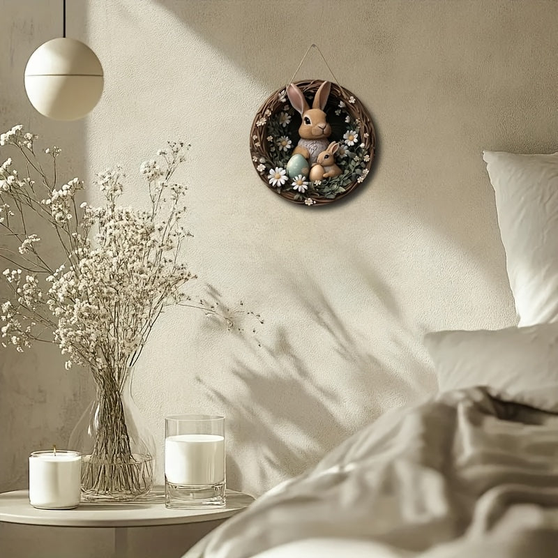 Деревянная висячая табличка "Пасхальный кролик" в богемном стиле с дизайном венка из ромашек для весеннего декора в помещении/на улице.