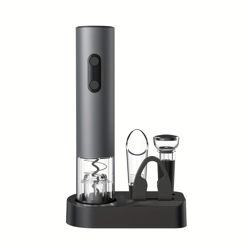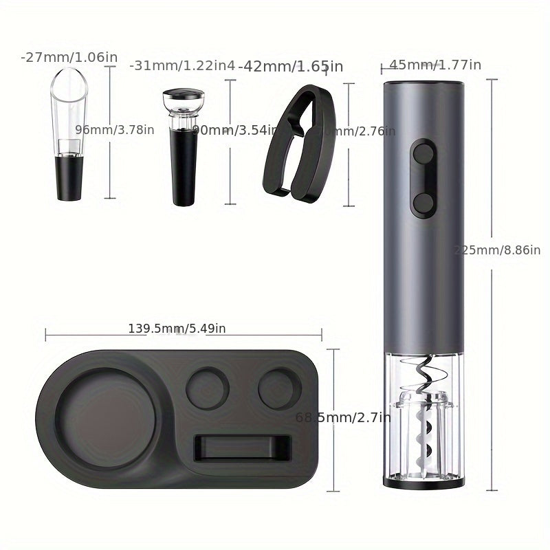 Электрический набор для открытия вина включает автоматический открыватель, штопор, вакуумную пробку и 5 основных инструментов. Размеры: 8,31 см X 7,29 см X 23,19 см.