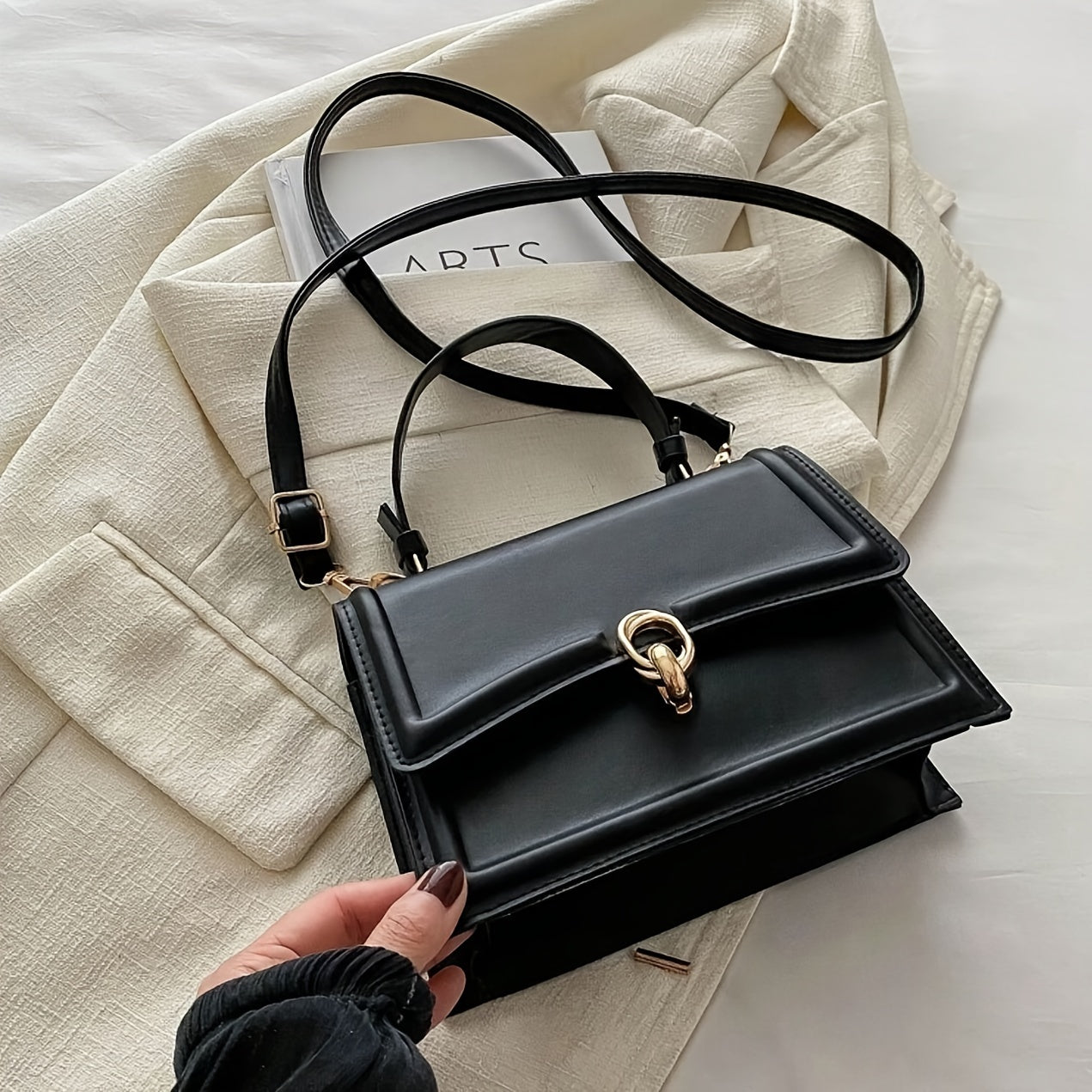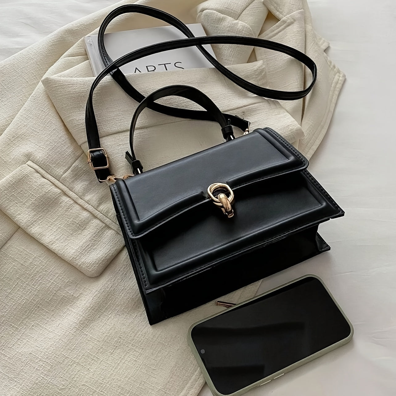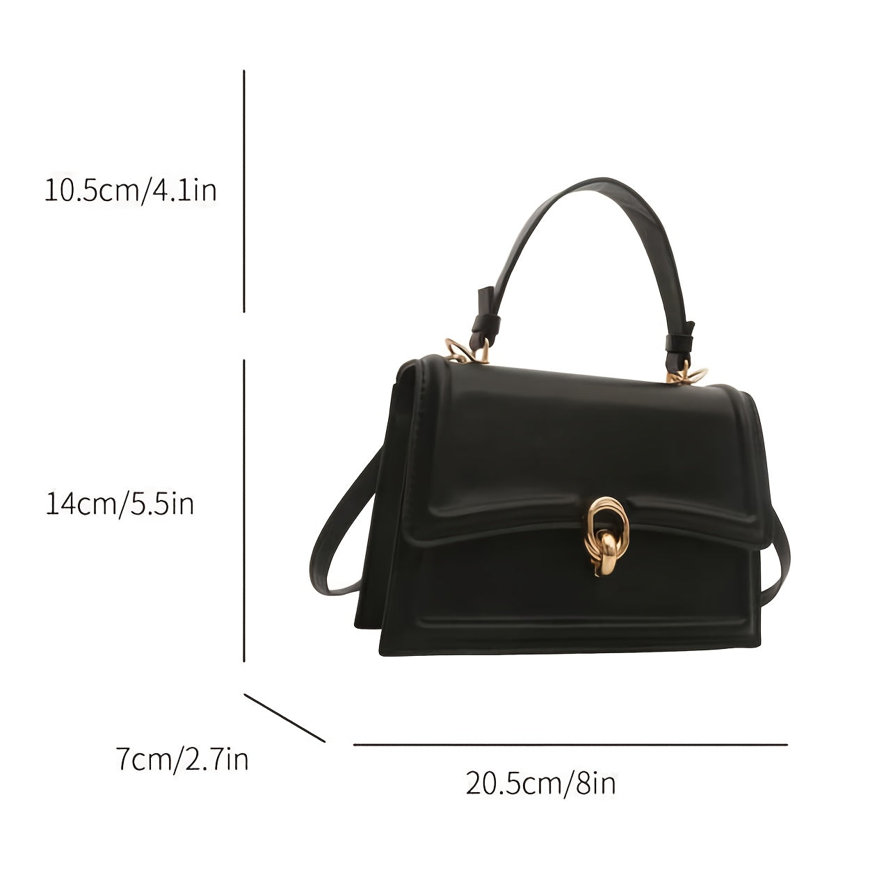 Элегантная черная синтетическая кожаная сумка для женщин с ретро-клапаном, верхней ручкой, замком с поворотом и золотистой фурнитурой. Имеет структурированную прямоугольную форму, регулируемый ремень.
