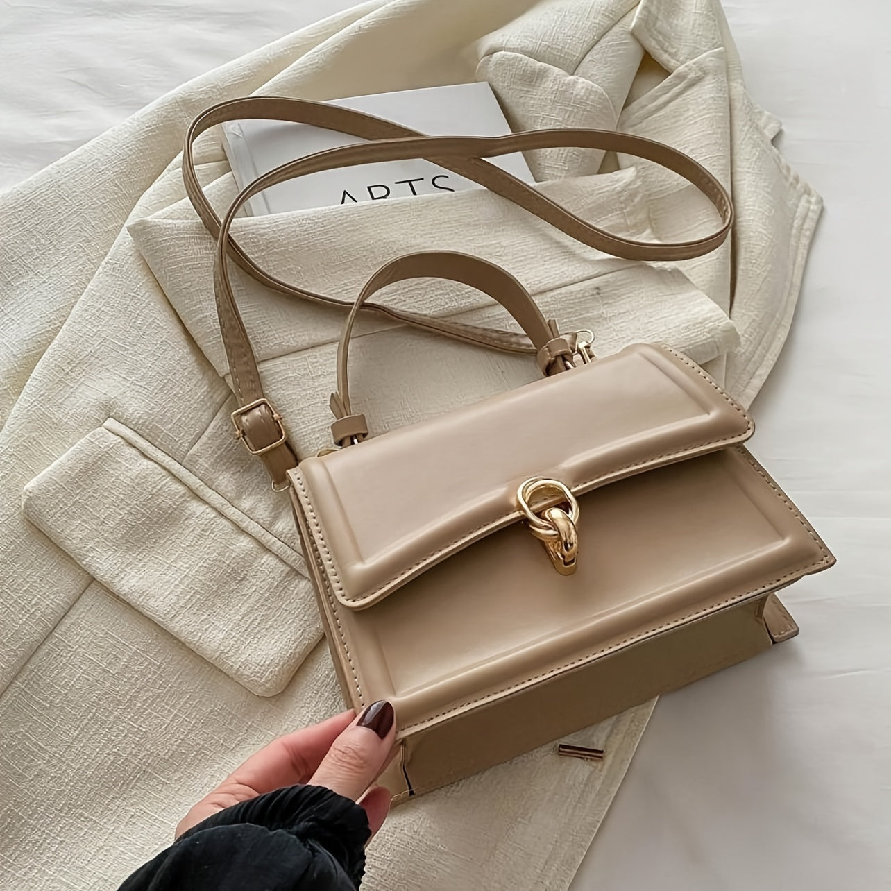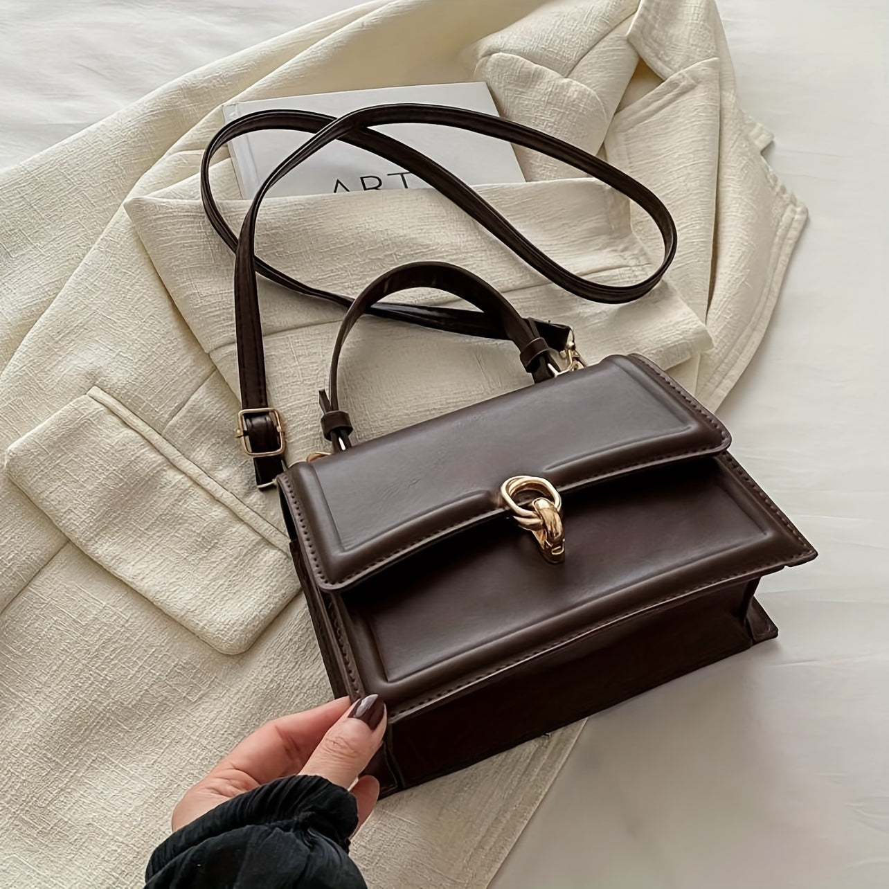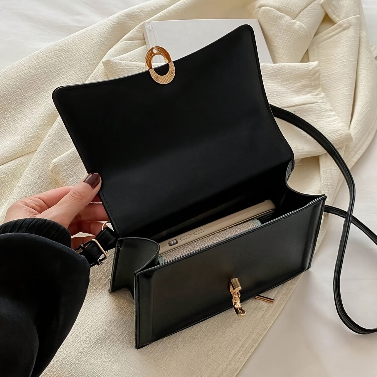 Элегантная черная синтетическая кожаная сумка для женщин с ретро-клапаном, верхней ручкой, замком с поворотом и золотистой фурнитурой. Имеет структурированную прямоугольную форму, регулируемый ремень.