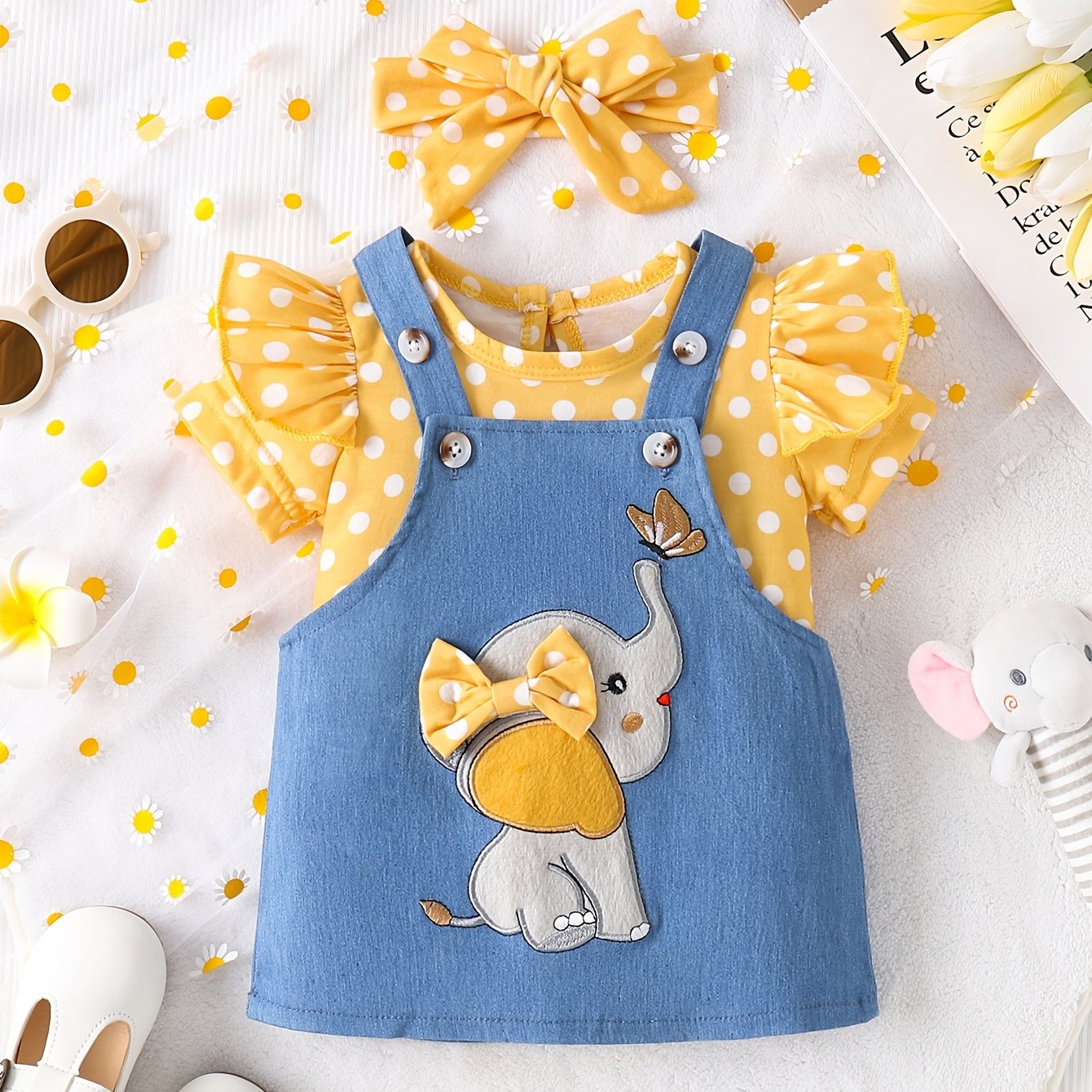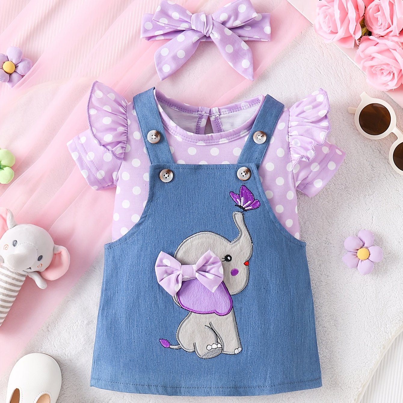 Комплект для девочек: комбинезон и юбка с рисунком слона в розовом и синем, мягкая вязаная ткань, пригодна для машинной стирки