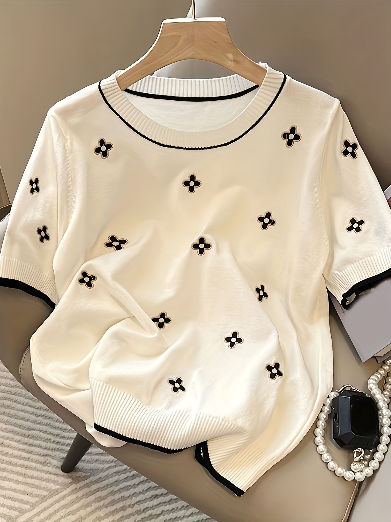 Вязаный свитер с вышивкой и круглым вырезом для женщин в контрастных цветах.