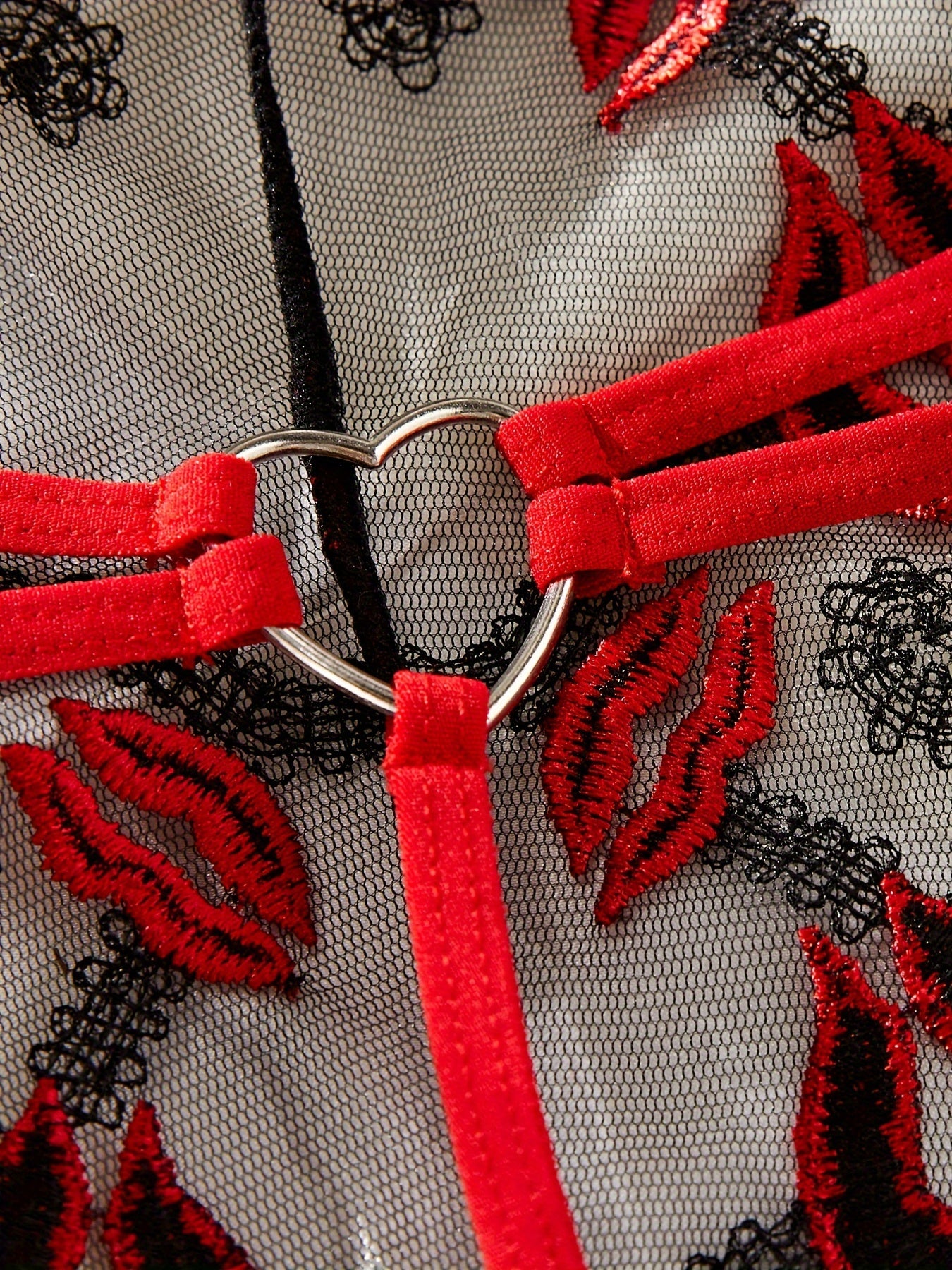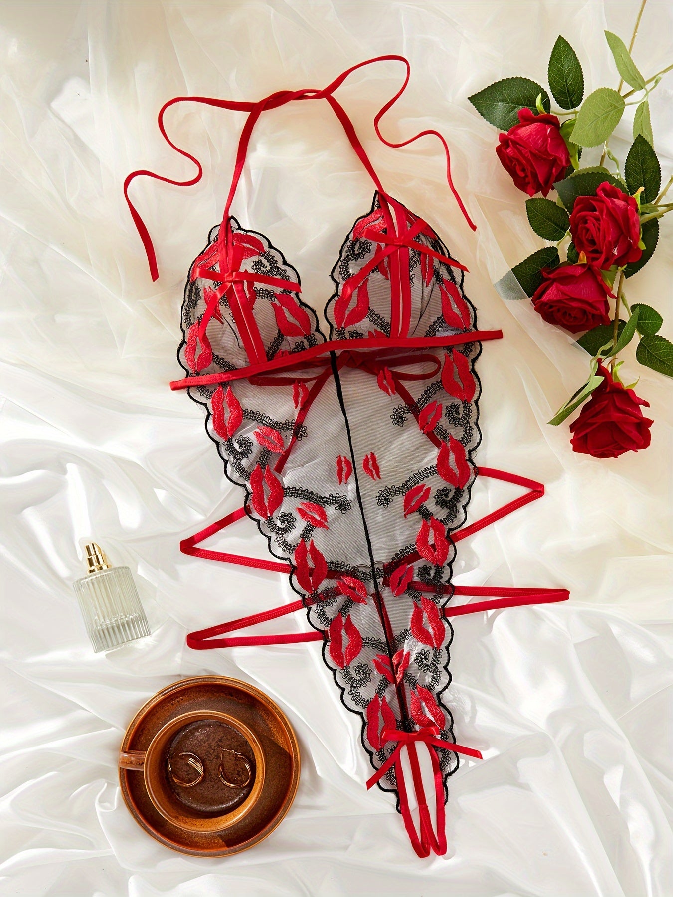 Вышитый сетчатый тедди, цветной халтер-боди с открытым шагом - женское нижнее белье.