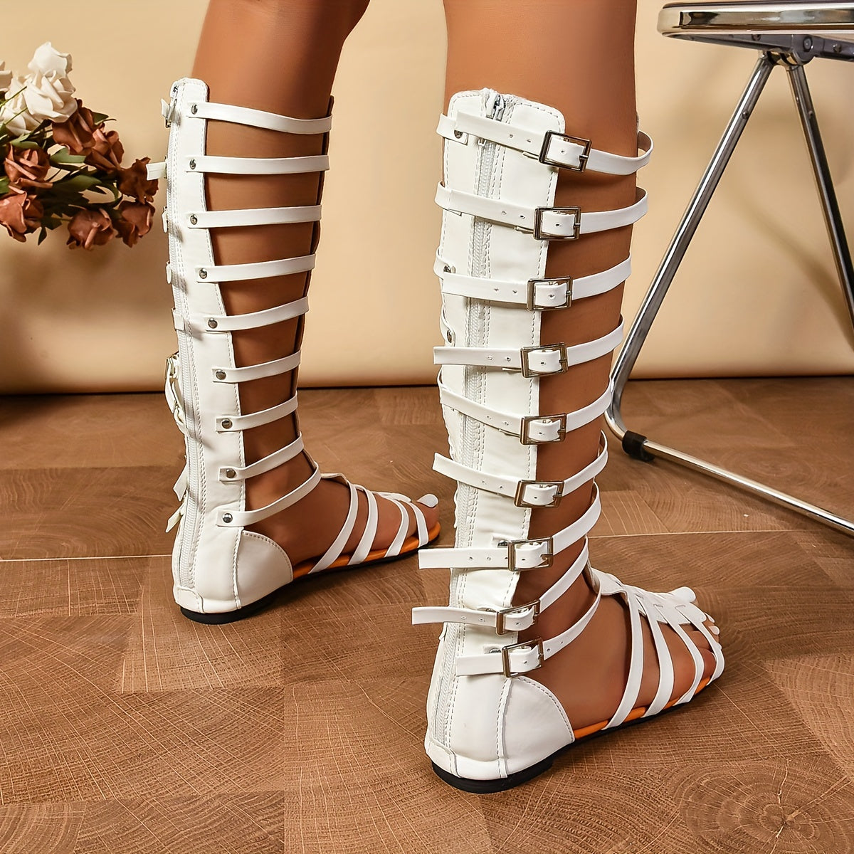Модные плоские сандалии для женщин с металлическим ремешком до колена и застежкой на пряжку.