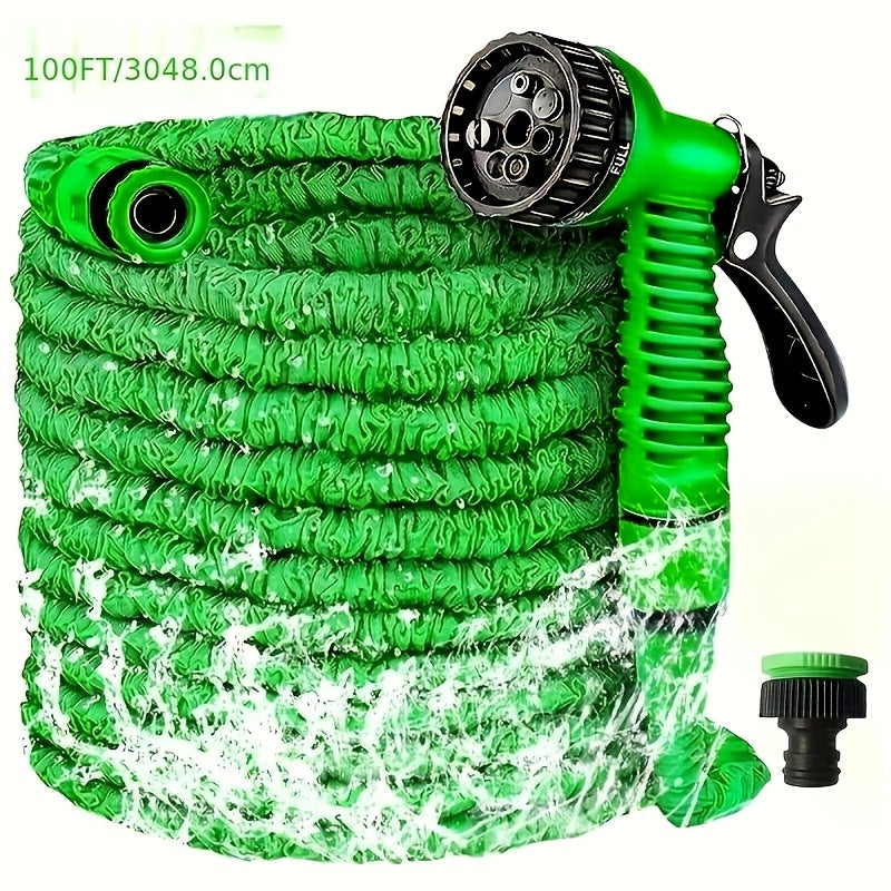 Гибкий зеленый садовый шланг с насадкой высокого давления и соединителем для различных наружных применений, таких как полив, мойка автомобилей и чистка домашних животных. Доступен в длинах 22,86 м, 30,48 м и