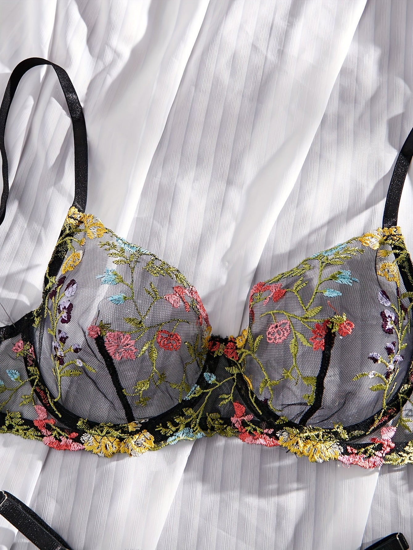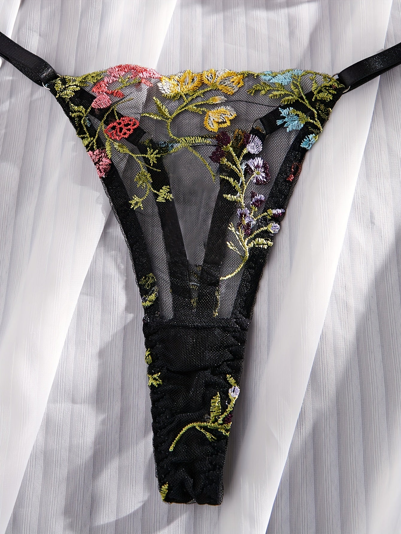 Флоральный вышитый комплект нижнего белья с полупрозрачным собранным бюстгальтером и стрингами для сексуального и свежего образа.