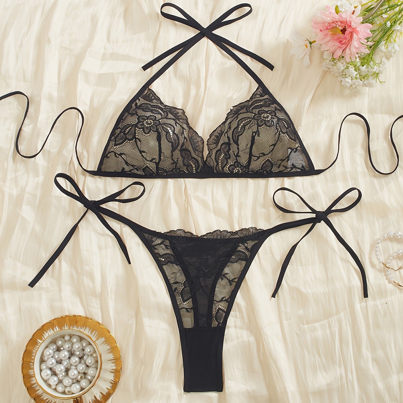 Кружевной халтерный комплект нижнего белья с полупрозрачным бюстгальтером и стрингами, сексуальный и удобный для женщин