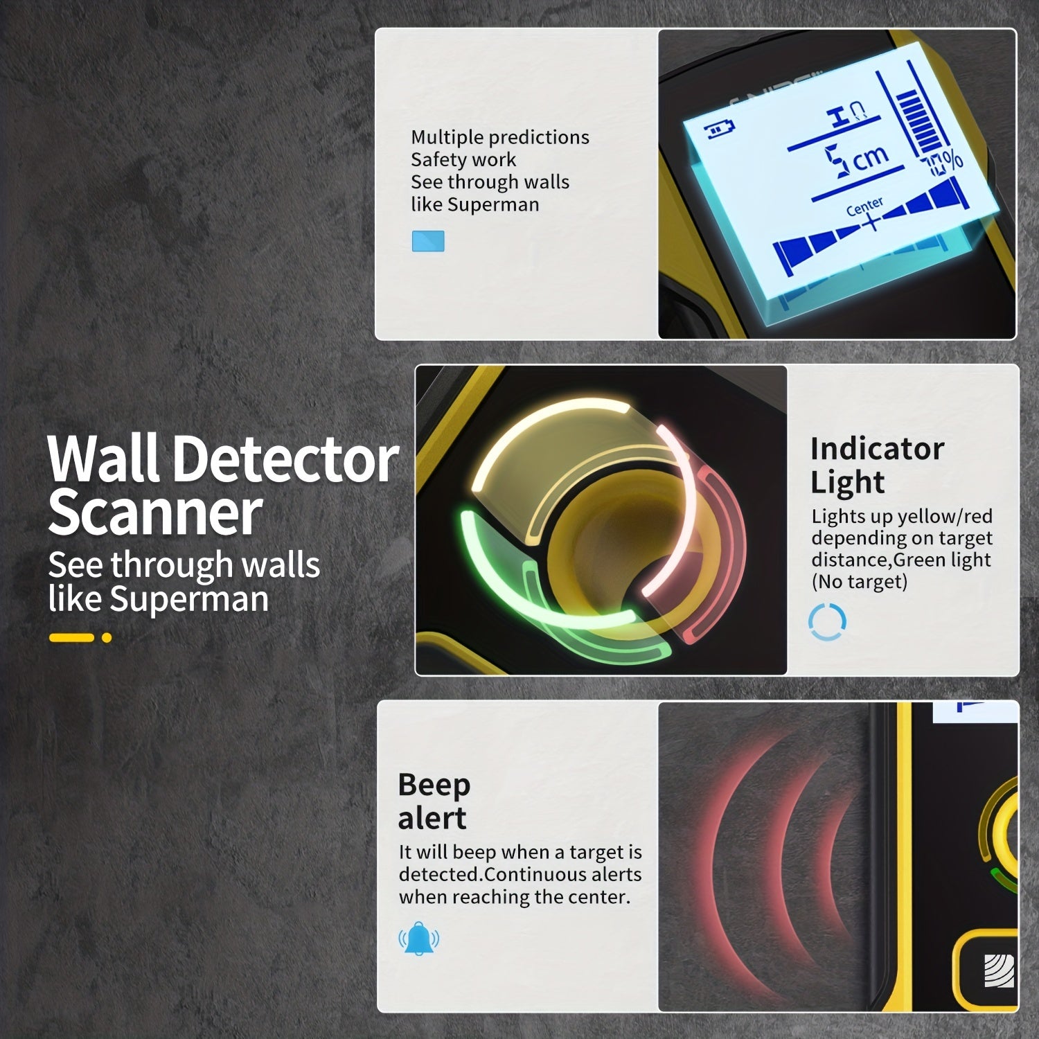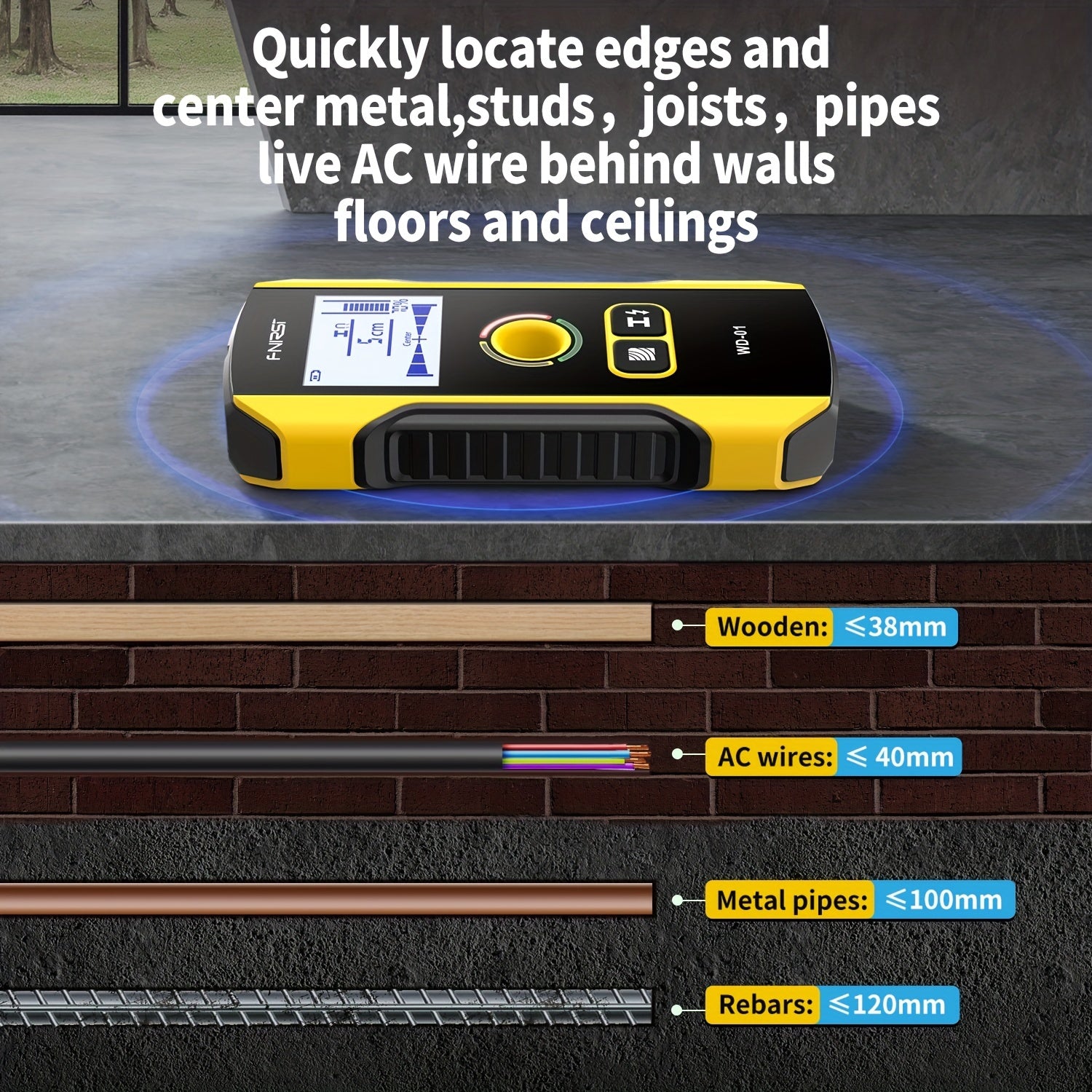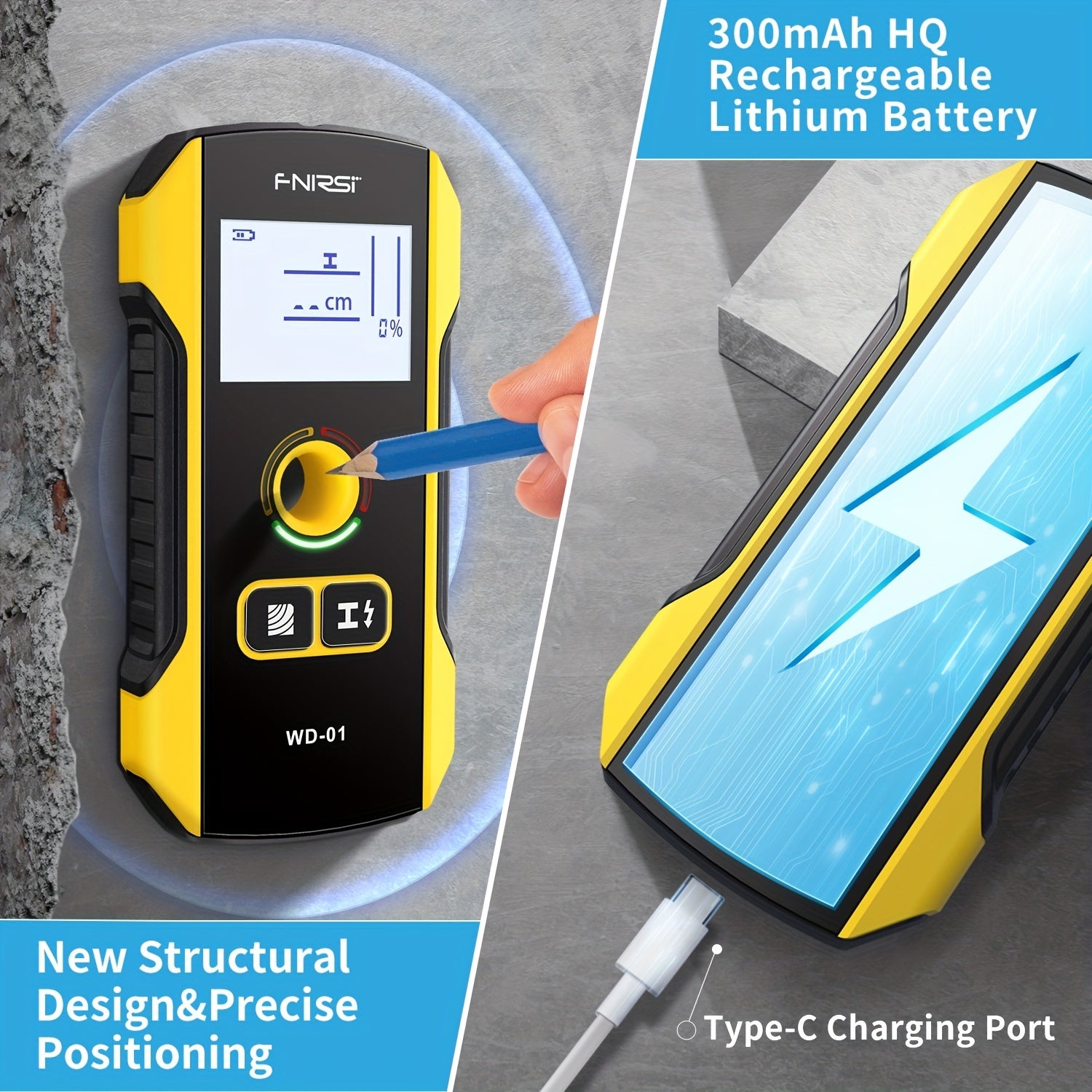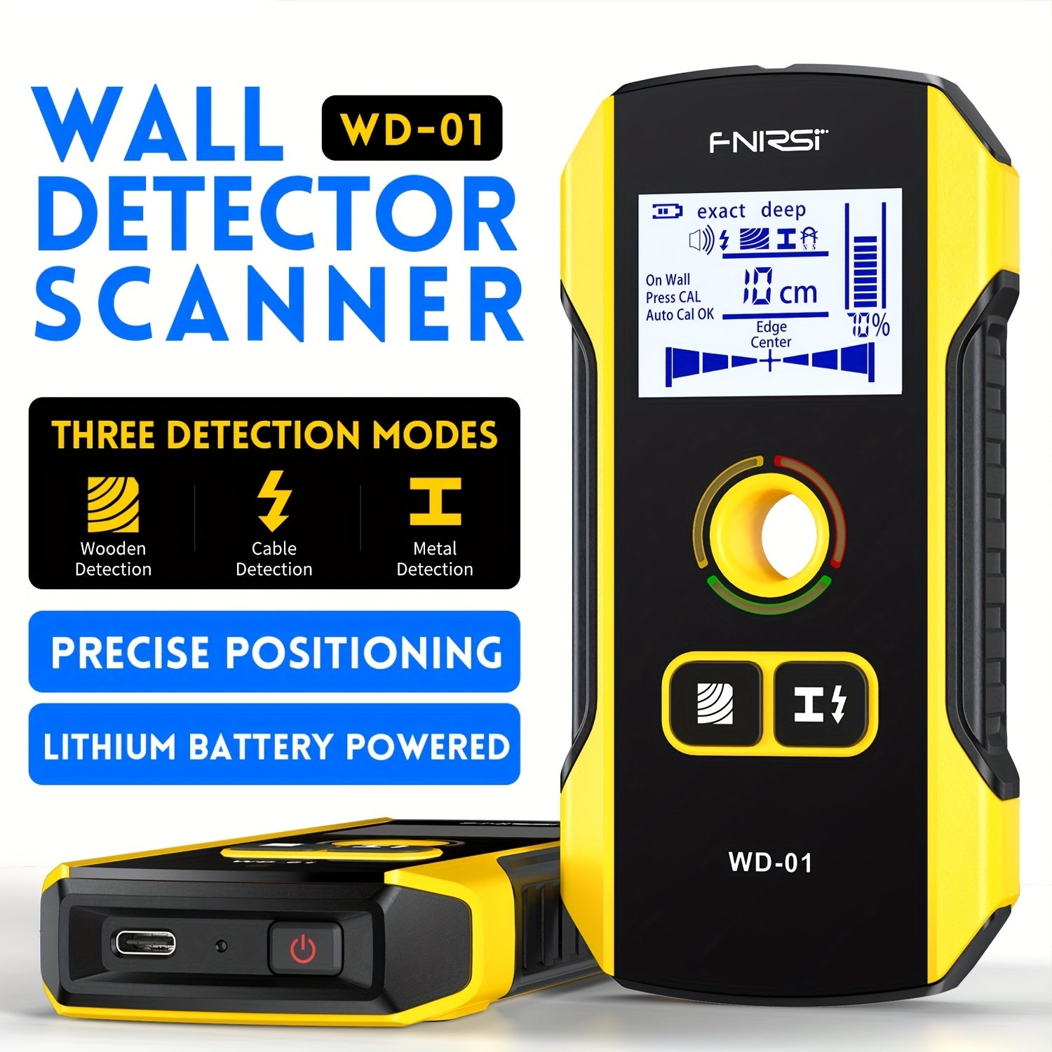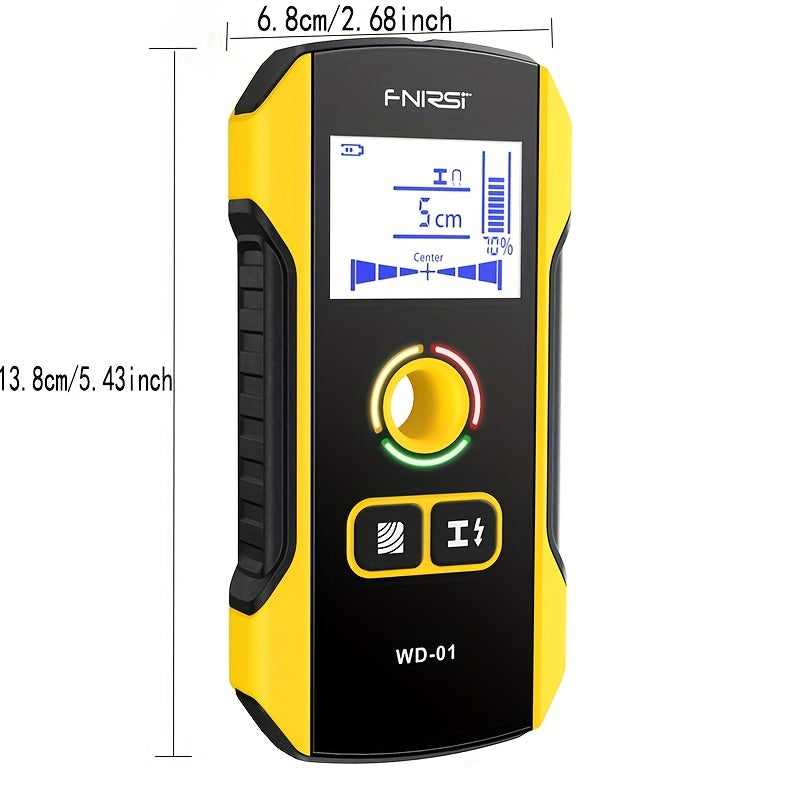 FNIRSI WD-01 Стеновой детектор-сканер с LED цифровым дисплеем и USB зарядкой. Точность измерения 0,1 для строительства. Обнаруживает AC живые кабели и металлические/деревянные стойки. Изготовлен из черного ABS.