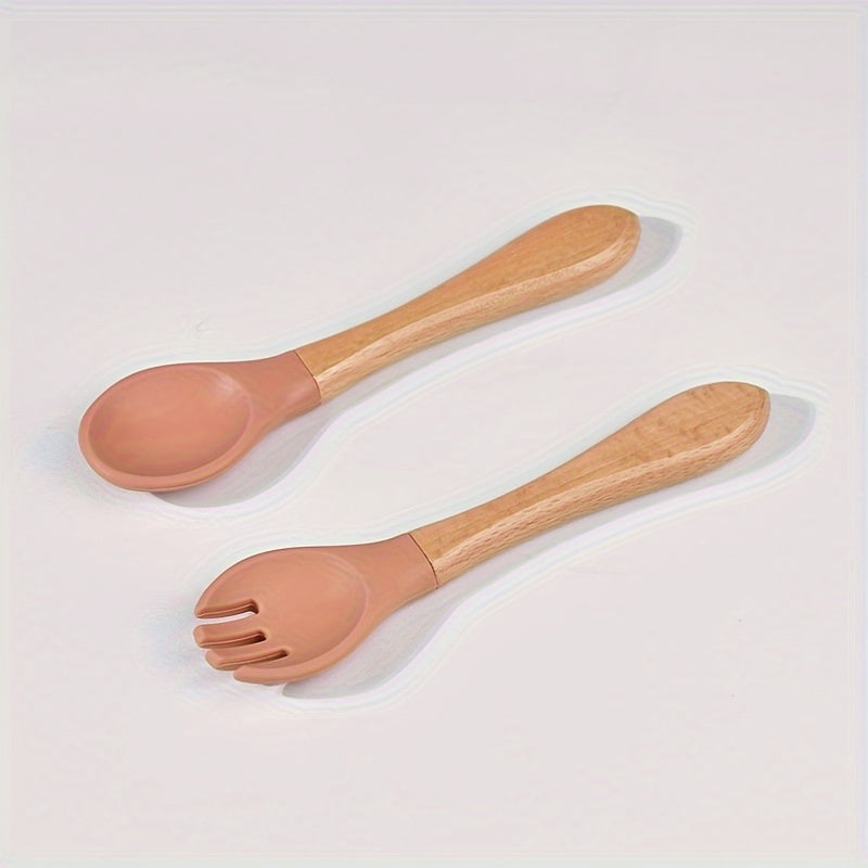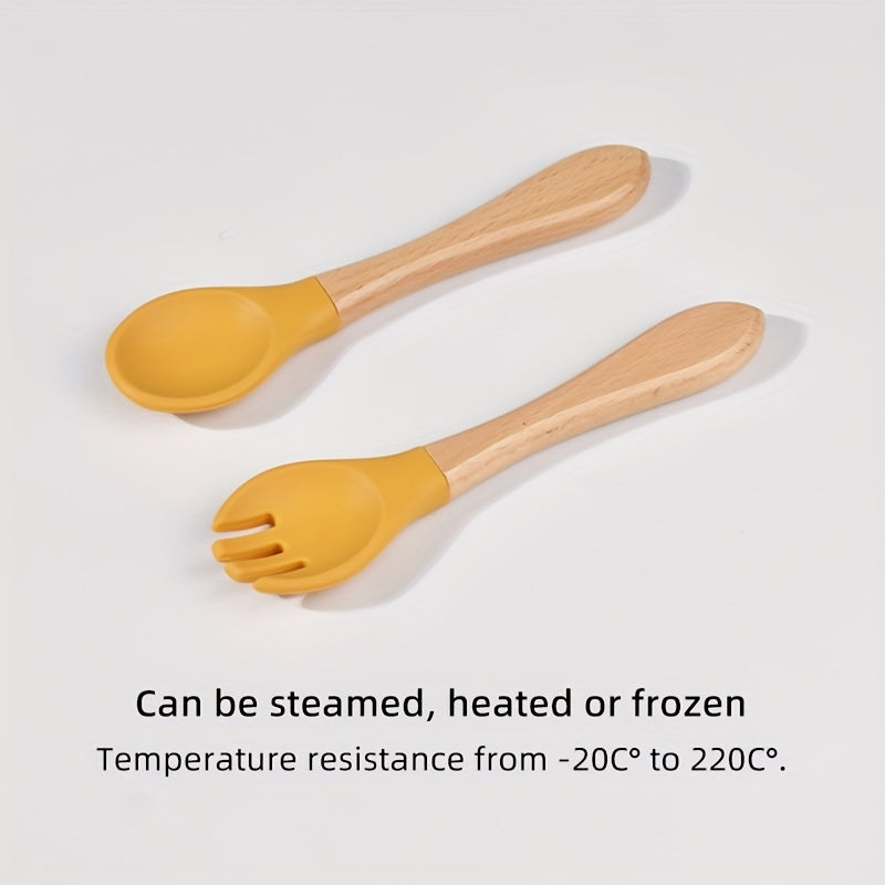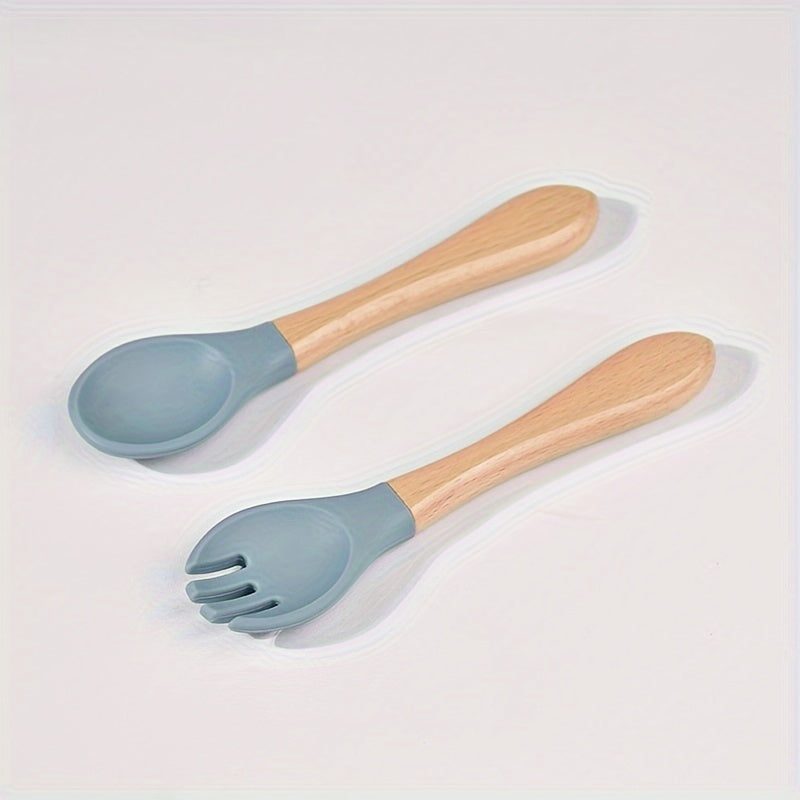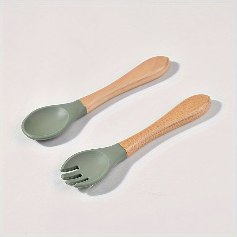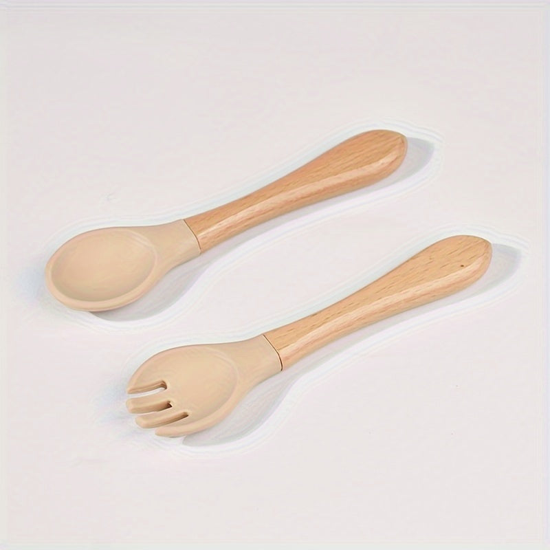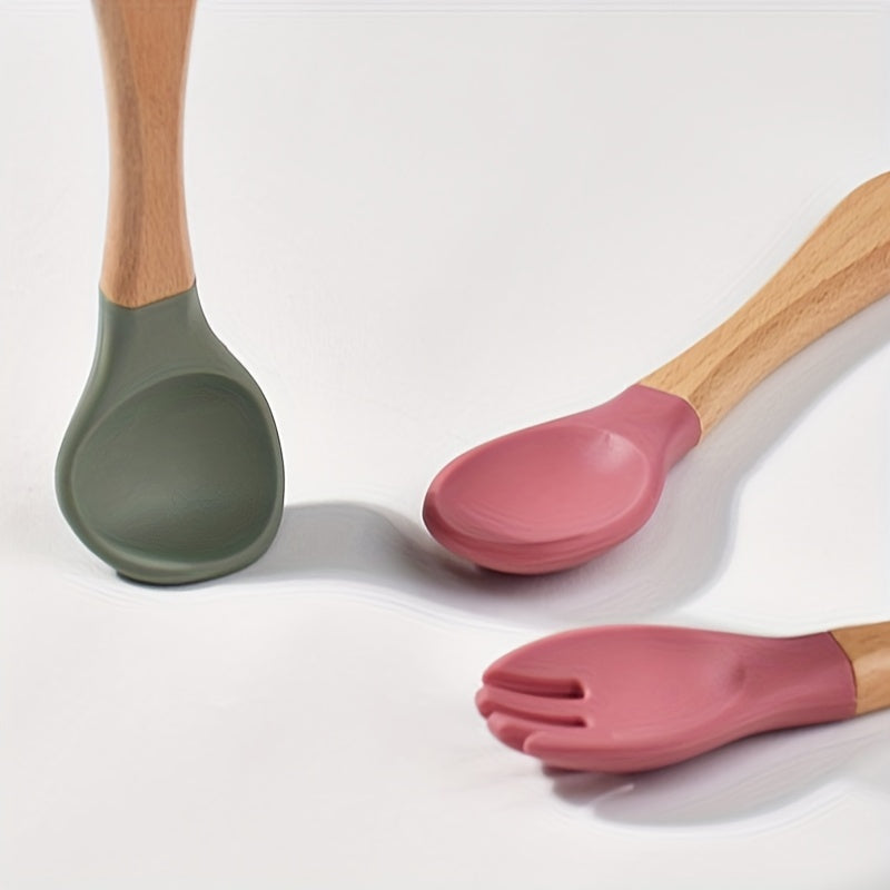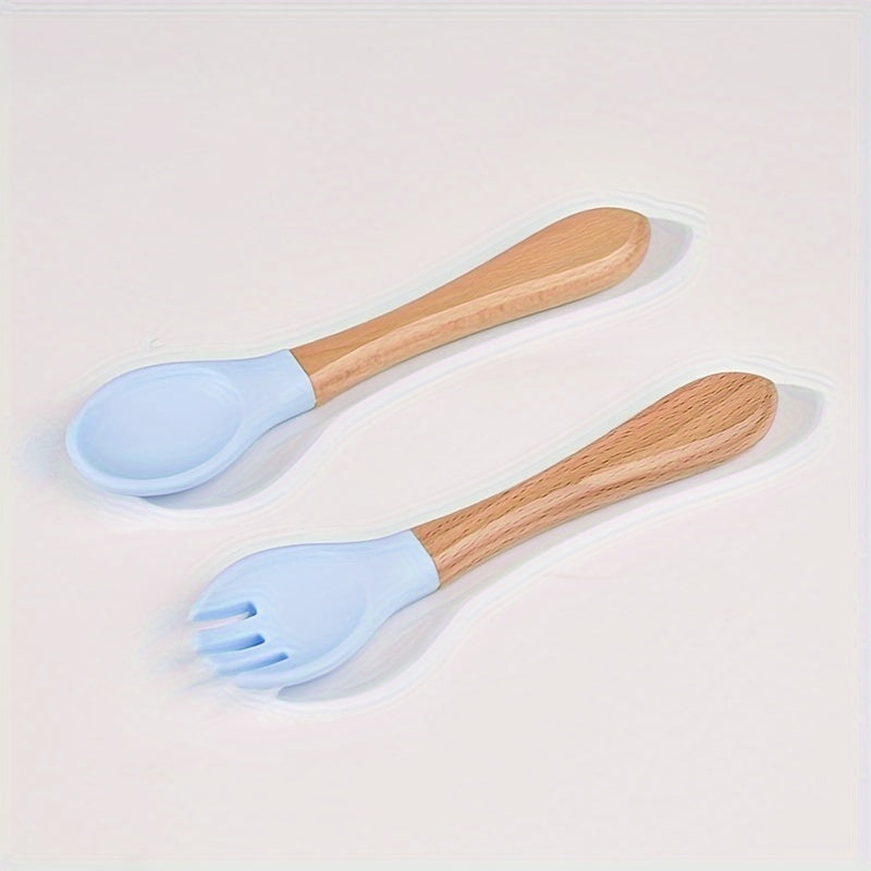 Силиконовая ложка пищевого качества с деревянной ручкой, набор вилки и ложки для обучения кормлению, включает 2 предмета столовой посуды, предназначенные для прикорма.