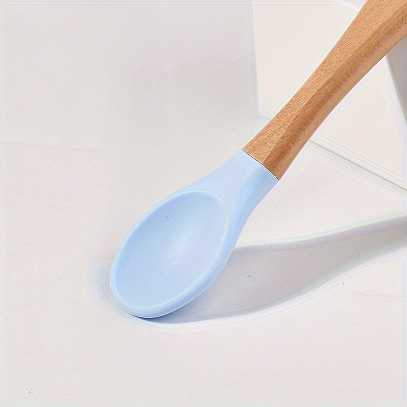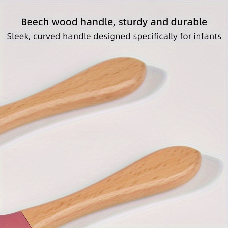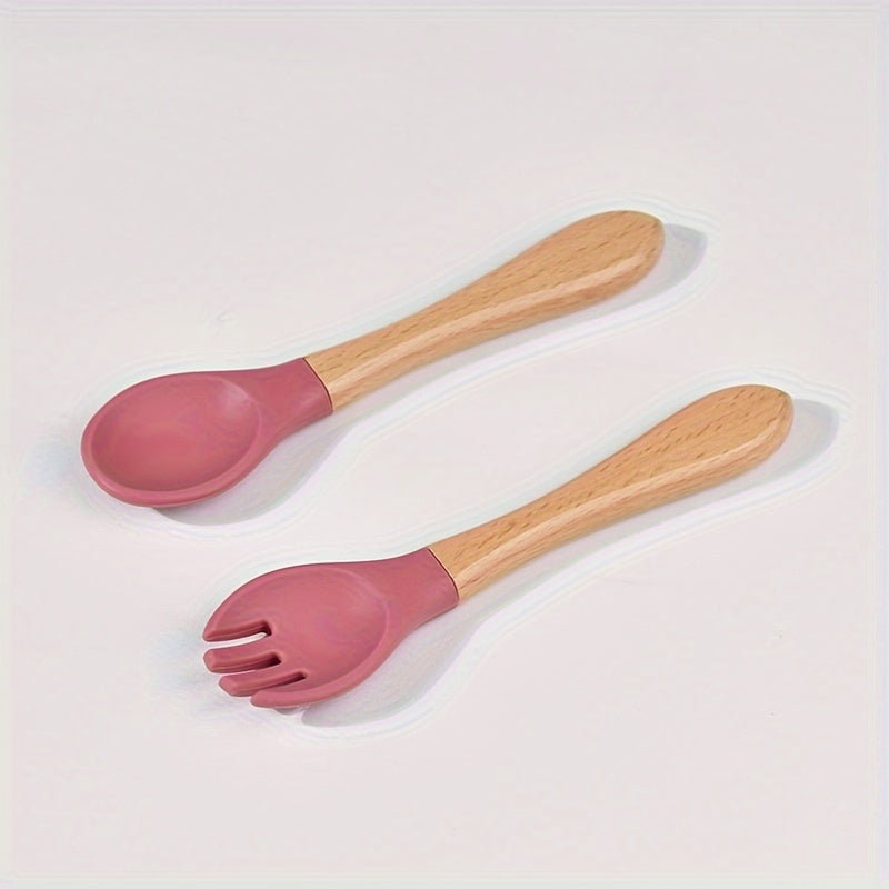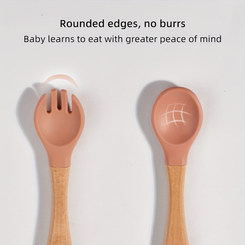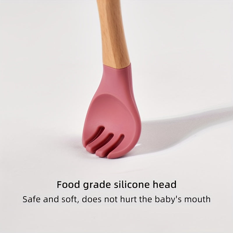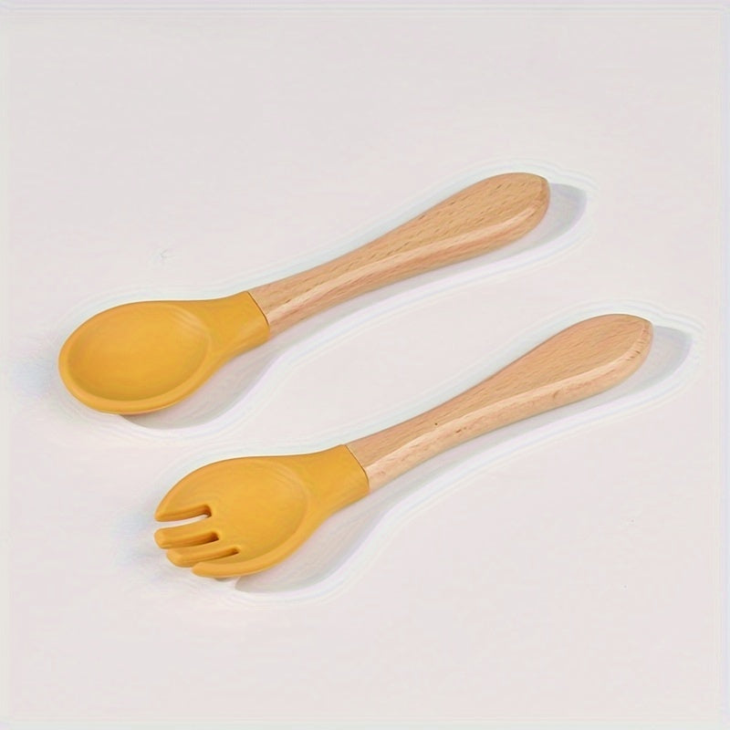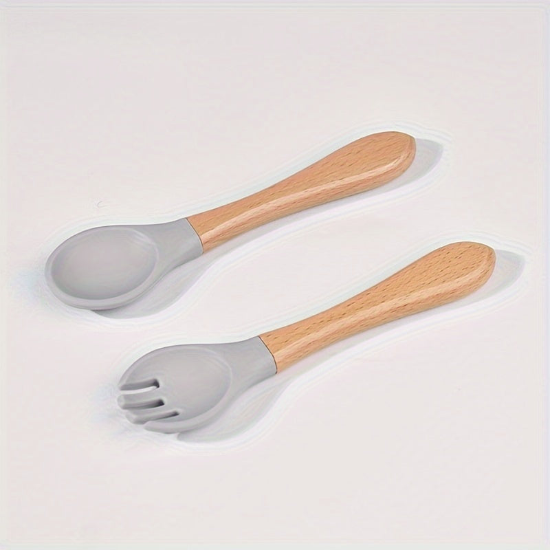 Силиконовая ложка пищевого качества с деревянной ручкой, набор вилки и ложки для обучения кормлению, включает 2 предмета столовой посуды, предназначенные для прикорма.