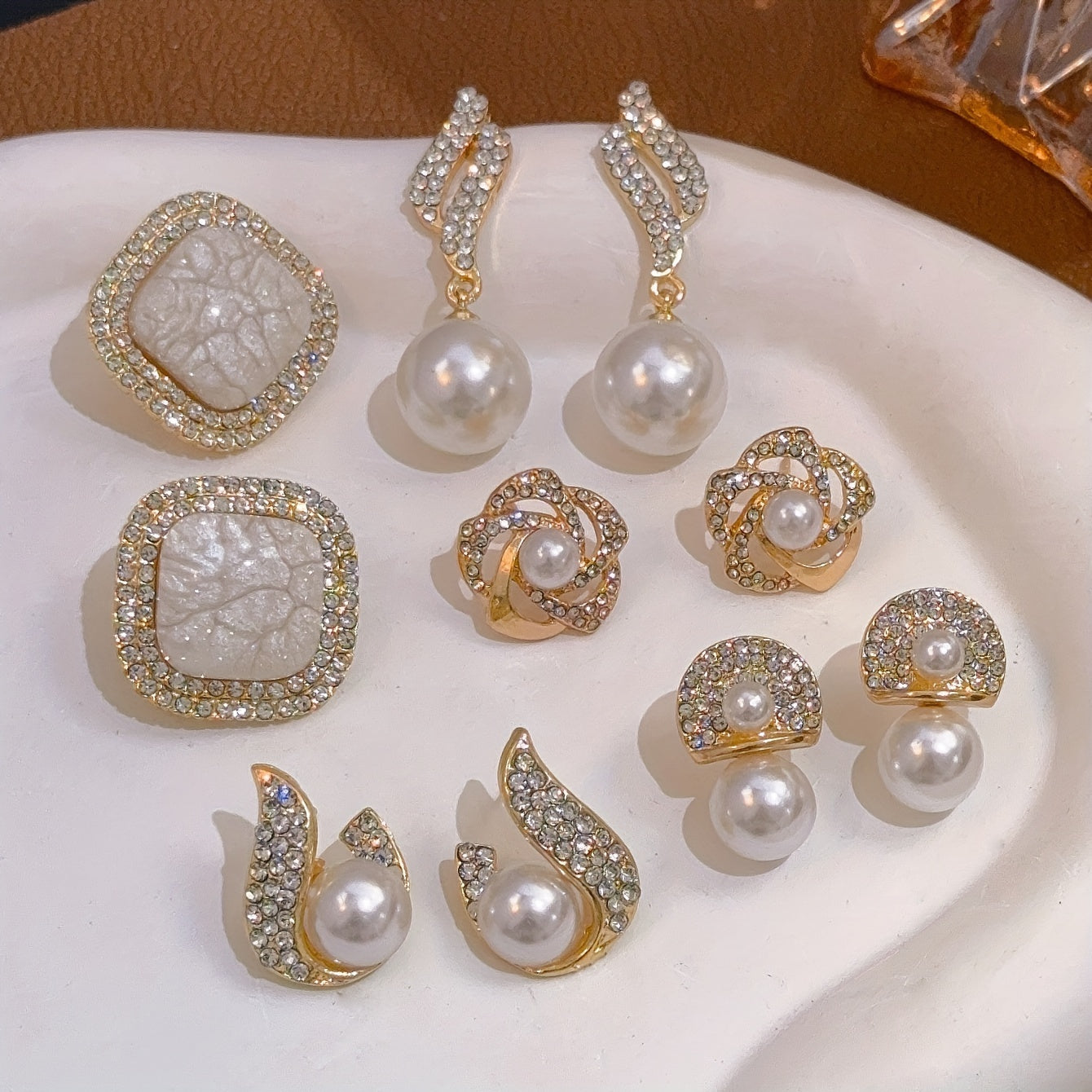 Сет сладких серег в французском стиле, украшенных роскошными искусственными жемчугом, цветочным узором с ледяными трещинами и огненным дизайном в элегантном винтажном стиле.