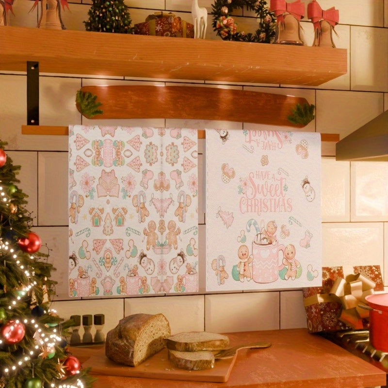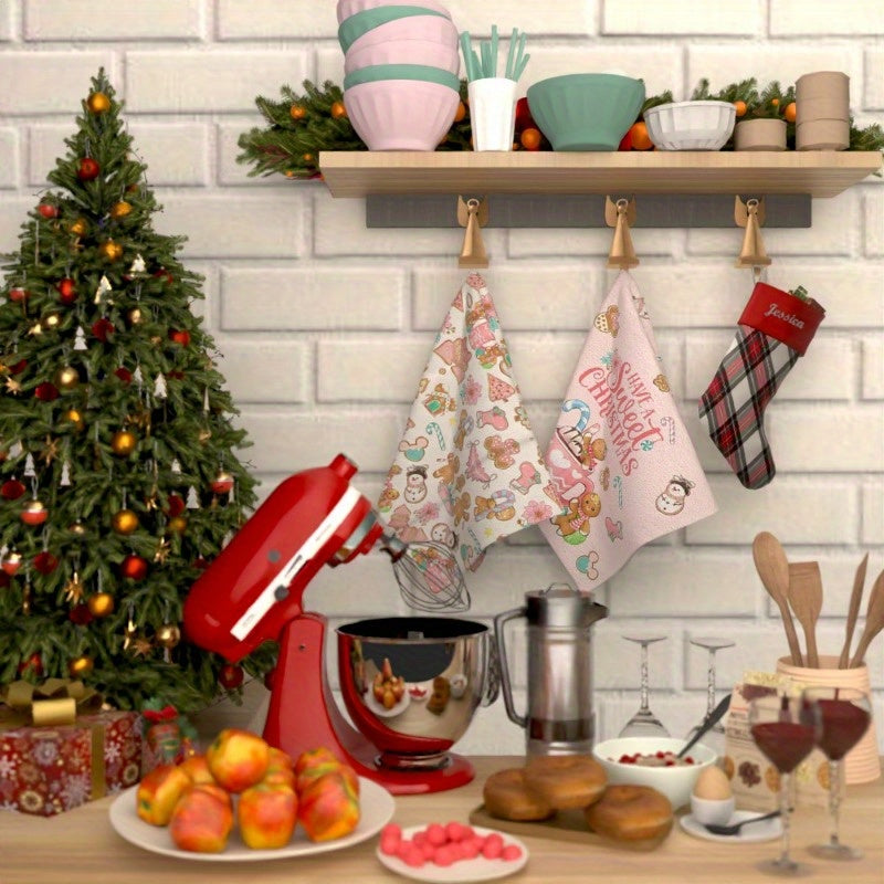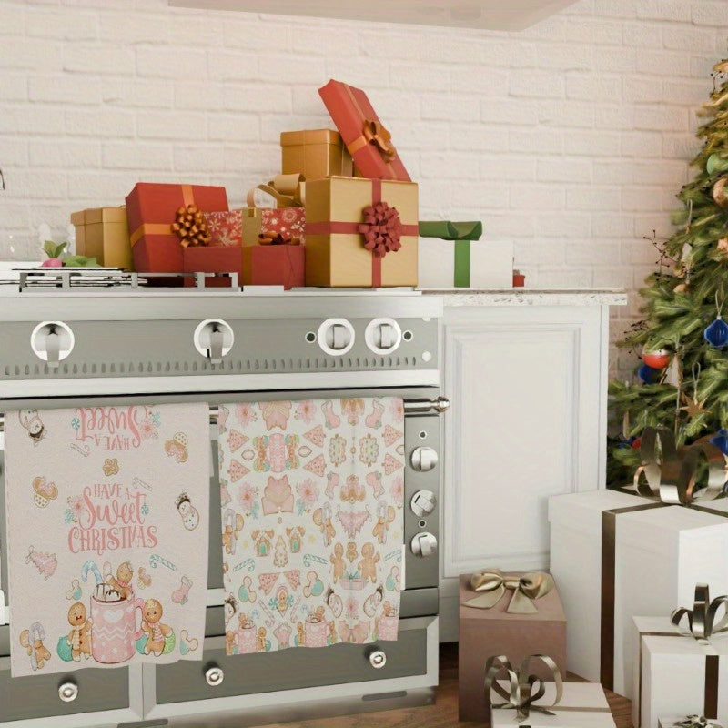 Получите два куска подарочных новогодних кухонных полотенец размером 18*26 дюймов с веселыми мотивами пряников и зимы для украшения кухни на Рождество.