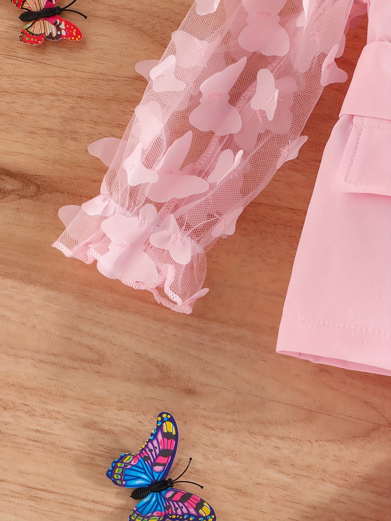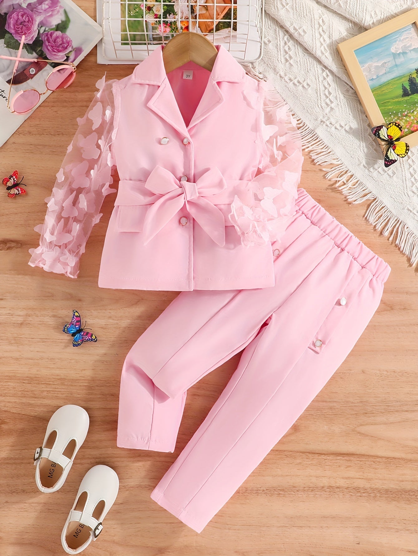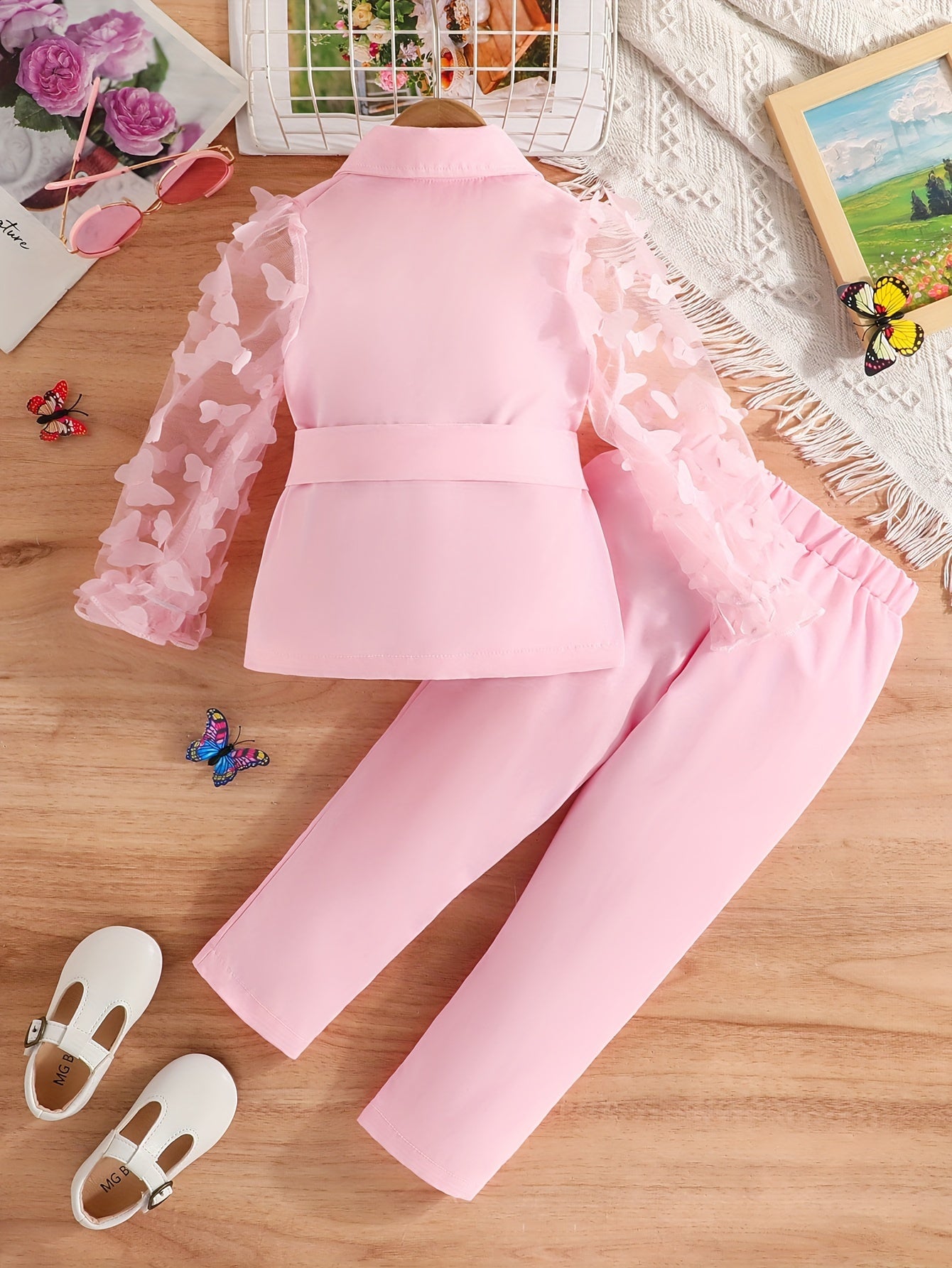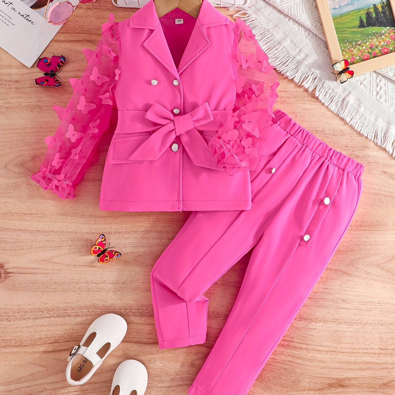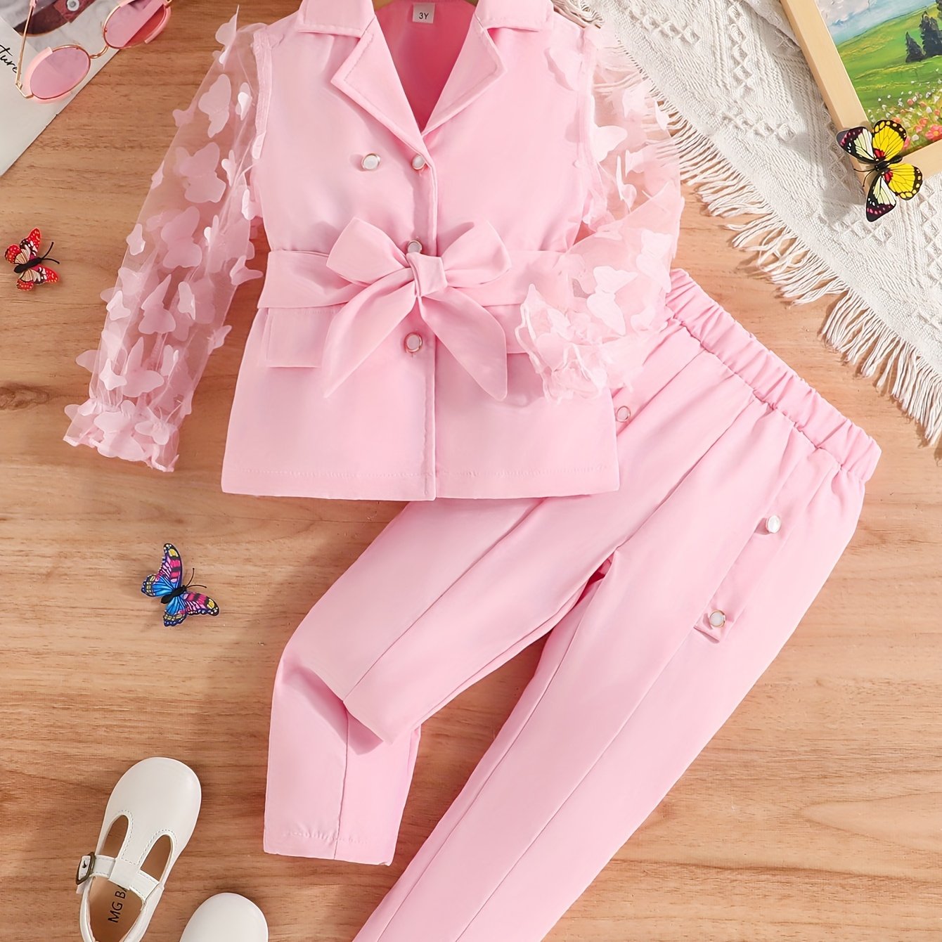 Девочкиный розовый пиджак-блейзер и штаны с бабочками и рюшей для всех сезонов