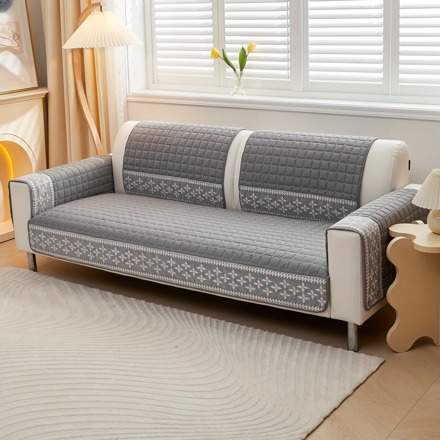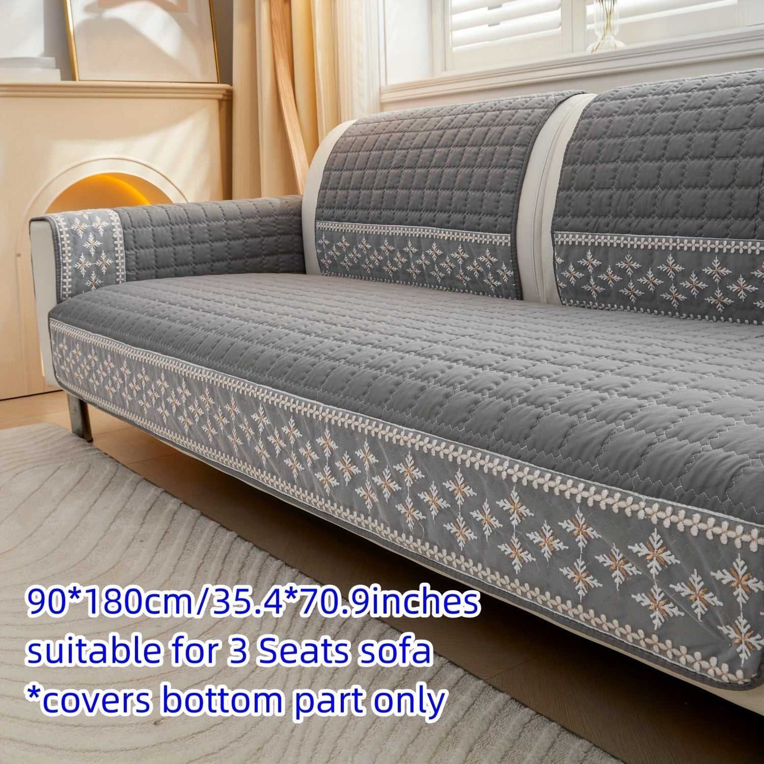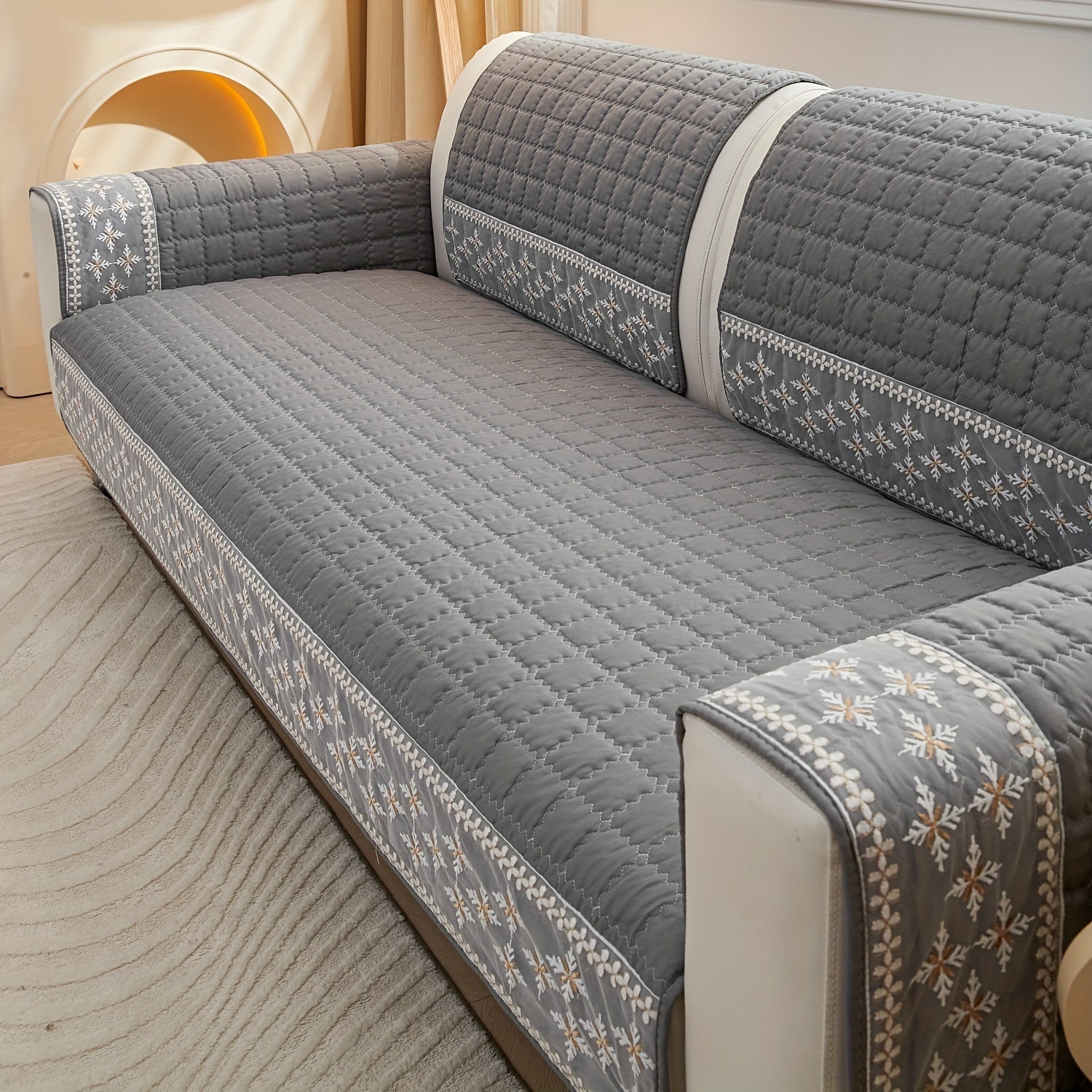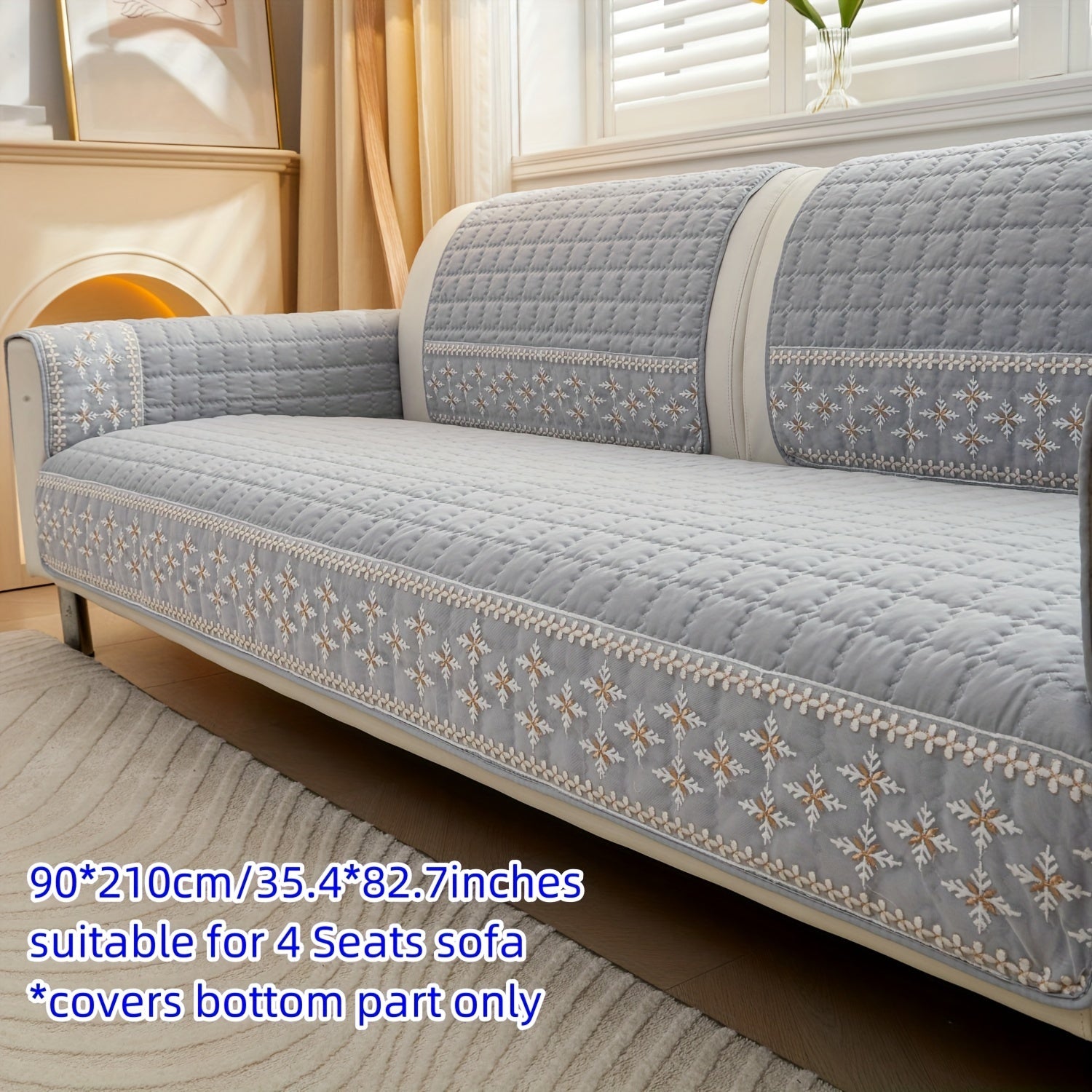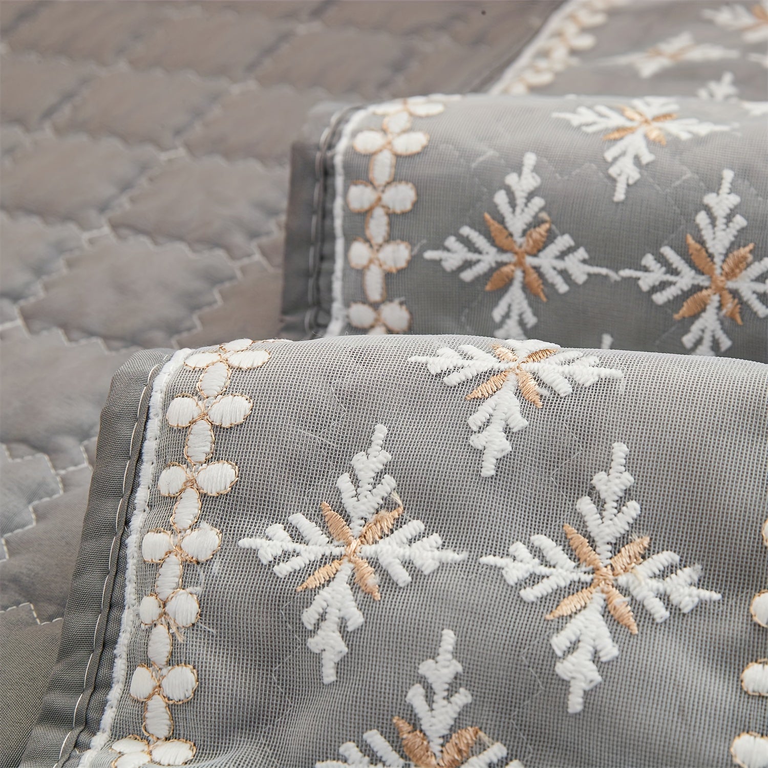 Серый бархатный чехол для дивана с вафельной текстурой и кружевными деталями, нескользящий и дружелюбный к домашним животным. Подходит для диванов на 1-4 места, можно стирать в машине.