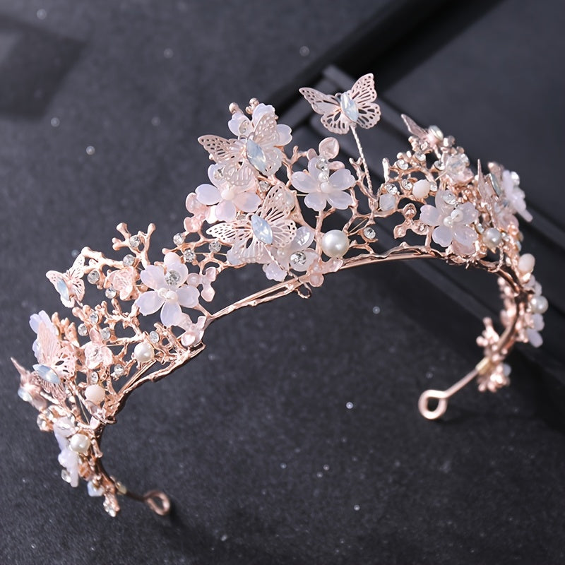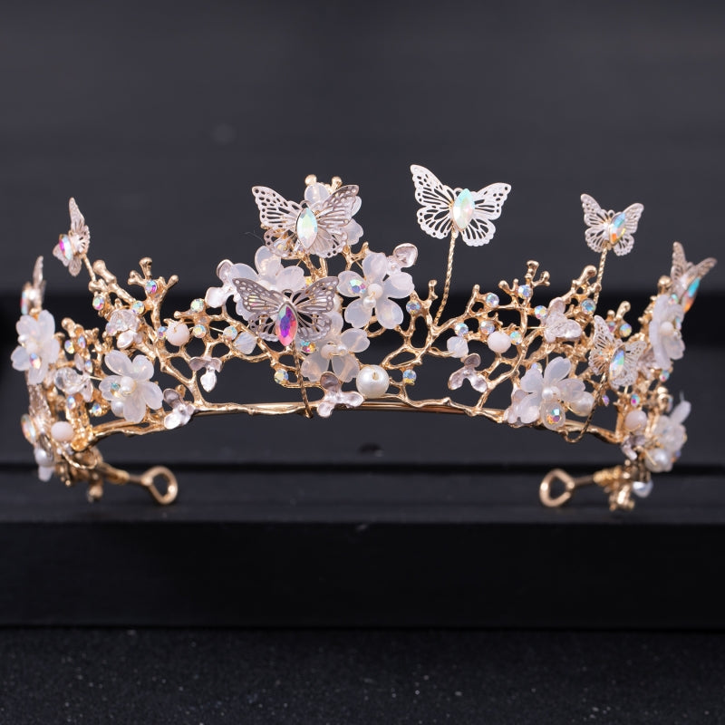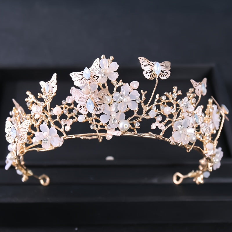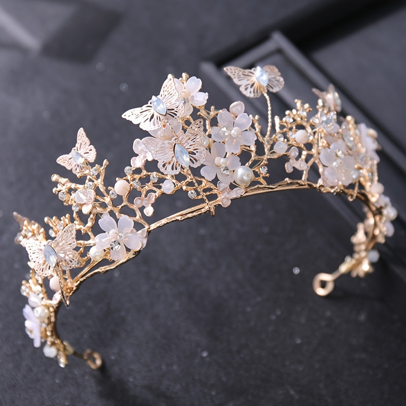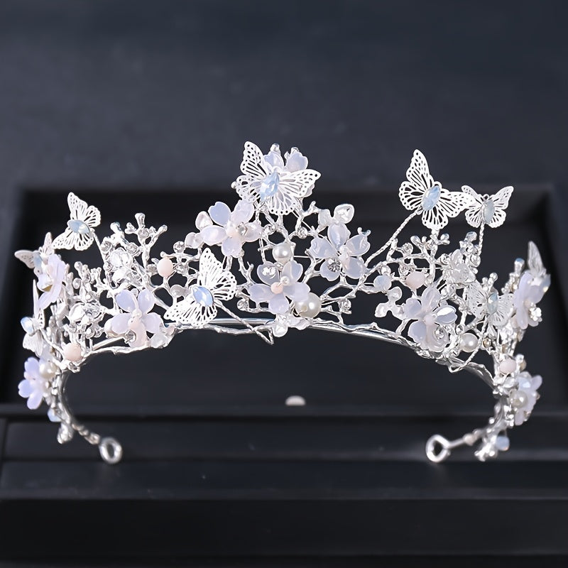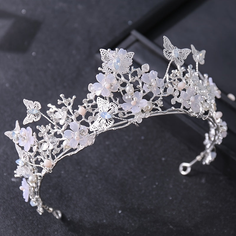Невестная цветочная корона с жемчугами, стразами и бабочкой, аксессуар для свадебных причесок