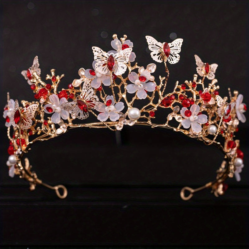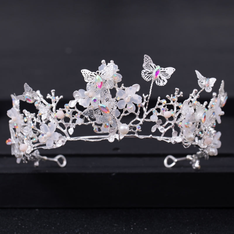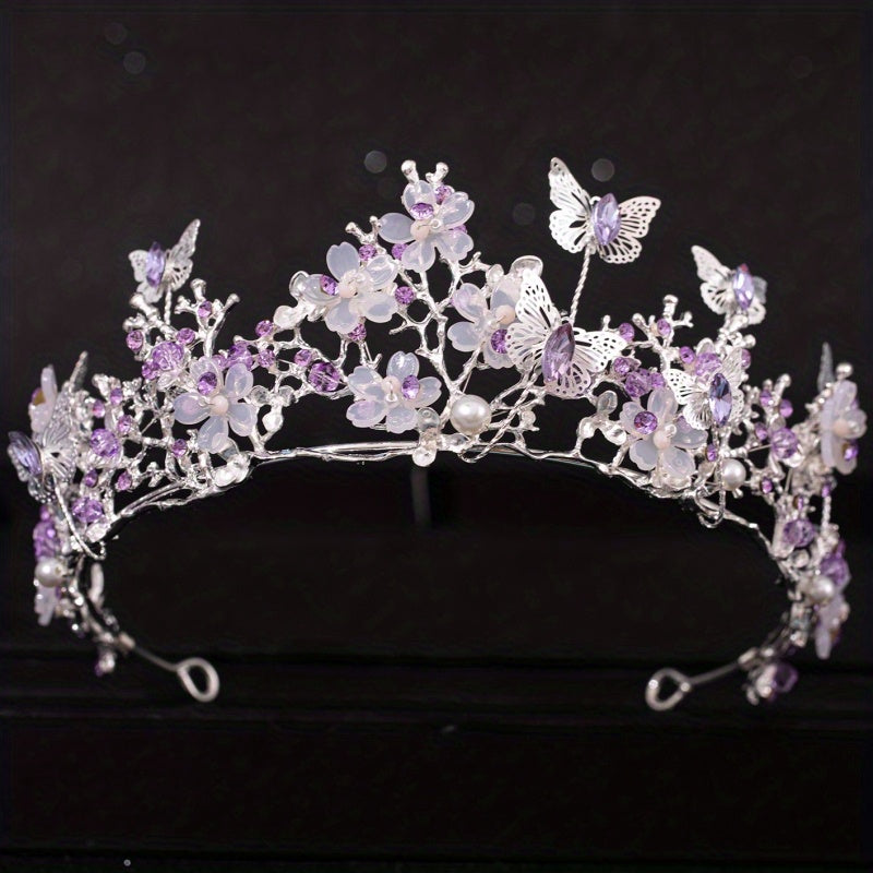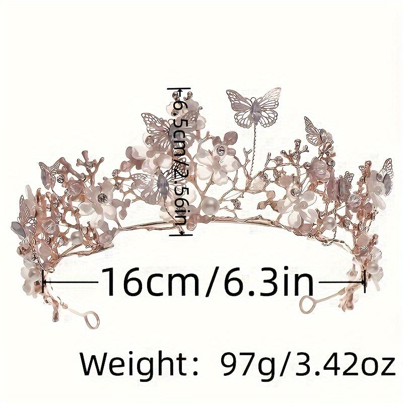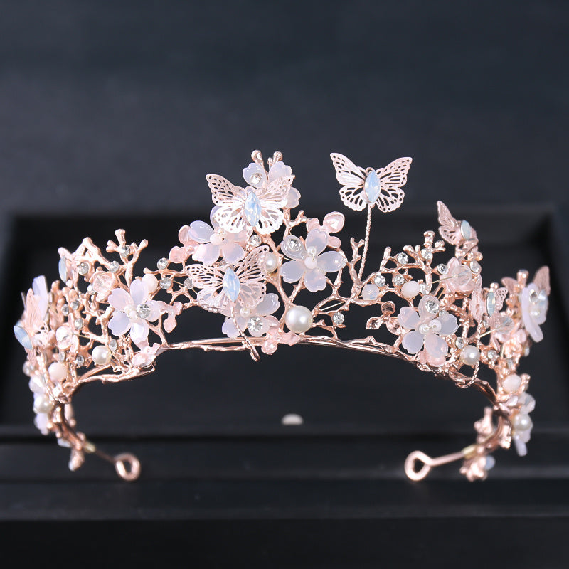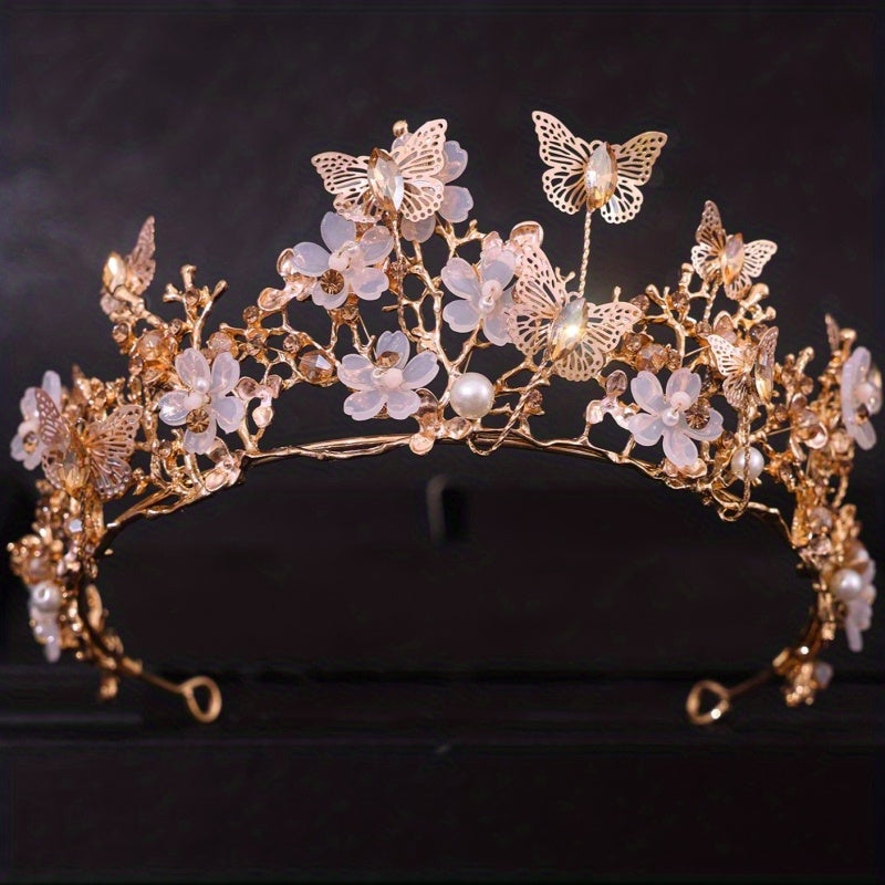 Невестная цветочная корона с жемчугами, стразами и бабочкой, аксессуар для свадебных причесок